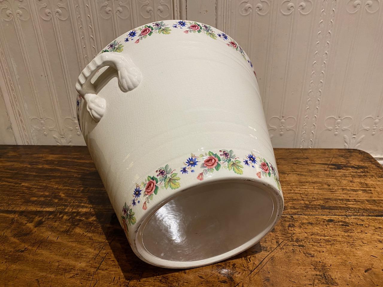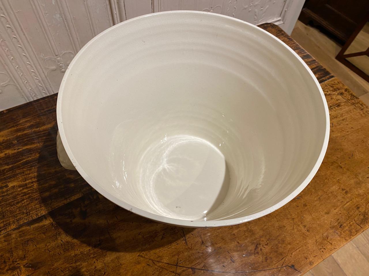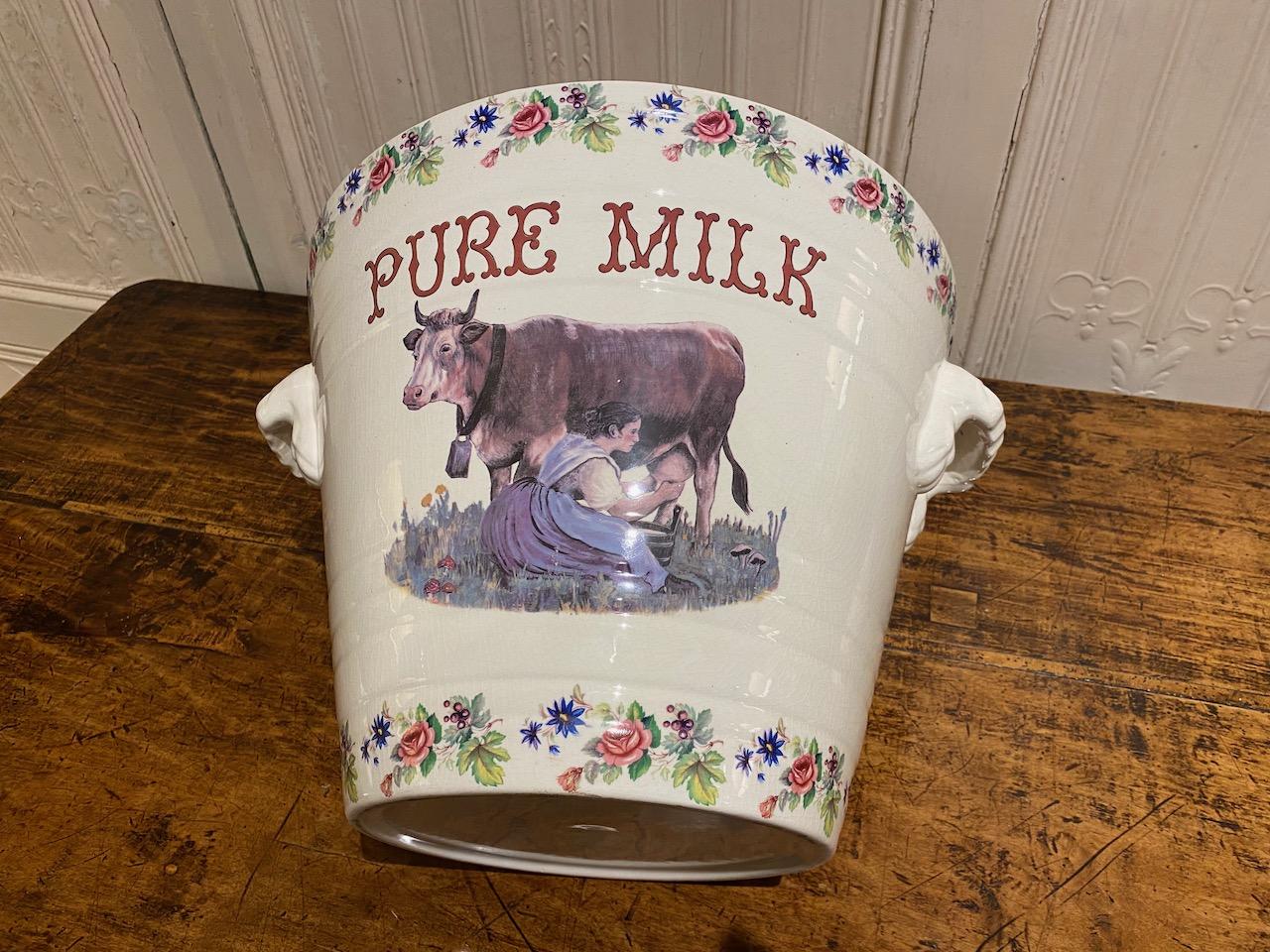 George V period Pure Milk Pale, in Staffordshire China, for use and display in a grocers shop. the hand thrown banded bowl with two carrying handles, and transfer decoration, with a picture of a girl milking a cow, titalled Pure Milk, and with floral borders. in perfect condition but no makers mark.