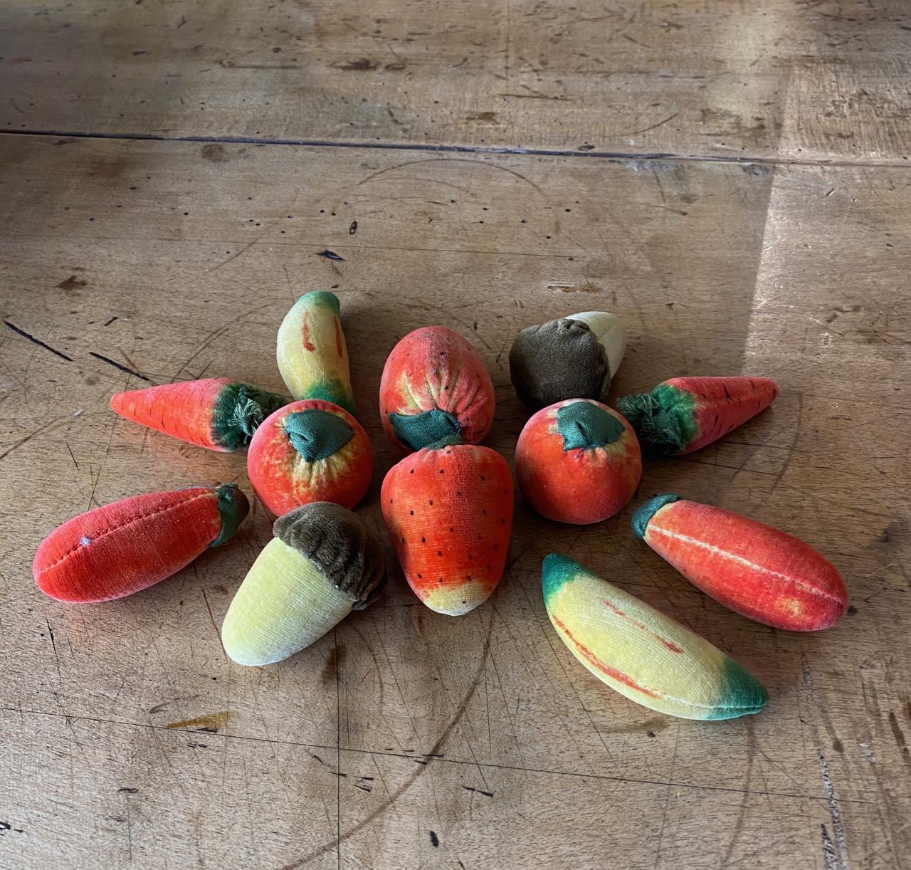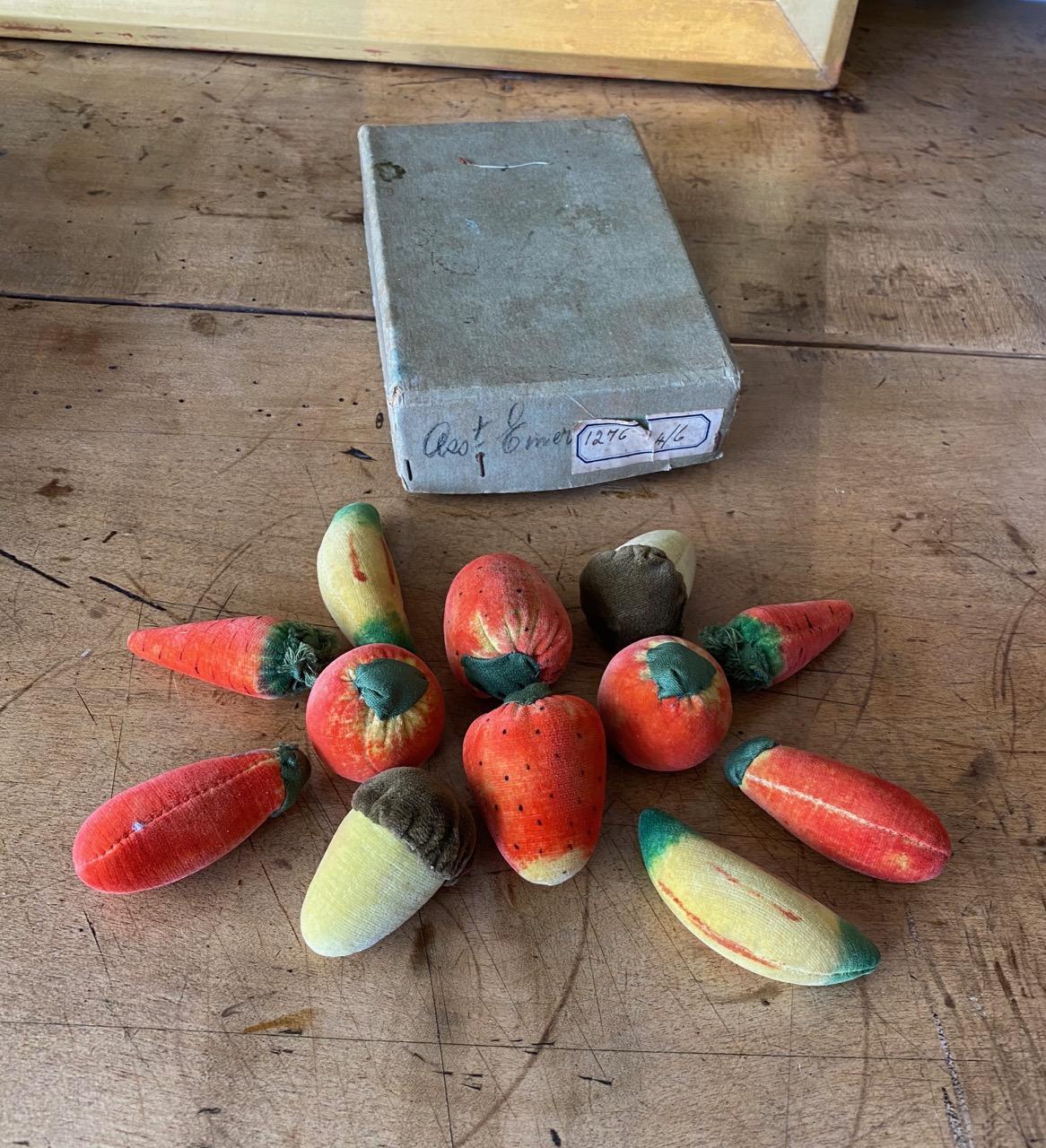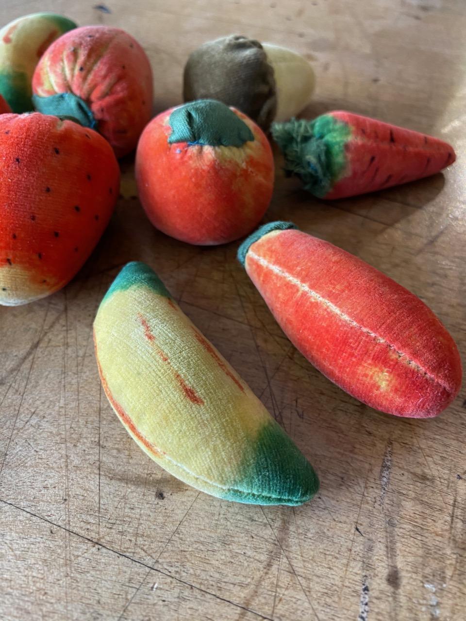 Hand Painted Velvet Pin Cushions in the form of fruit and vegetables, including two strawberries, two bananas, two acorns, two carrots, two oranges and two pears, stitched velvet with painted highlights and silk stems wrapped around a sand filling. unused and with there original box.