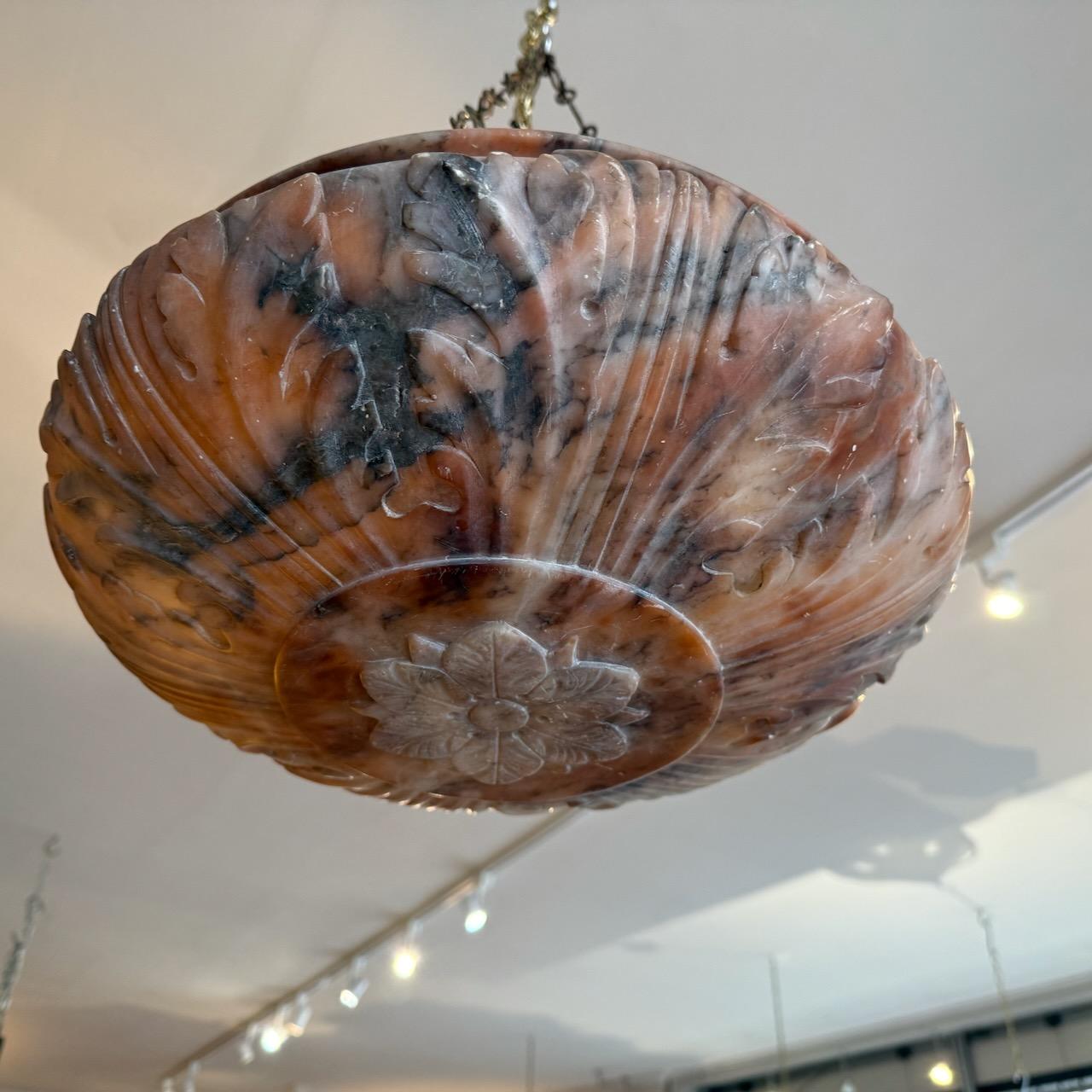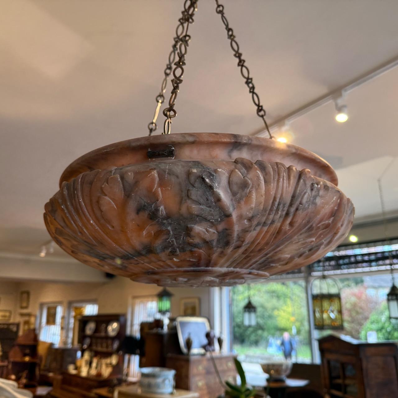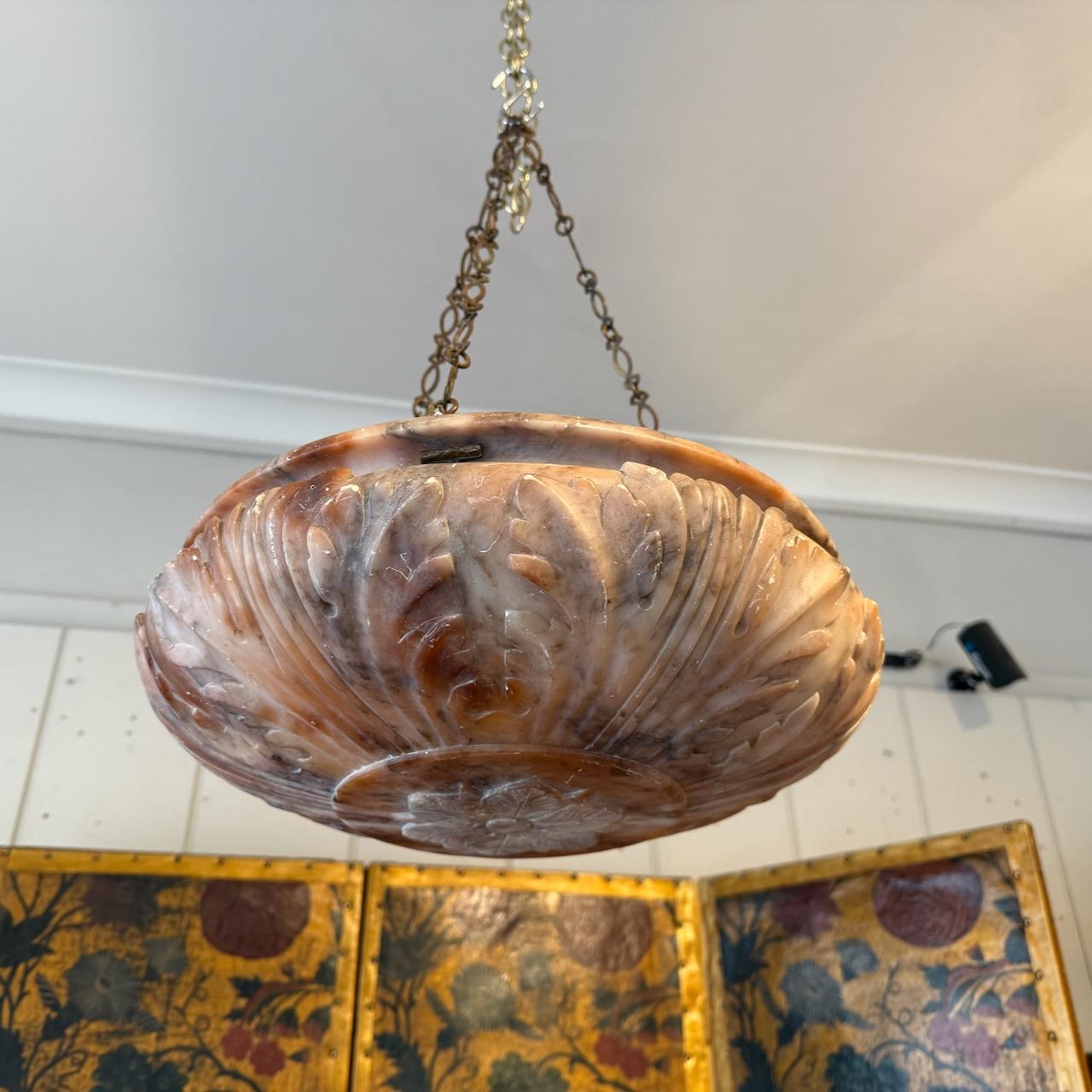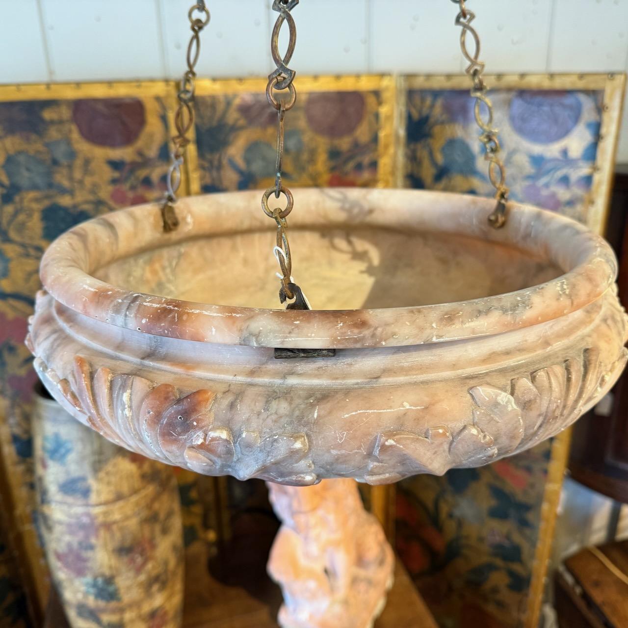 Alabaster Light Shade, of bowl form, turned and carved with acanthus leaves and hanging from three brass chains