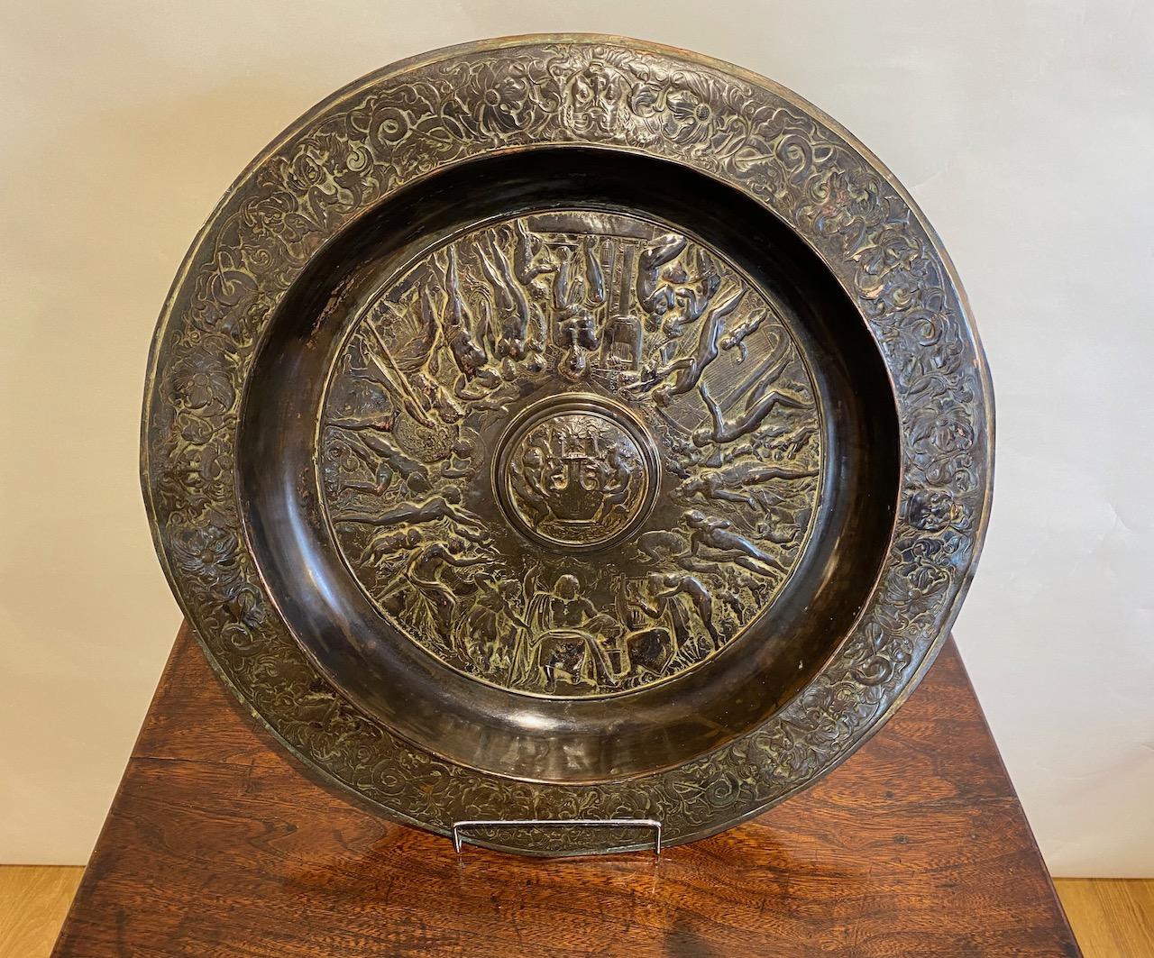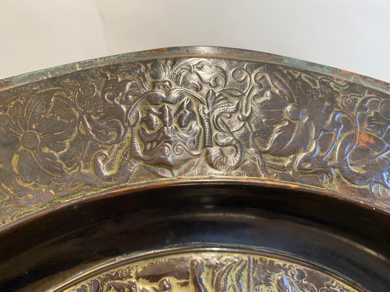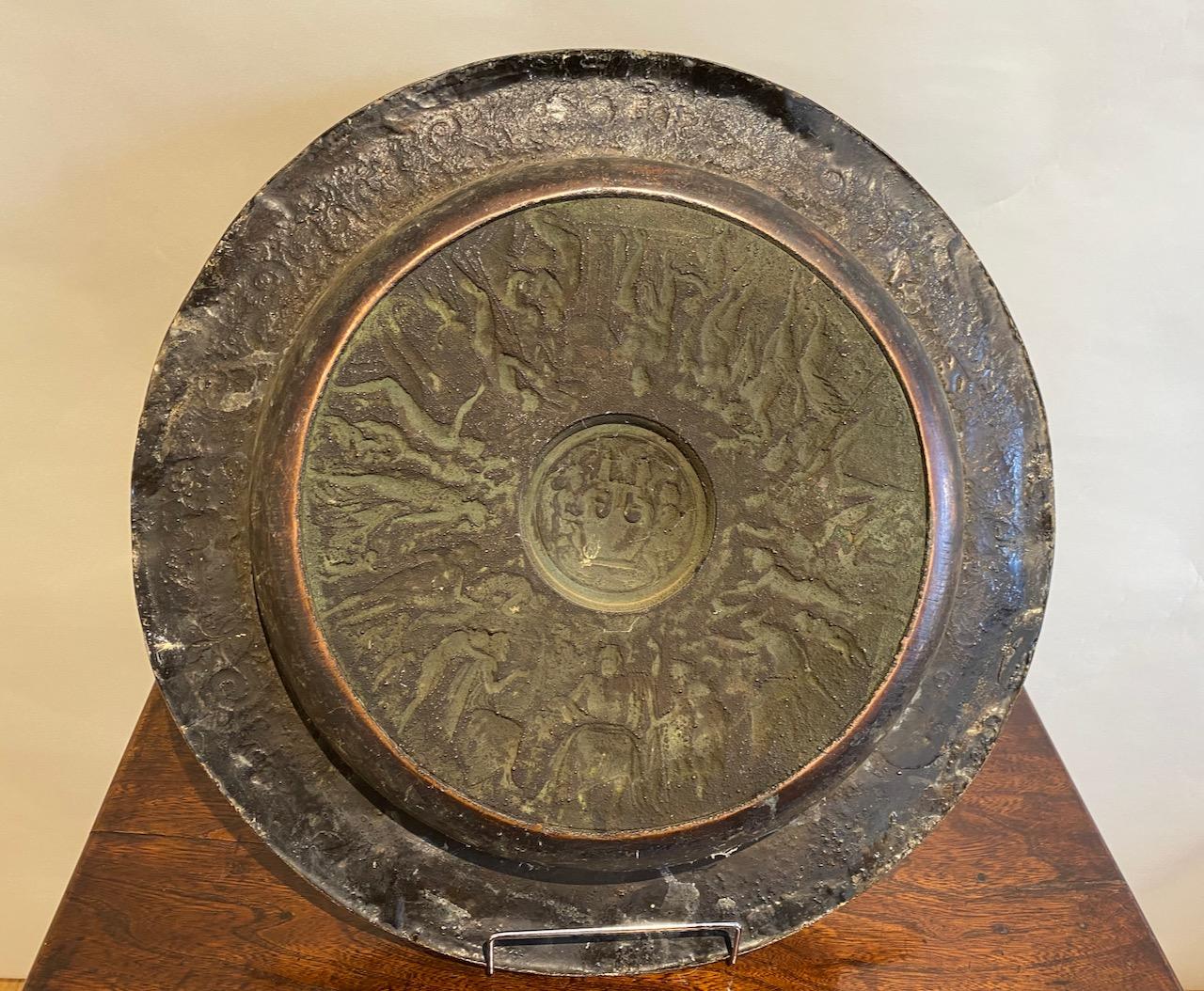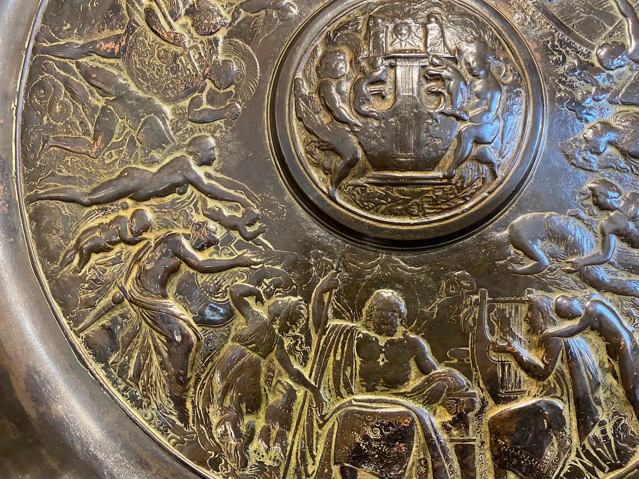 Neo-classical Charger, in cast patinated copper, decorated with allegorical scenes, the central boss and basin profusely decorated with figures deities,musicians, angels, and cherubs, the border also with masks, dragons and flora.