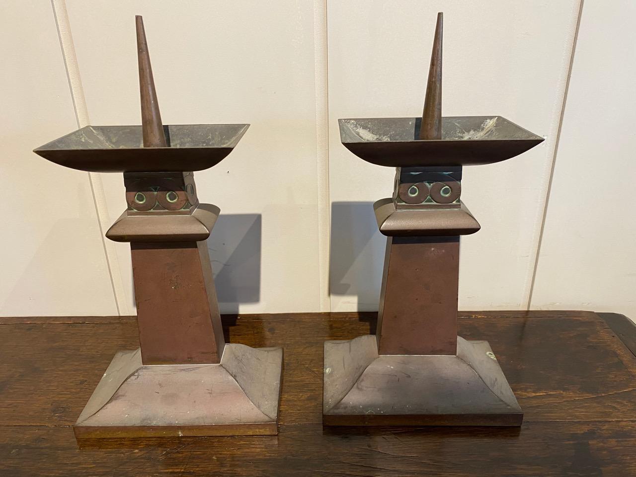 Pair of Arts and Crafts Pricket Sticks in patinated brass and of rectangular form, the pricket with square cup shaped tray above a collar with scroled ornament in turn supported by a tapering column on a cushion moulded plinth.