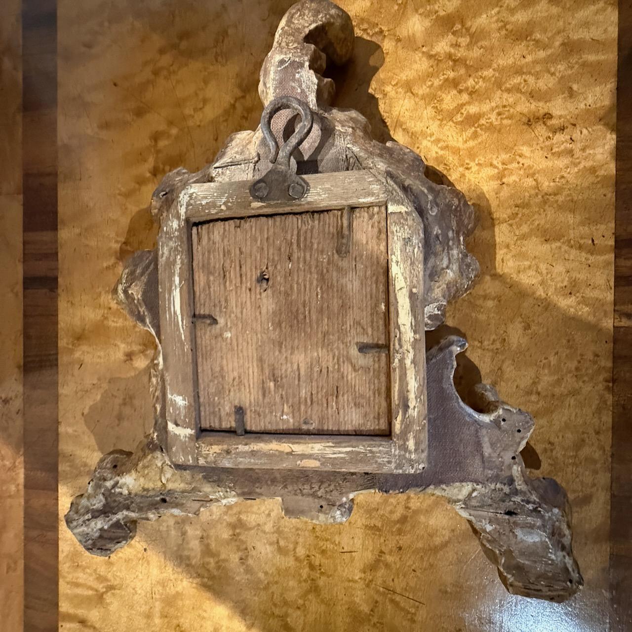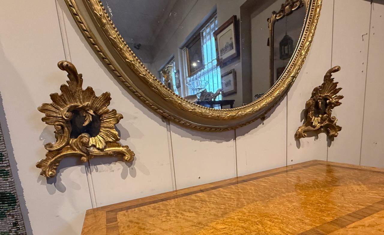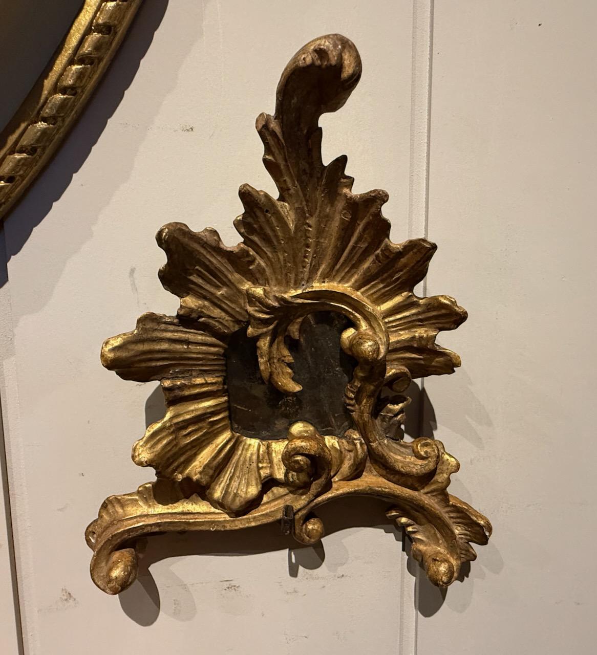 A Pair of Rococo Mini Mirrors or Girondoles, in carved and gilded pine of matched apposing elobrate foliate C scrole form, with remaining iron candle sconce holders and panelled backs.