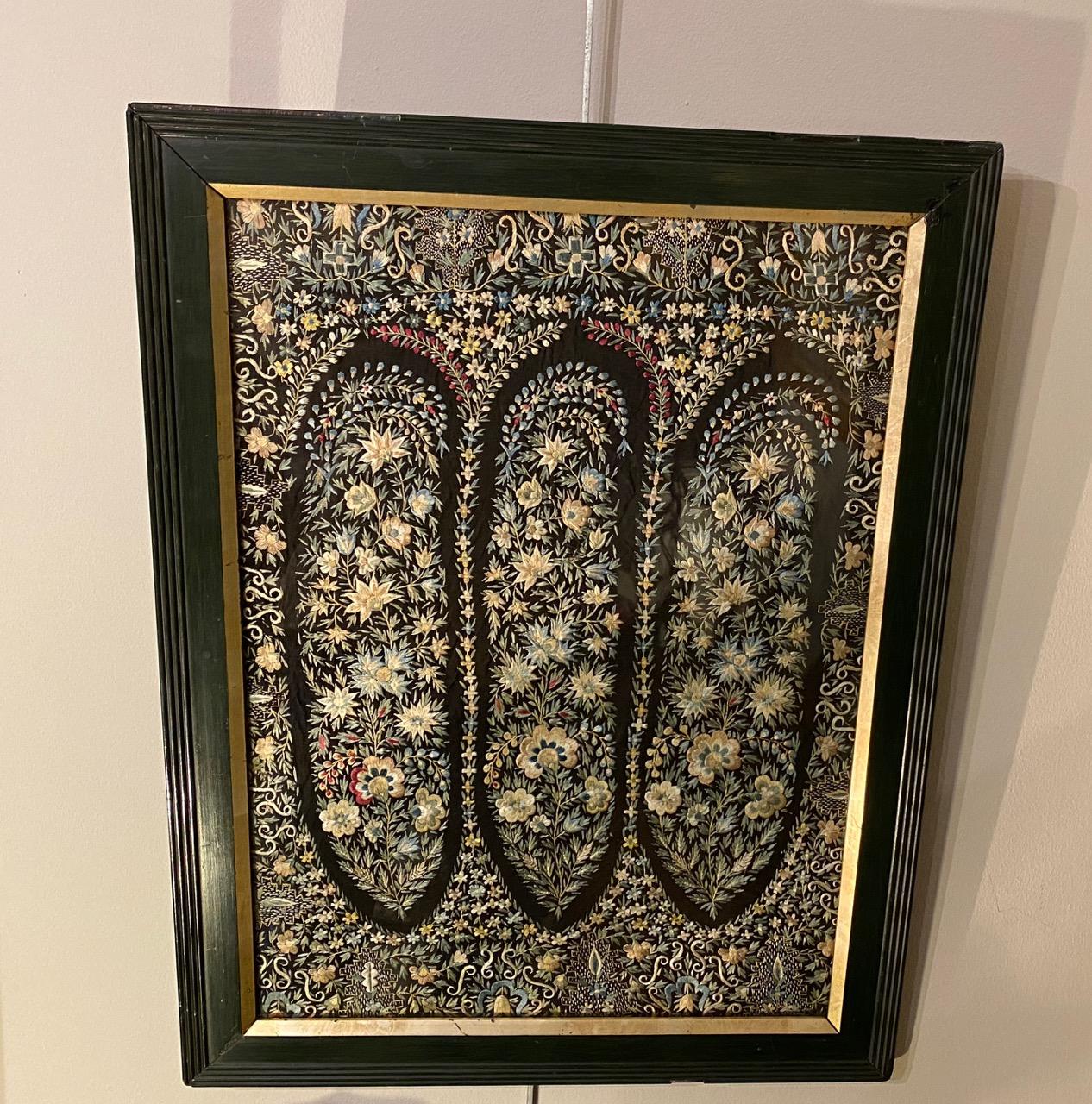 Pair of Victorian Needleworks, in silk on cotton, of Paisley design, the design of Indian origin, stitched with silks of many colours on a black ground. The silks are in the original dark green frames with gilt slips