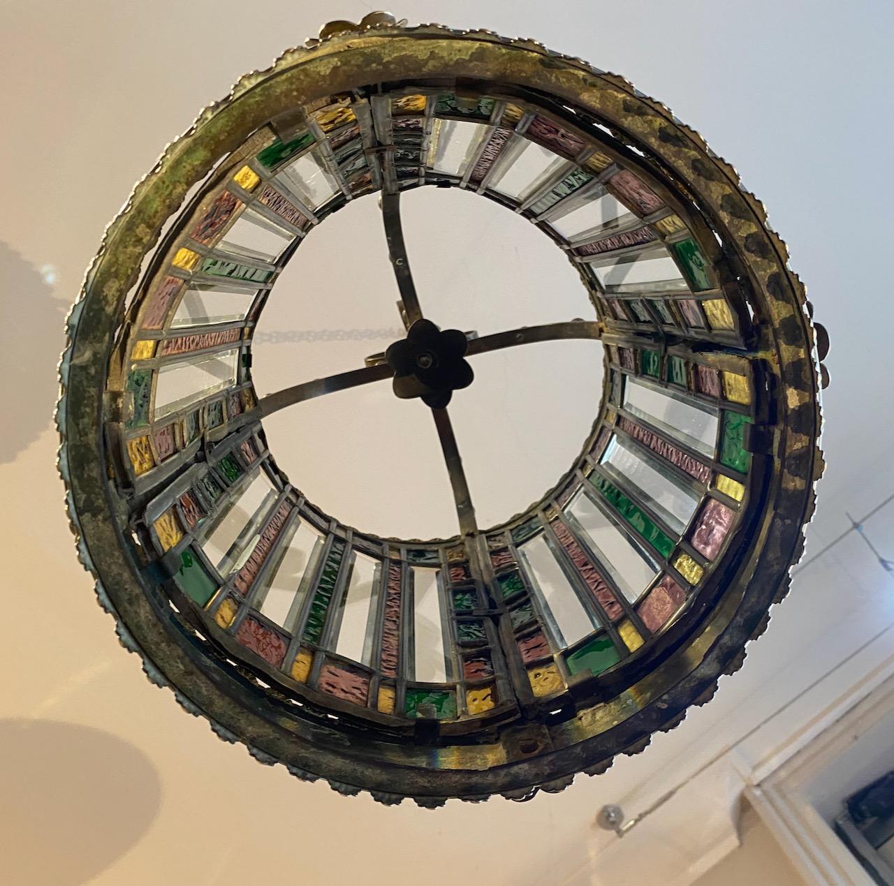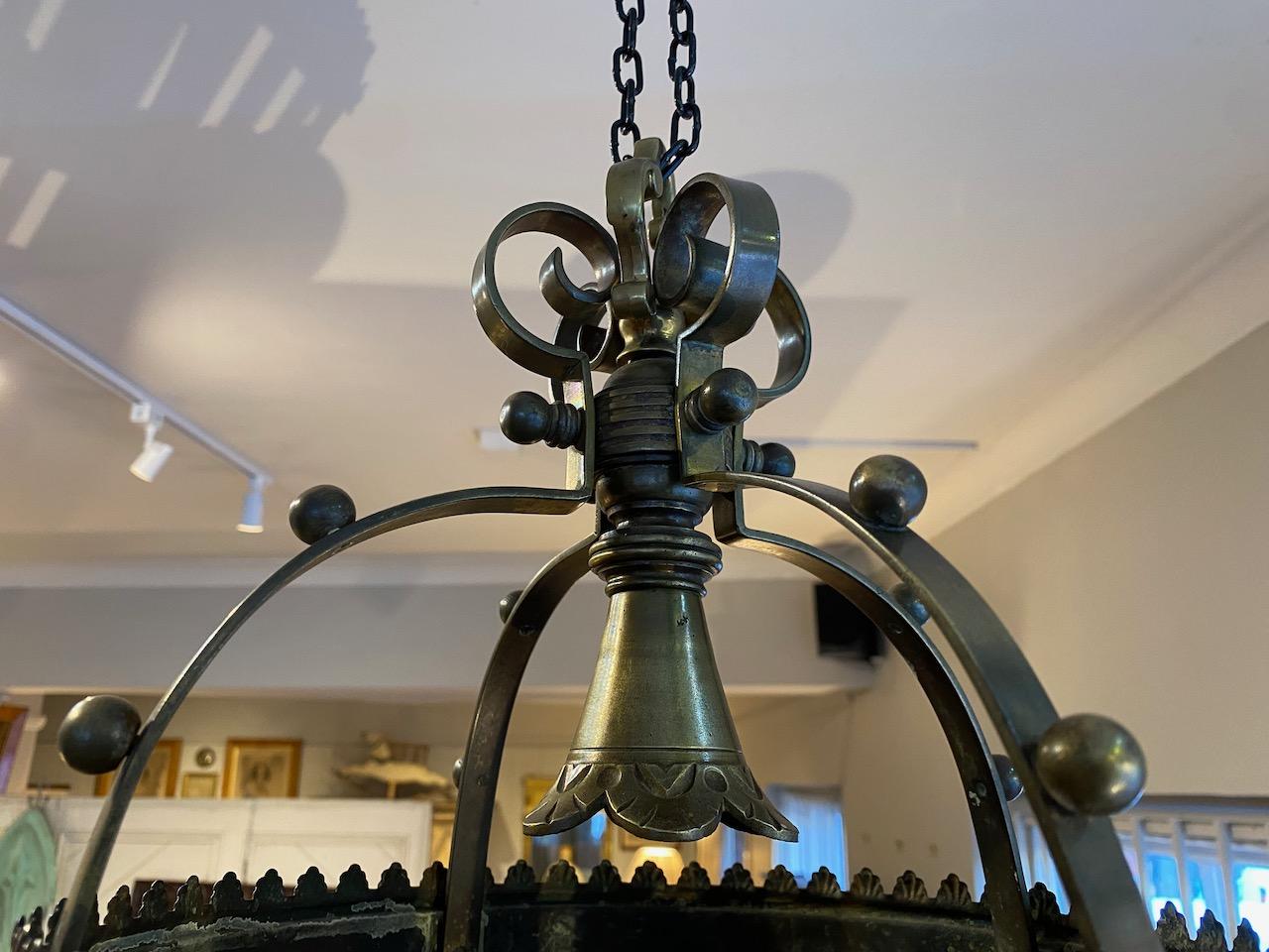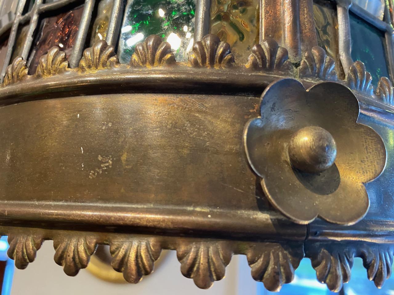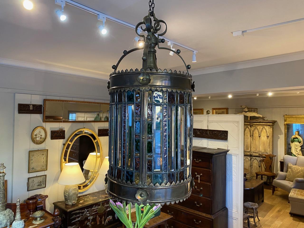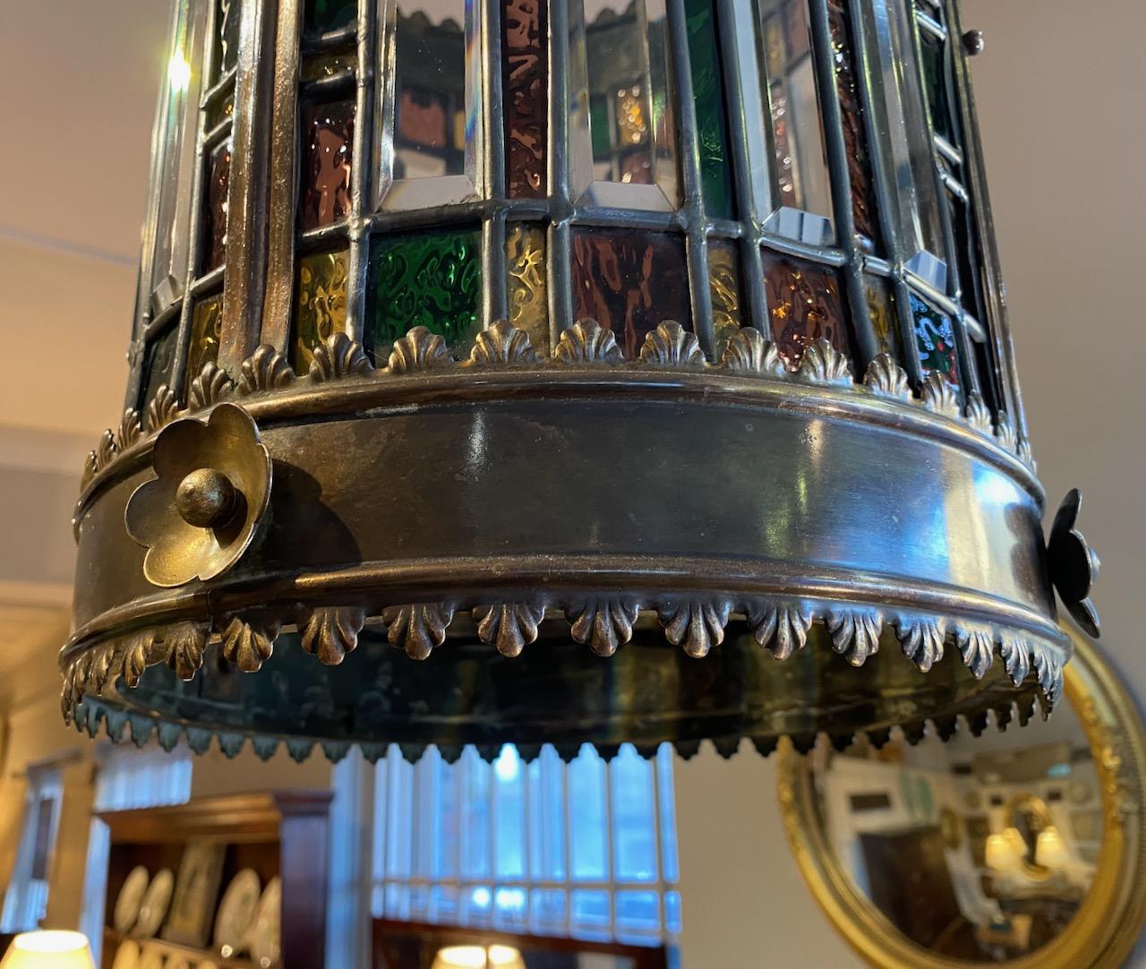 Victorian Hanging Lantern, of circular form, with wrought brass frame, with patera and frilled trim, glazed with leaded coloured glass and strips of bevelled clear glass, the lantern with cruciform arched scroled and studded carriage and central pendent light socket.