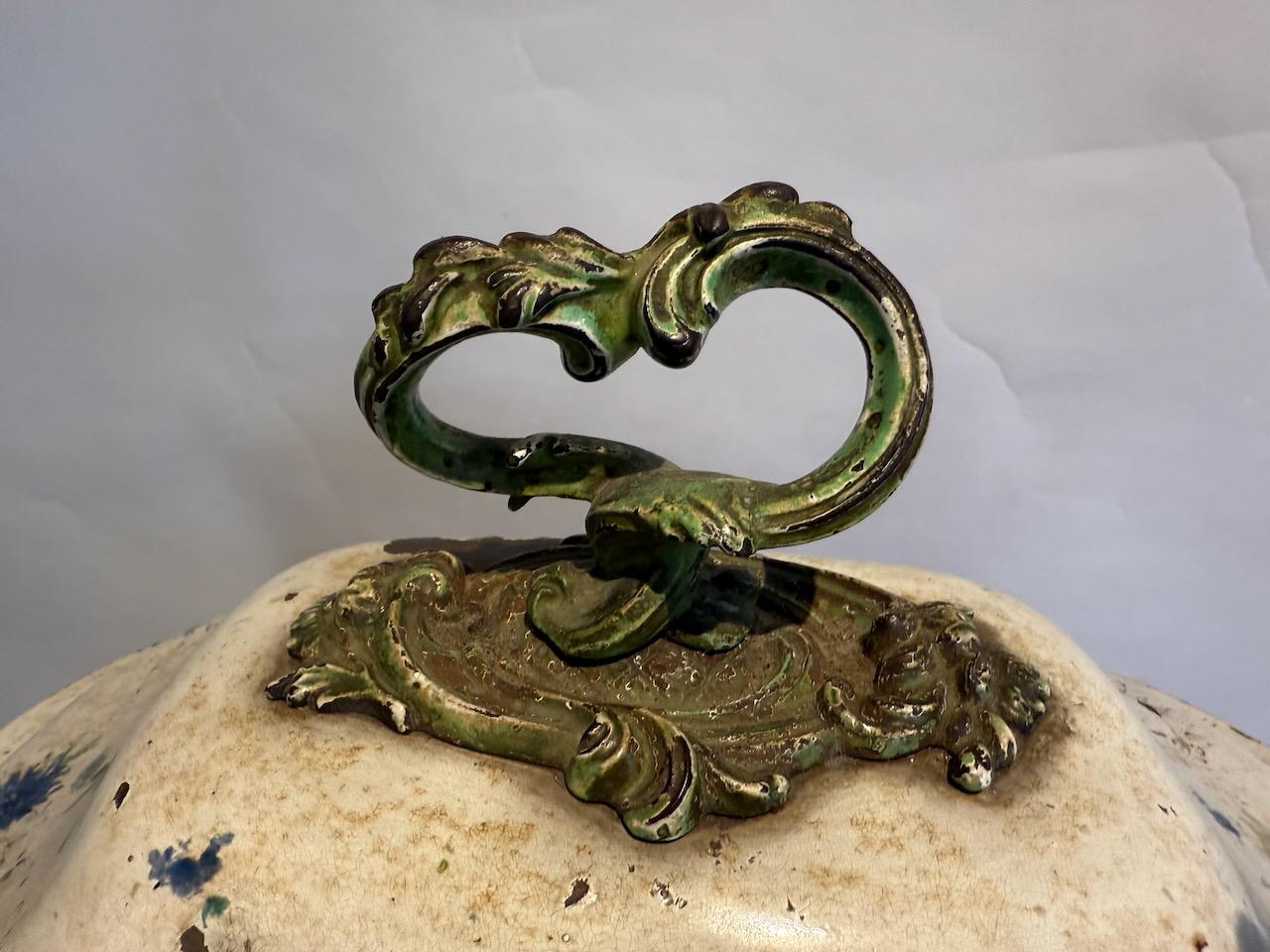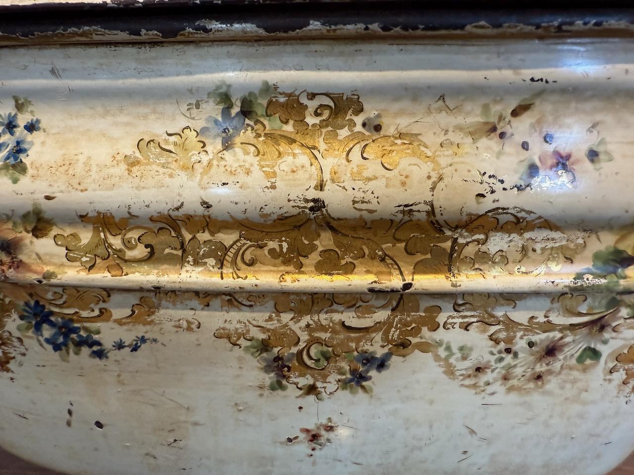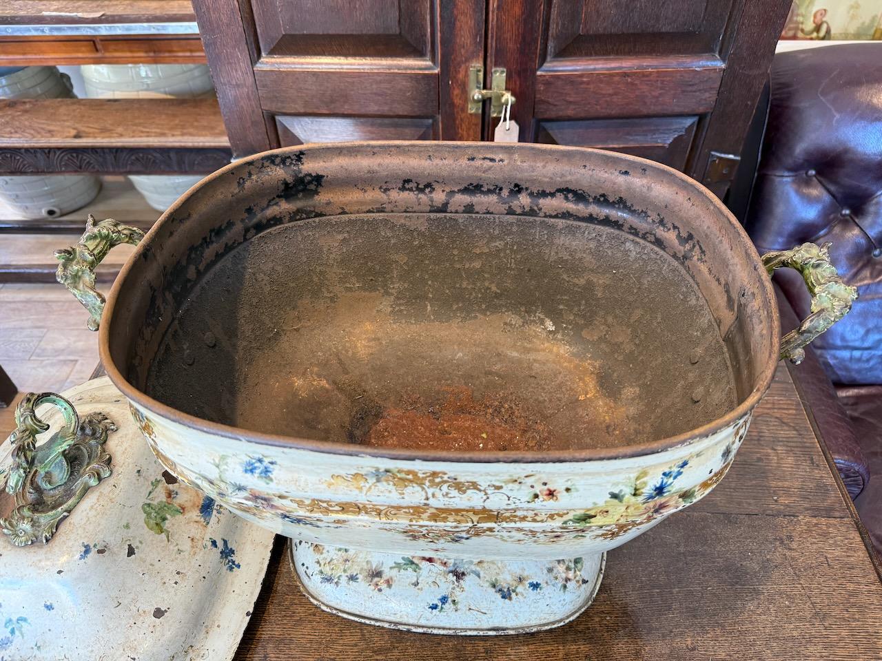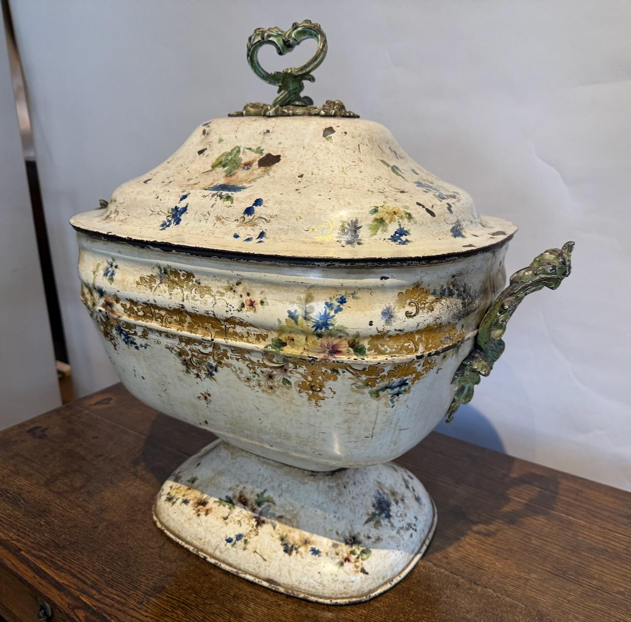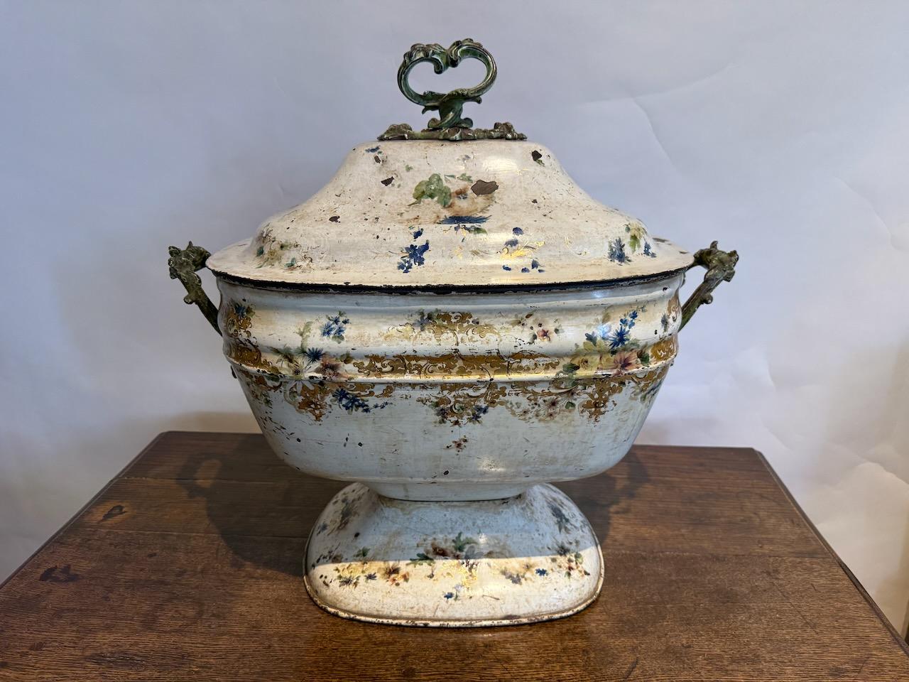 Victorian Coal Skuttle or Purdonium, in painted tole, possibly made in Pontypool in the form of a giant tureen with gilded and floral decoration on a white ground, with cast iron carrying handles of a rococo design.