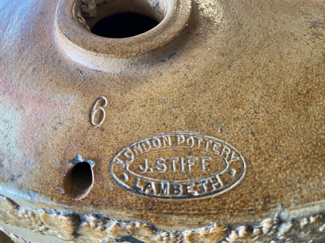 Pair of Victorian Spirit Barrels, in salt glazed stoneware, of oval barrel shape, with tap holes, the top and bottom decorated with vine leaf borders and with two further bands of vine leaves around the middle part. Traces of painted decoration and one is marked "Cloves"