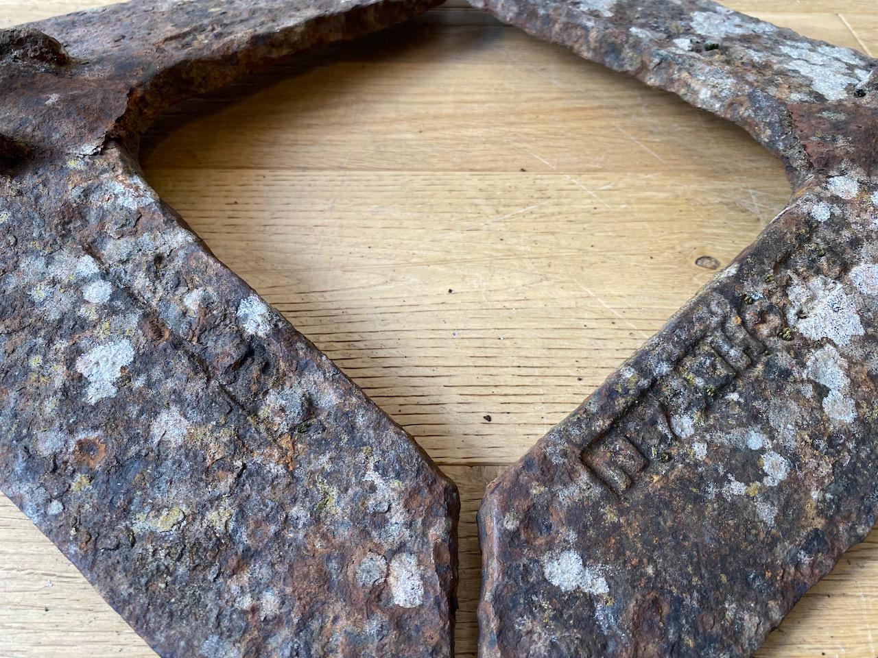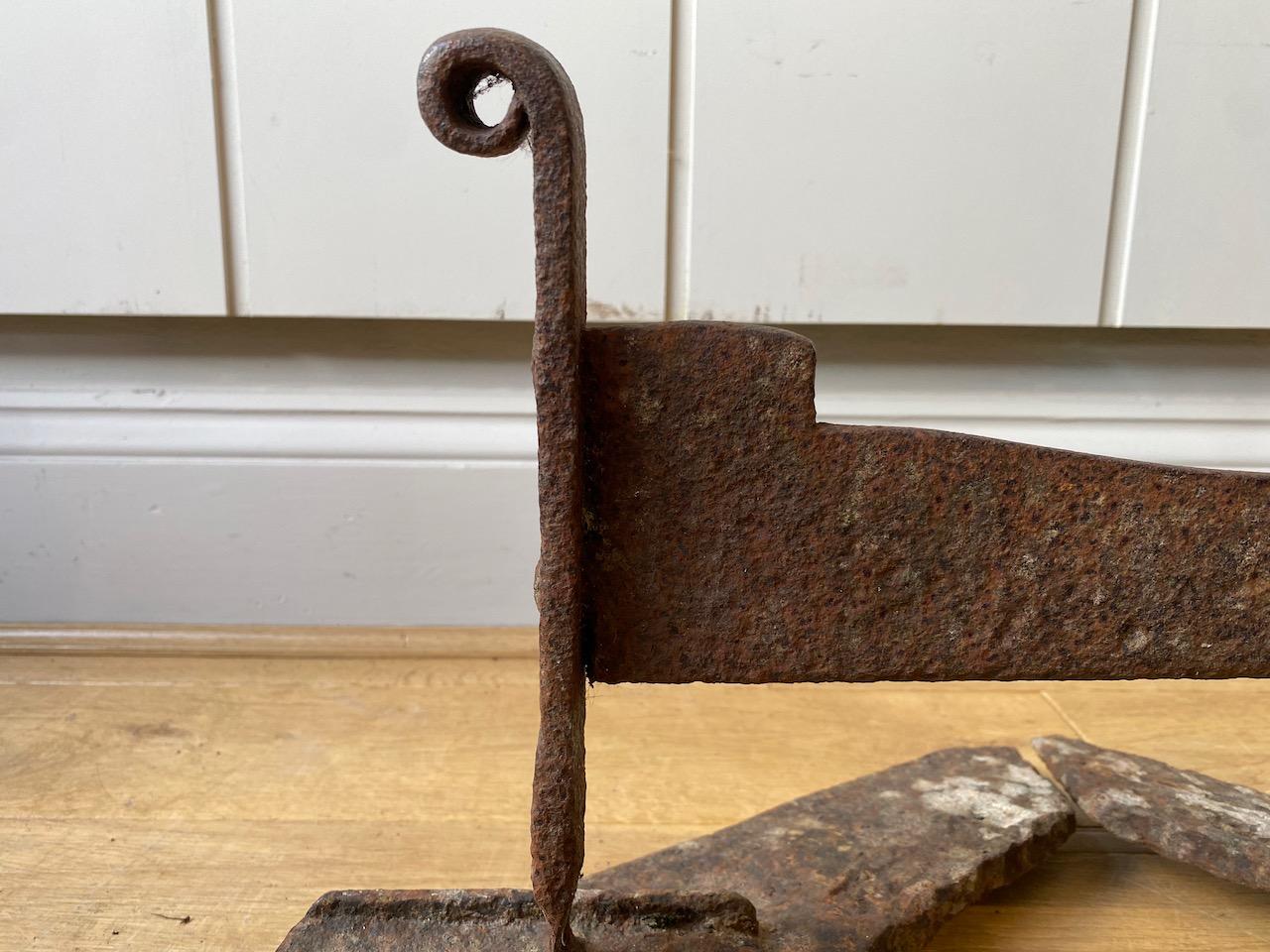 Victorian Wrought Iron Boot Scraper, with cast iron base with makers name, which is meant to be embedded below surface level, two wrought iron posts finished with scrole finial, with scraper blade suspended between the posts