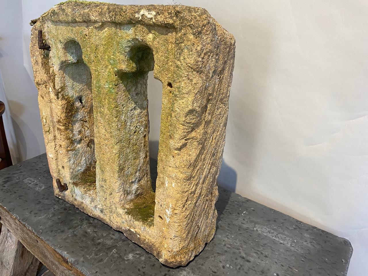 Gothic Carved Mullioned Window in Sandstone, consisting of a pair of gothic openings with spandrels above. the rear shows faceted evidence of the use of two wooden chutters with two remaining iron hinge posts to one side.