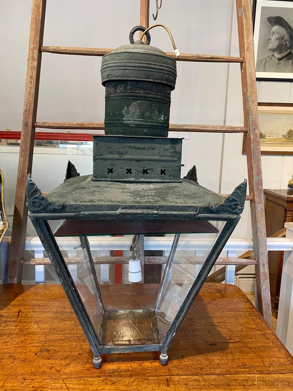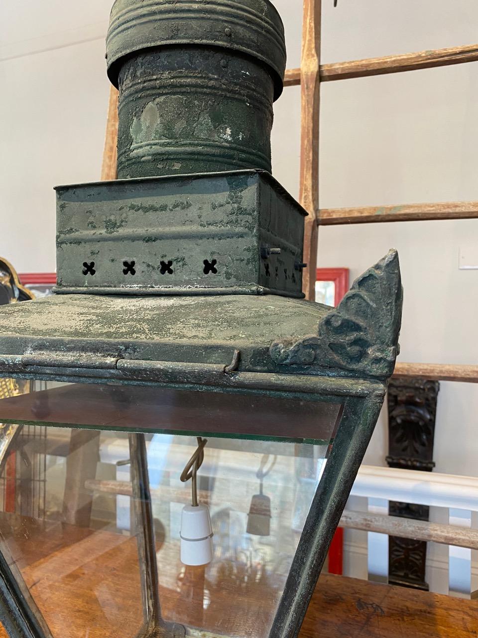Large Hanging Gas Lantern with original verdigris finish, of cantered square form with corner anthemion ornament, cast acorn feet and pierced chimney vent. with later mirror ceiling in the light.