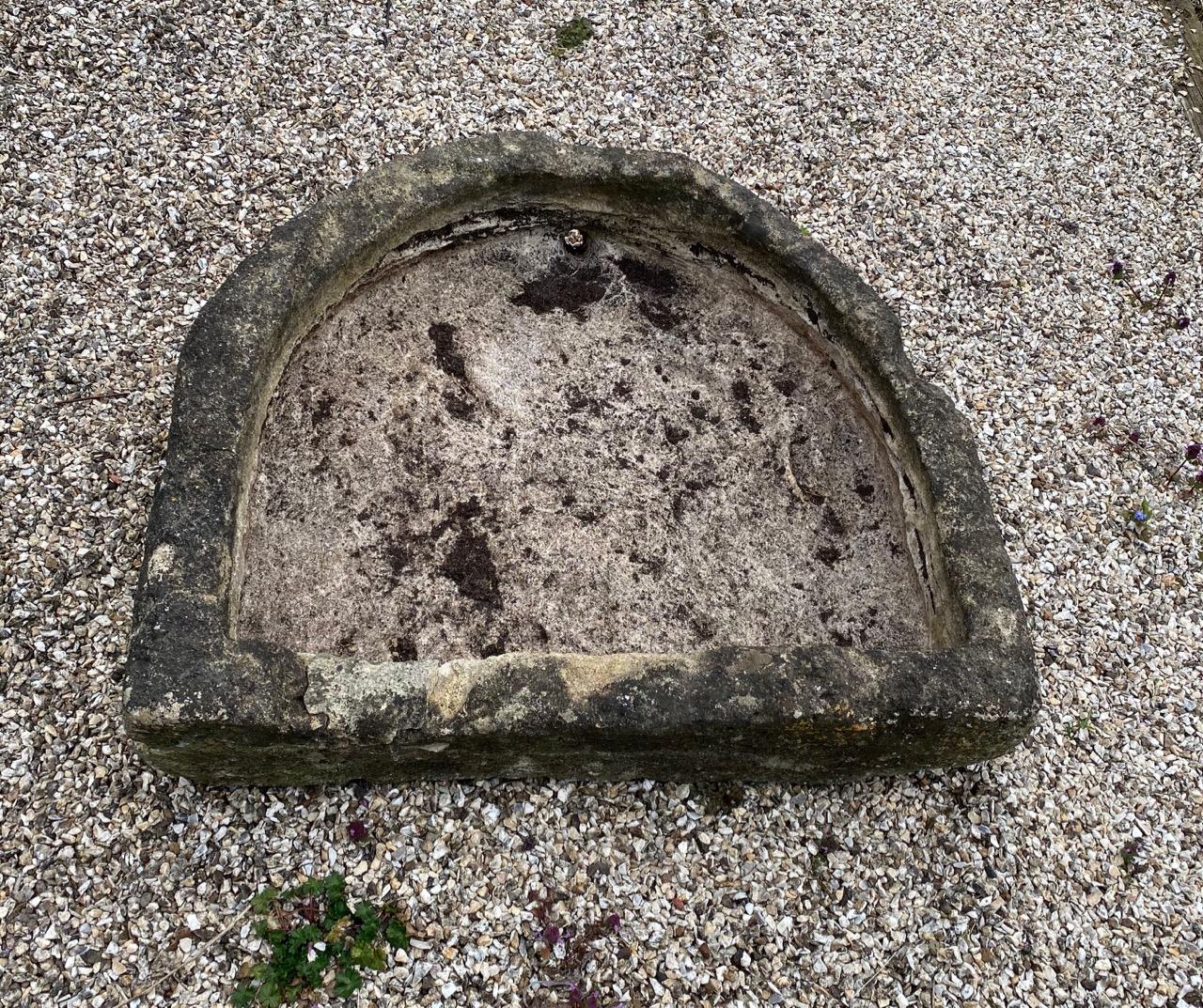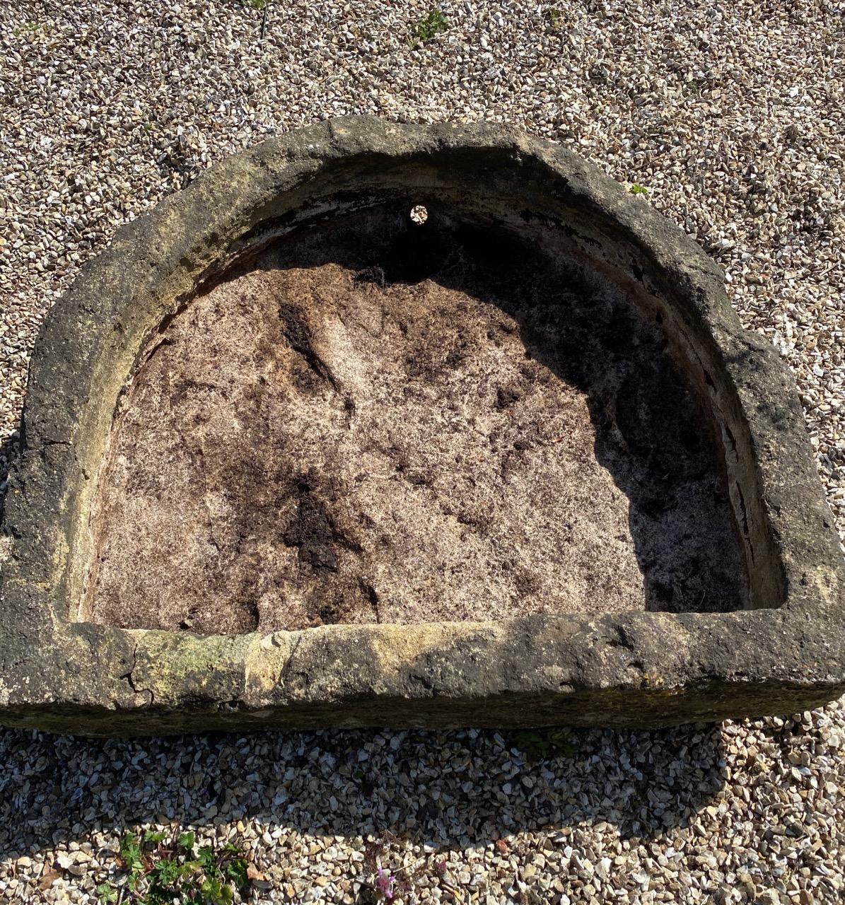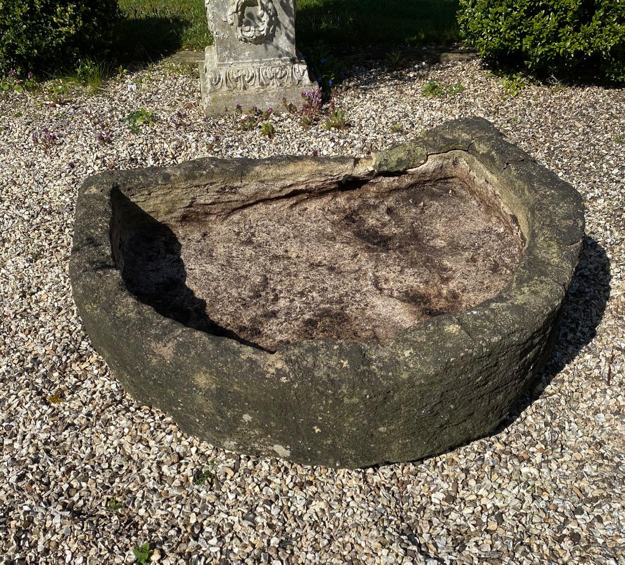 Limestone Feeding or Drinking Trough, of large size and weight, of square form, with rounded fron,t carved from a single piece of stone, in need of a little repair, and with drainage hole, found in a West Sussex garden and of local origin, 18th century or earlier.