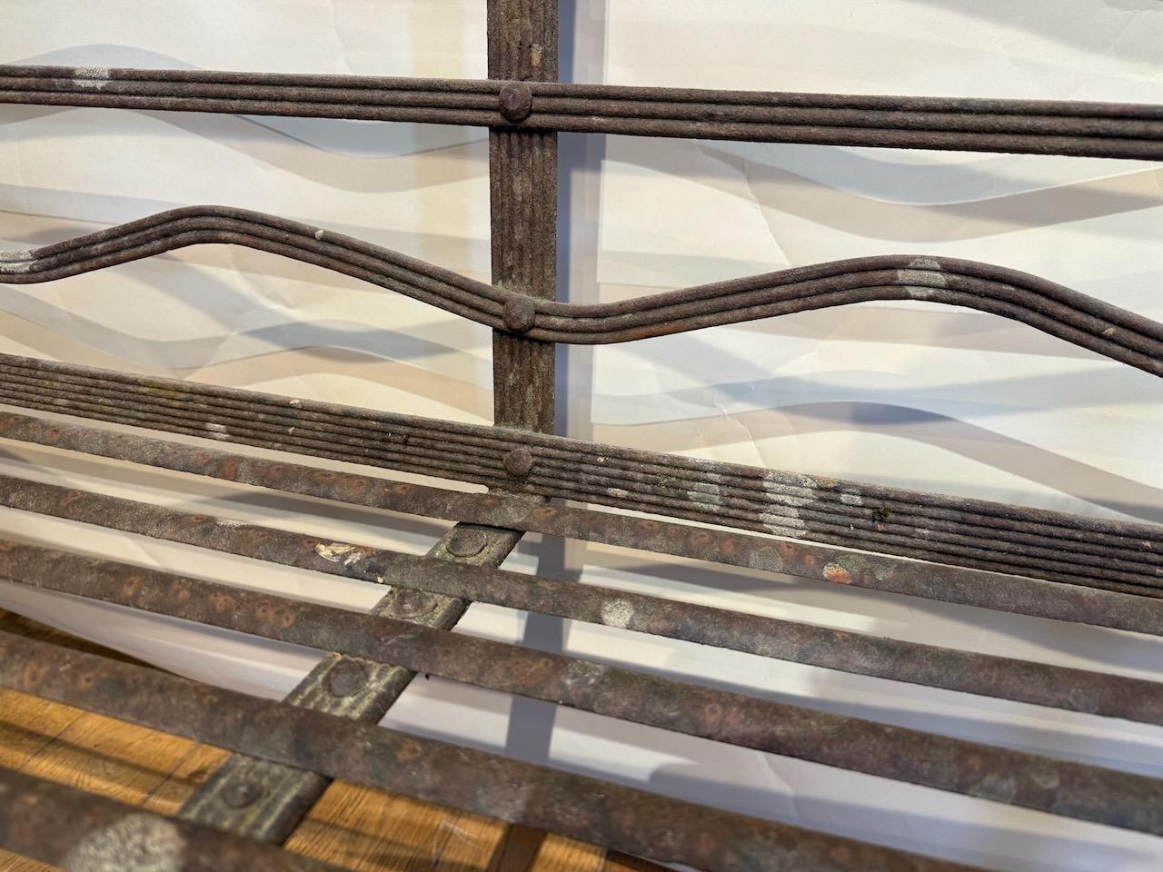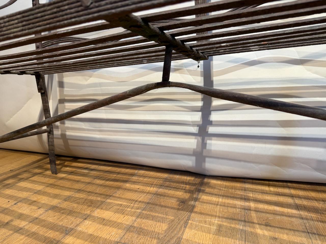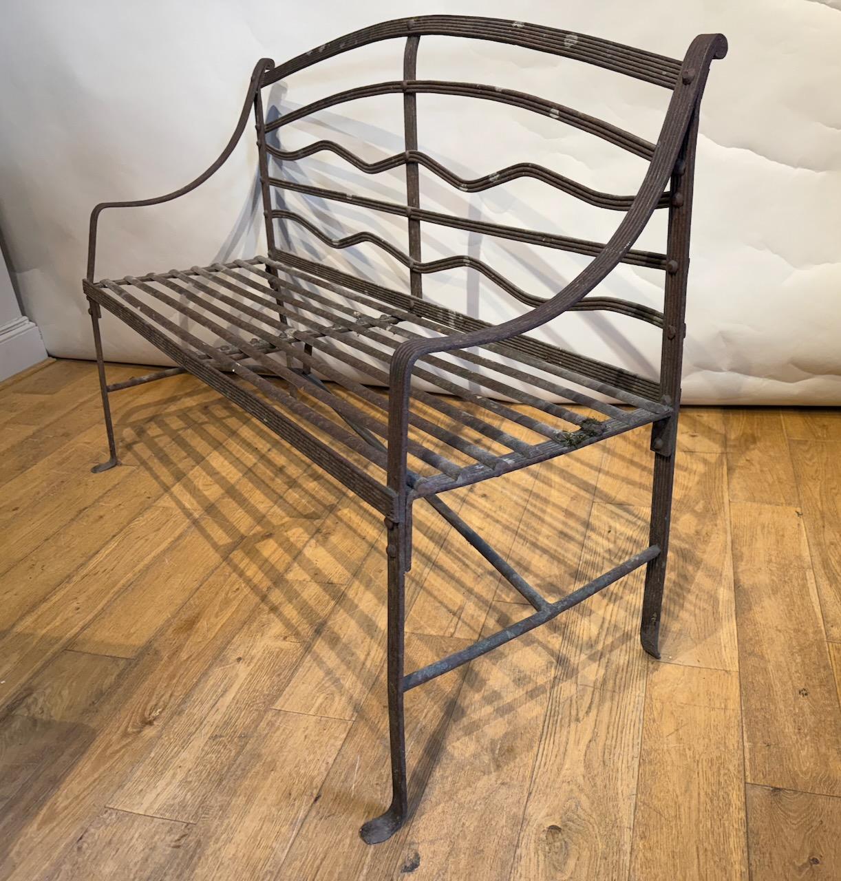 Regency Wrought Iron Garden Seat, made from forged iron, part reeded, part half round, the arched back pot reiveted to the back legs, the arms also in reeded iron bent to form the front legs, which are also bent at the end to form the feet, the seat formed with strips of half round iron, and supported by a central bracing bar attached to the side stretchers.