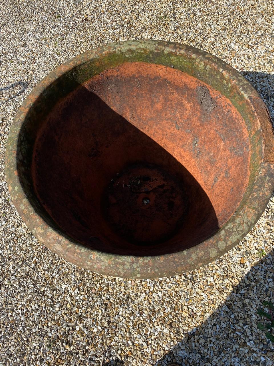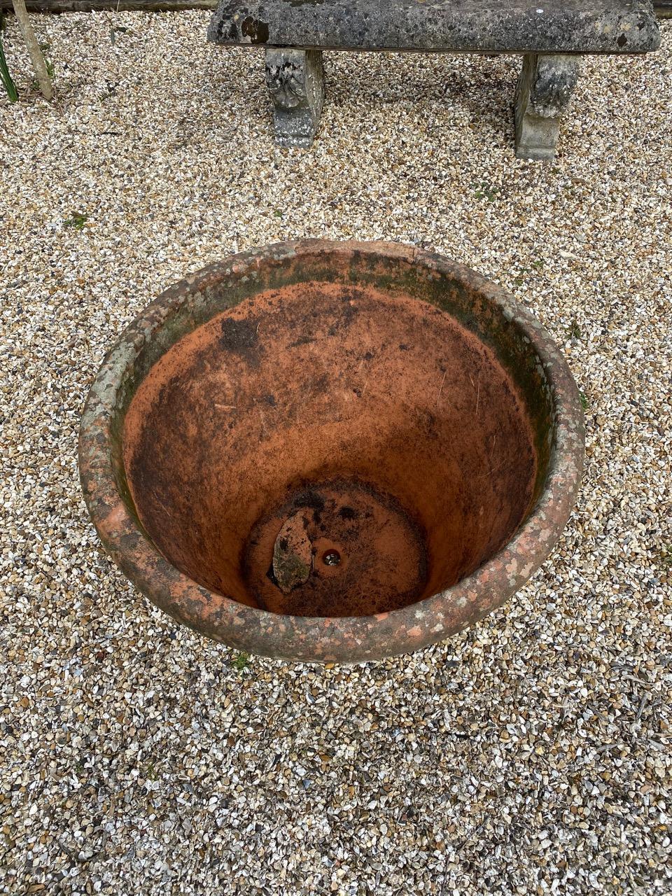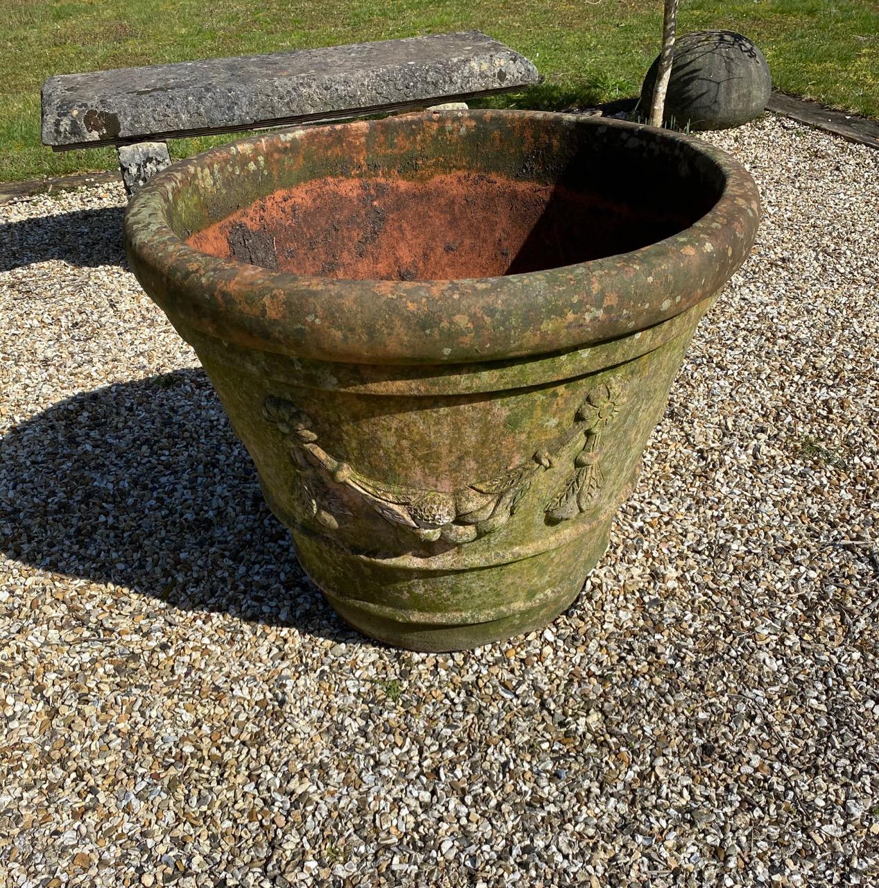 Terra Cotta Urn or Planter, of large size, in the Italian style, cast and decorated with moulded ring bands, fruit swags and garlands,