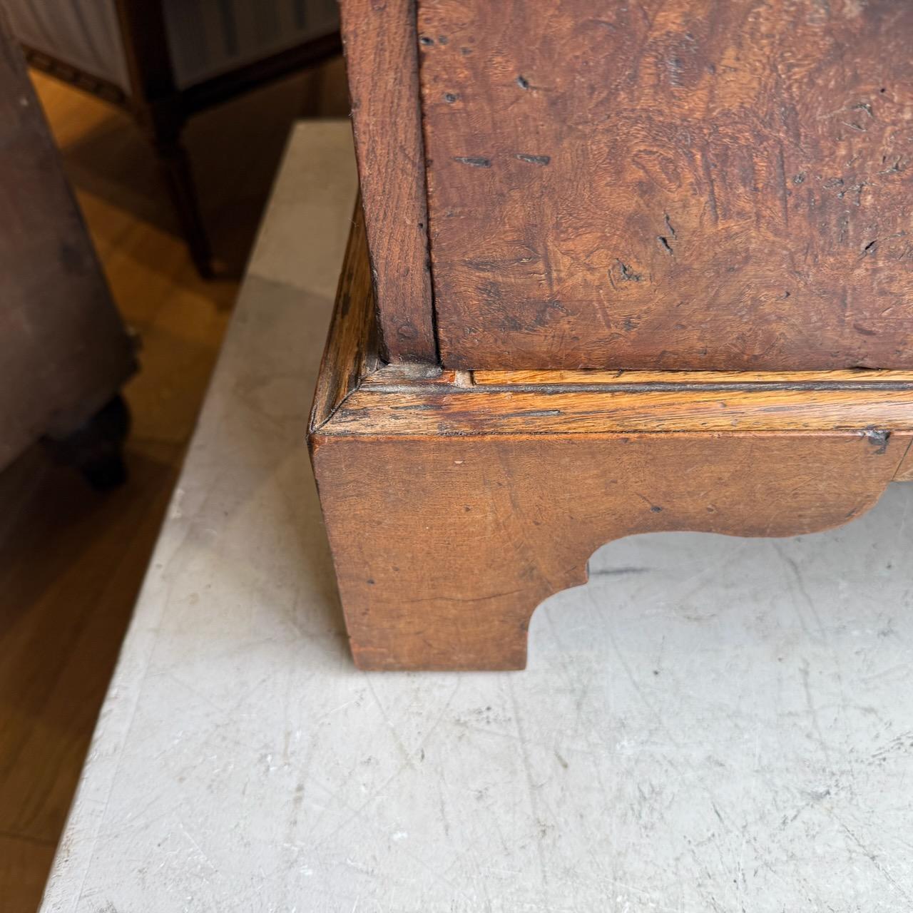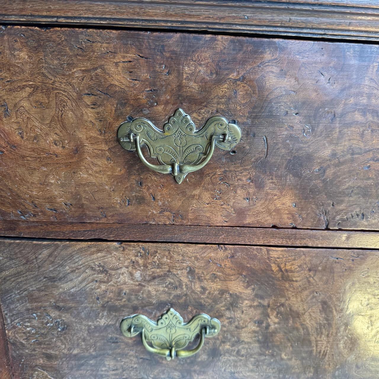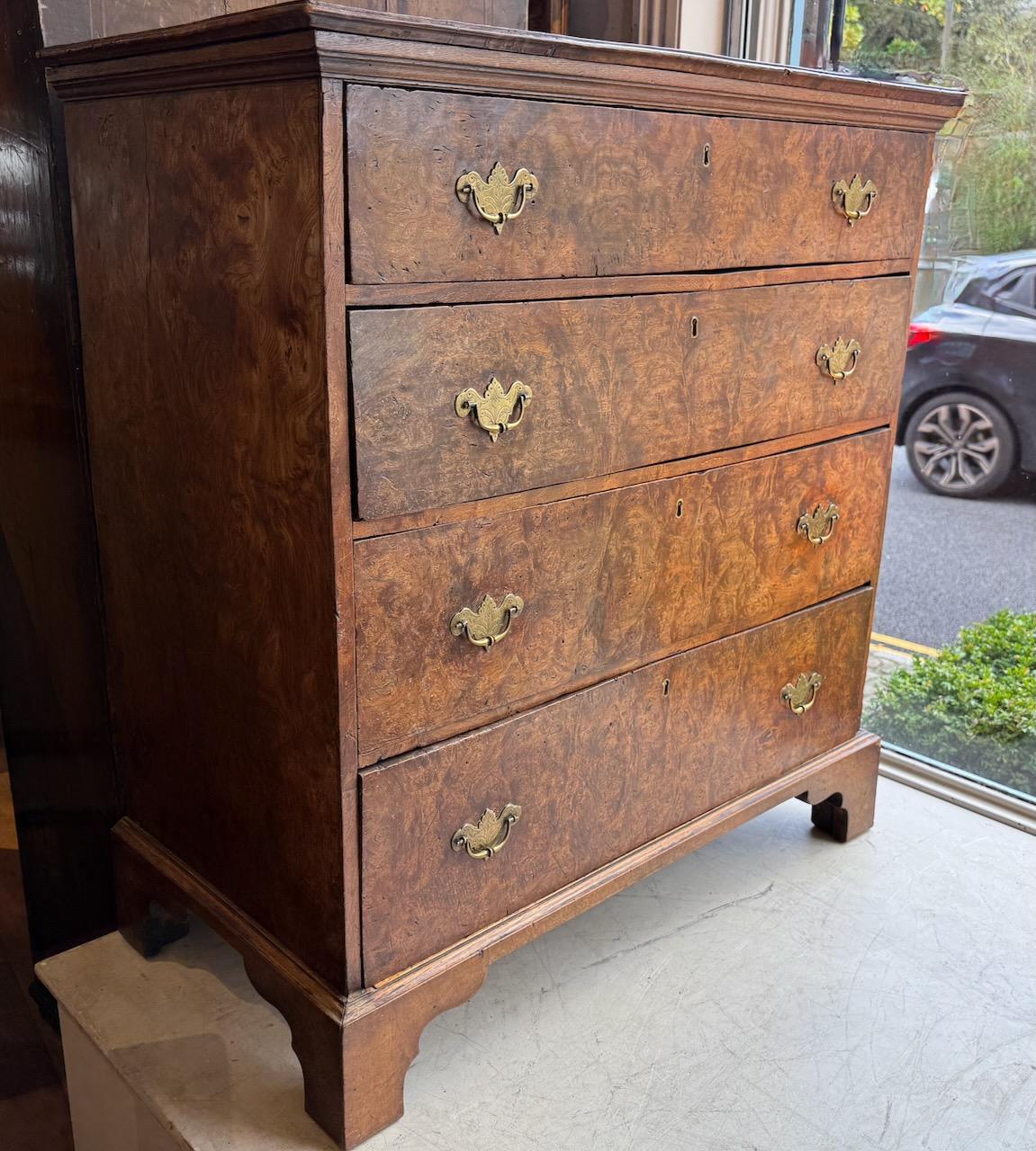 George II Chest of Drawers, in Burr Elm, the plank top with moulded edge above 4 graduated drawers with later engraved brass handles, standing on bracket feet (later)