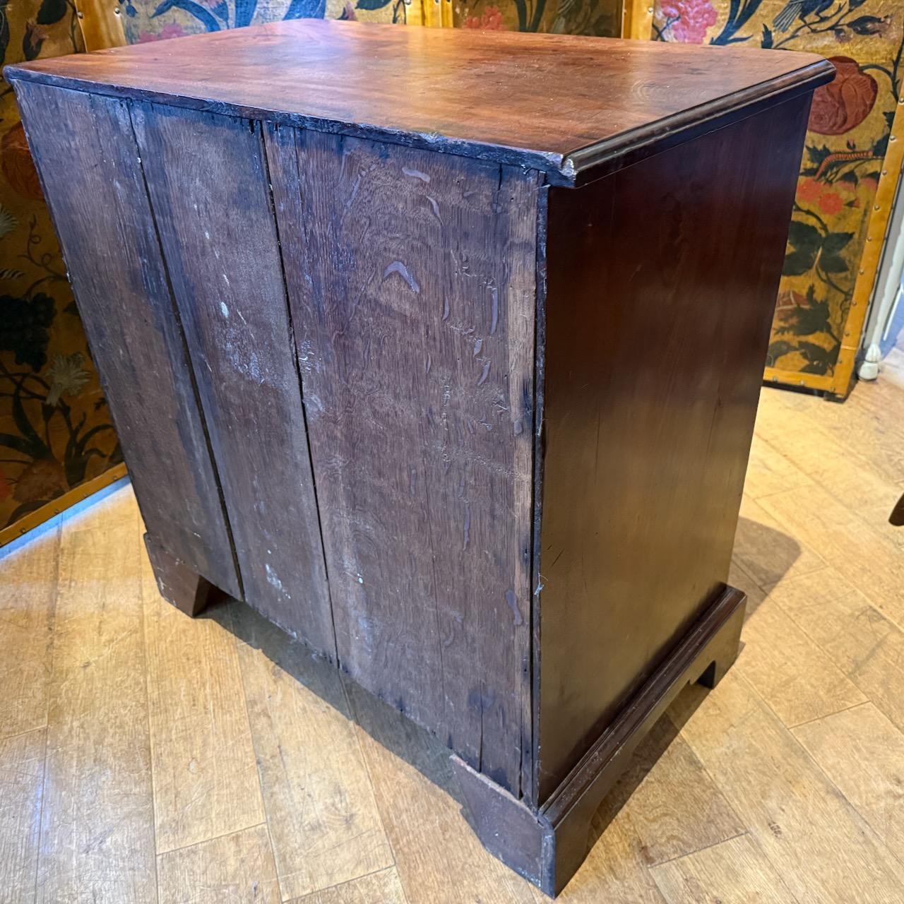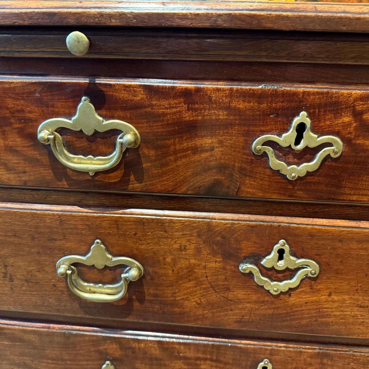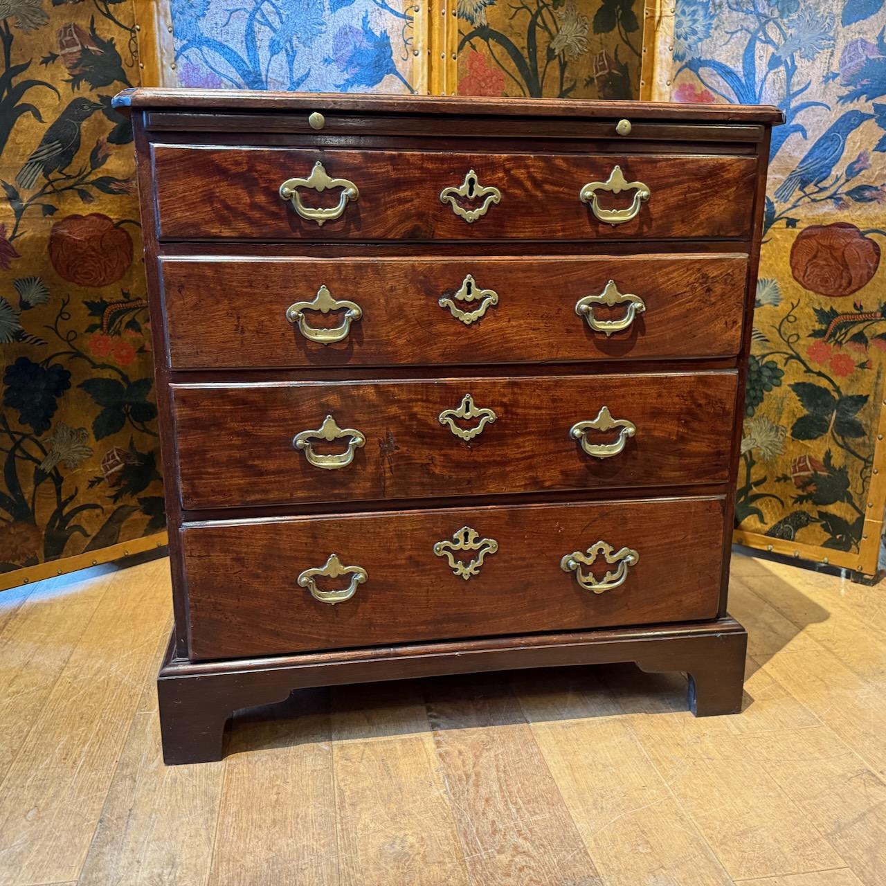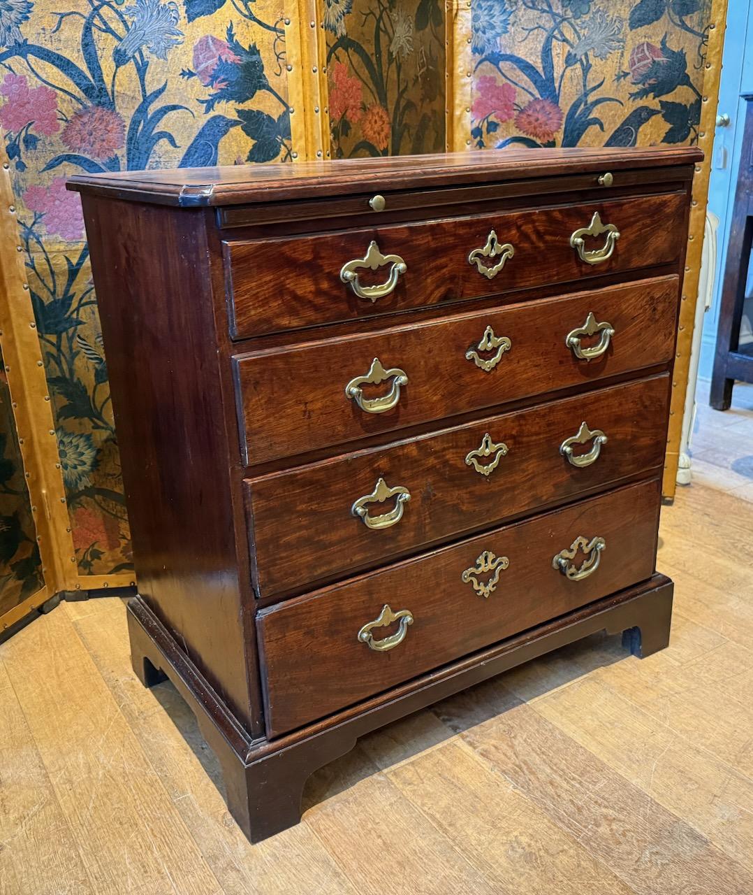 George III Chest of Drawers, in Mahogany with good colour and grain, the one piece top with moulded edge and re-entrant corners, above a dressing slide and five graduated drawers with mostly original brass swan neck handles with pierced back plates. standing on bracket feet.