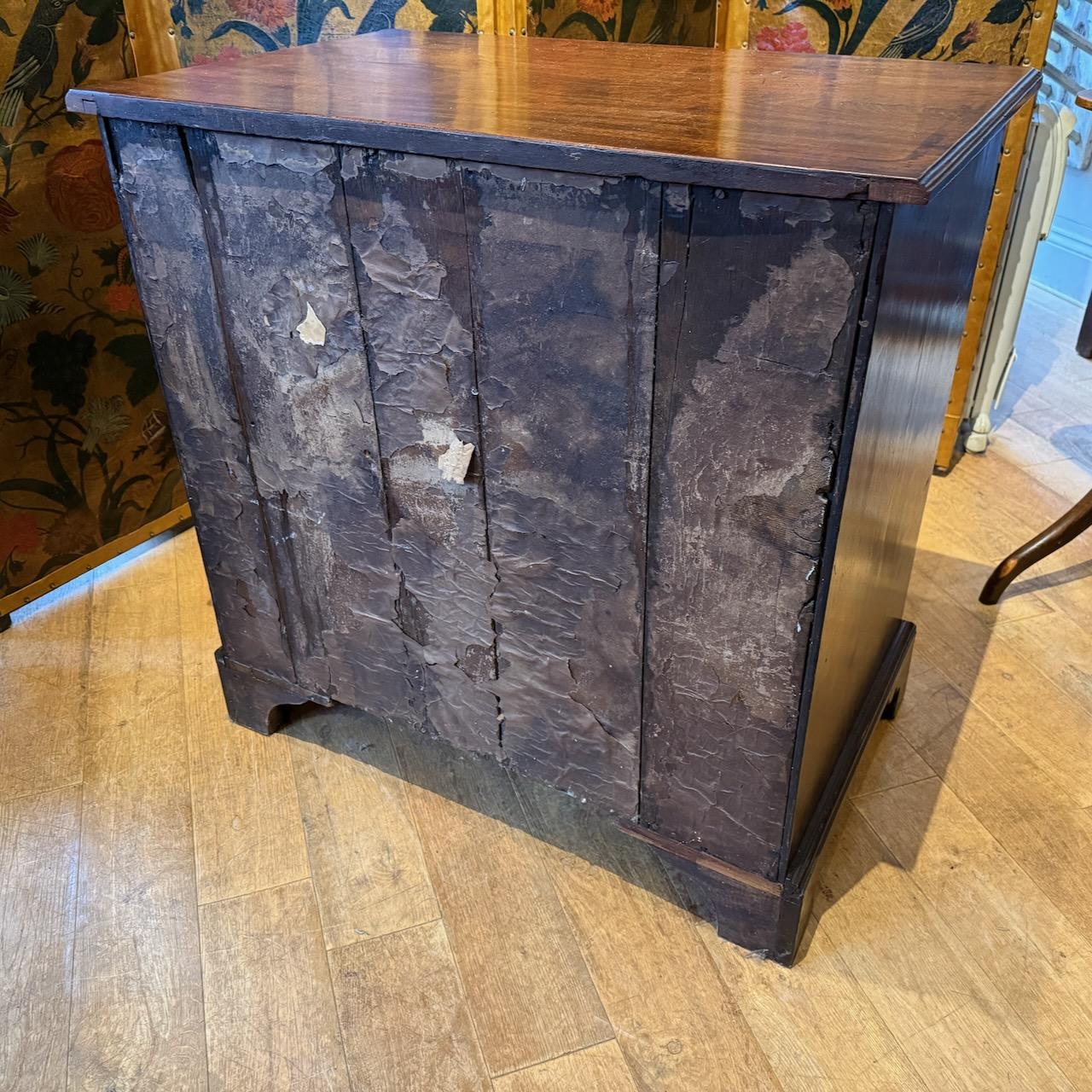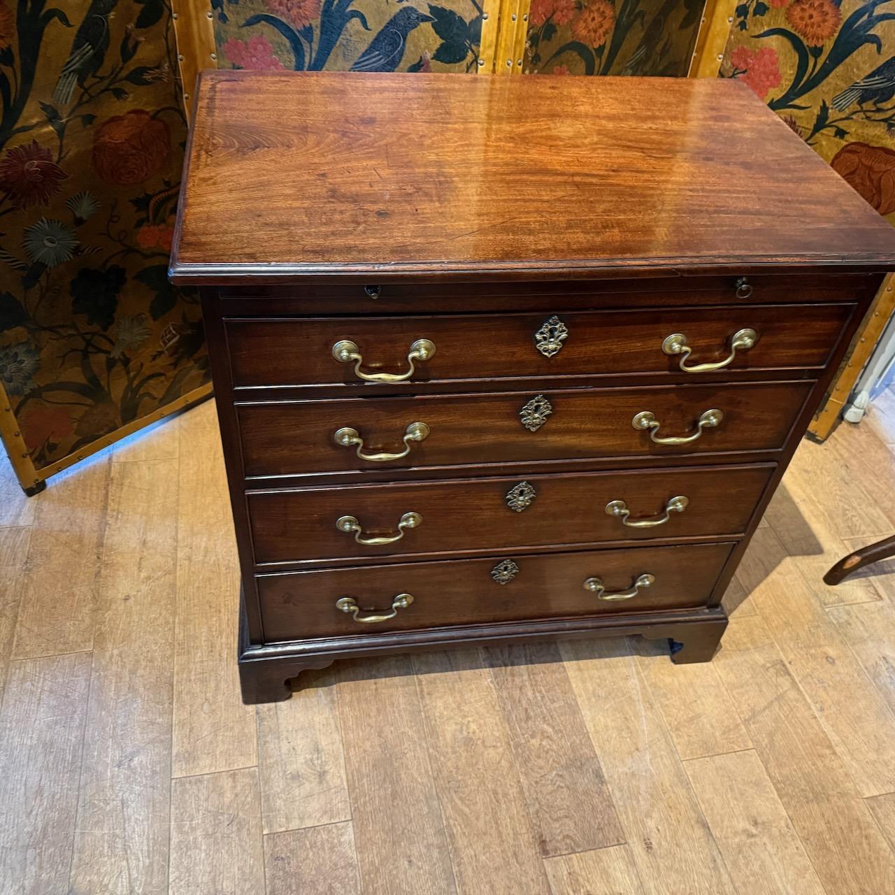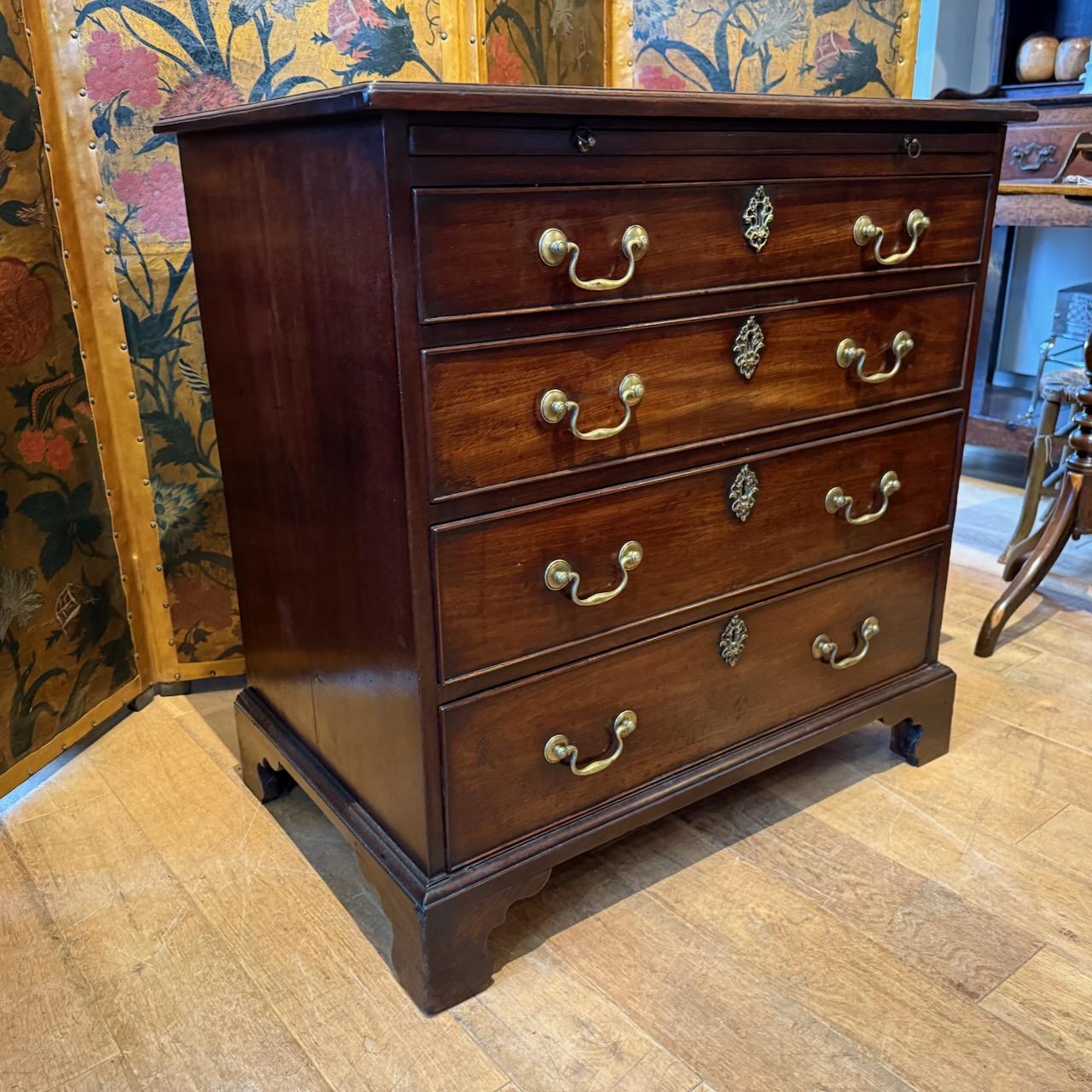 George III Chest of Drawers, in patinated Mahogany, the single plank top with moulded edge above a dressing slide and four graduated drawers with original brass swan neck handles and escutcheons, sitting on bracket feet.