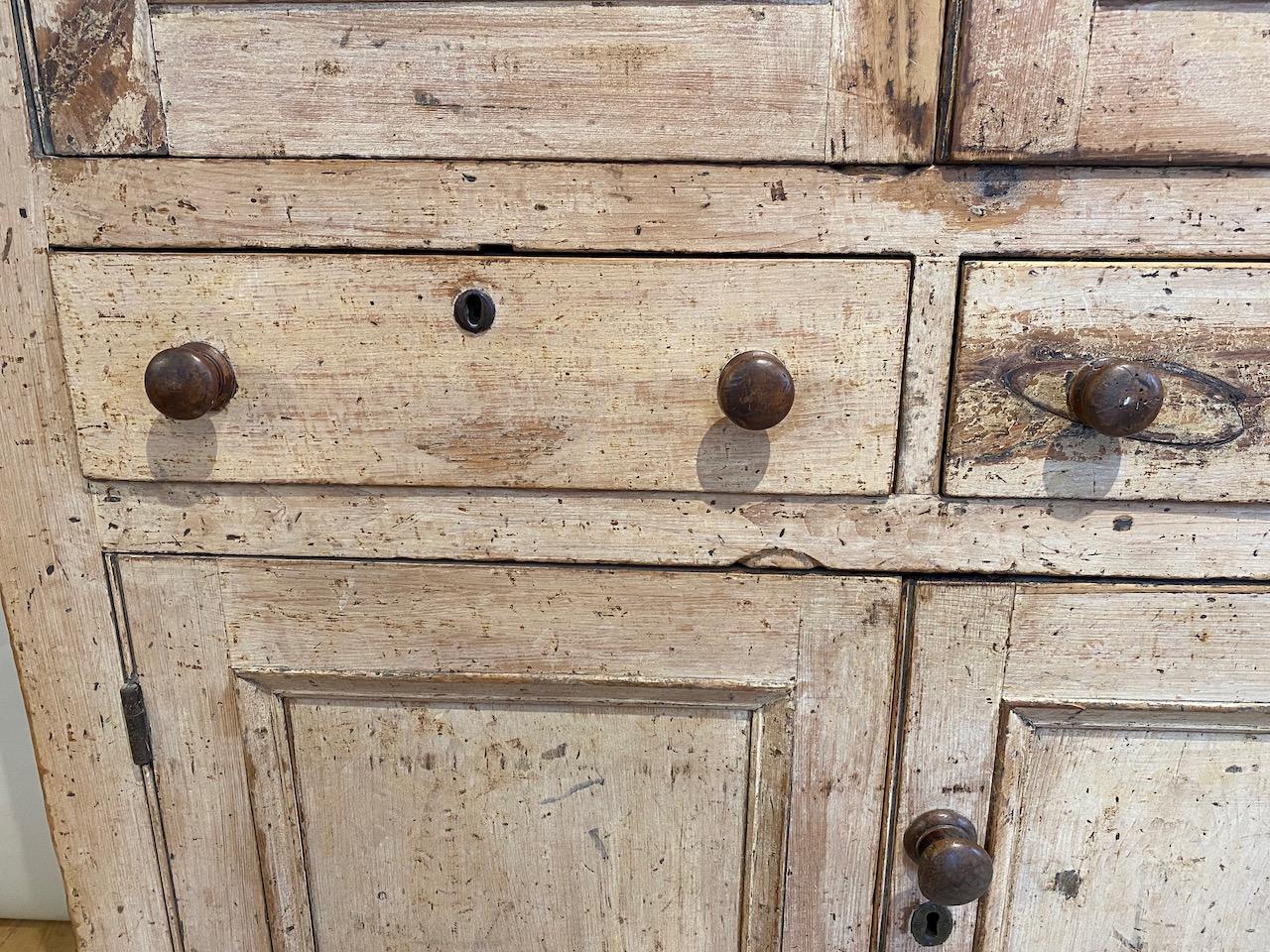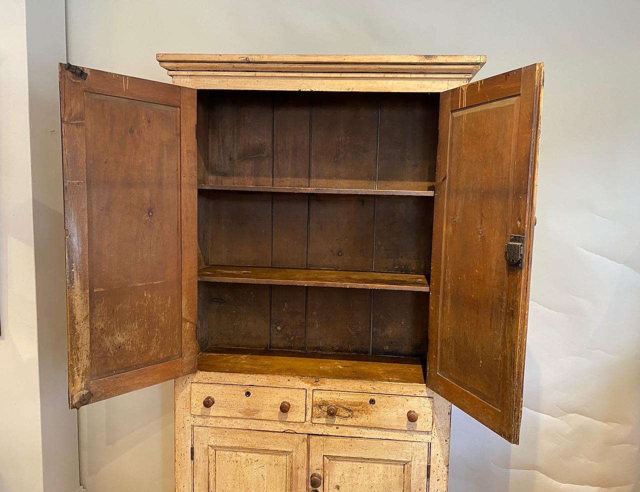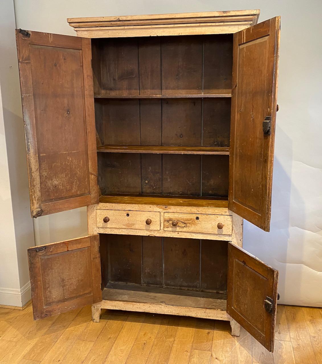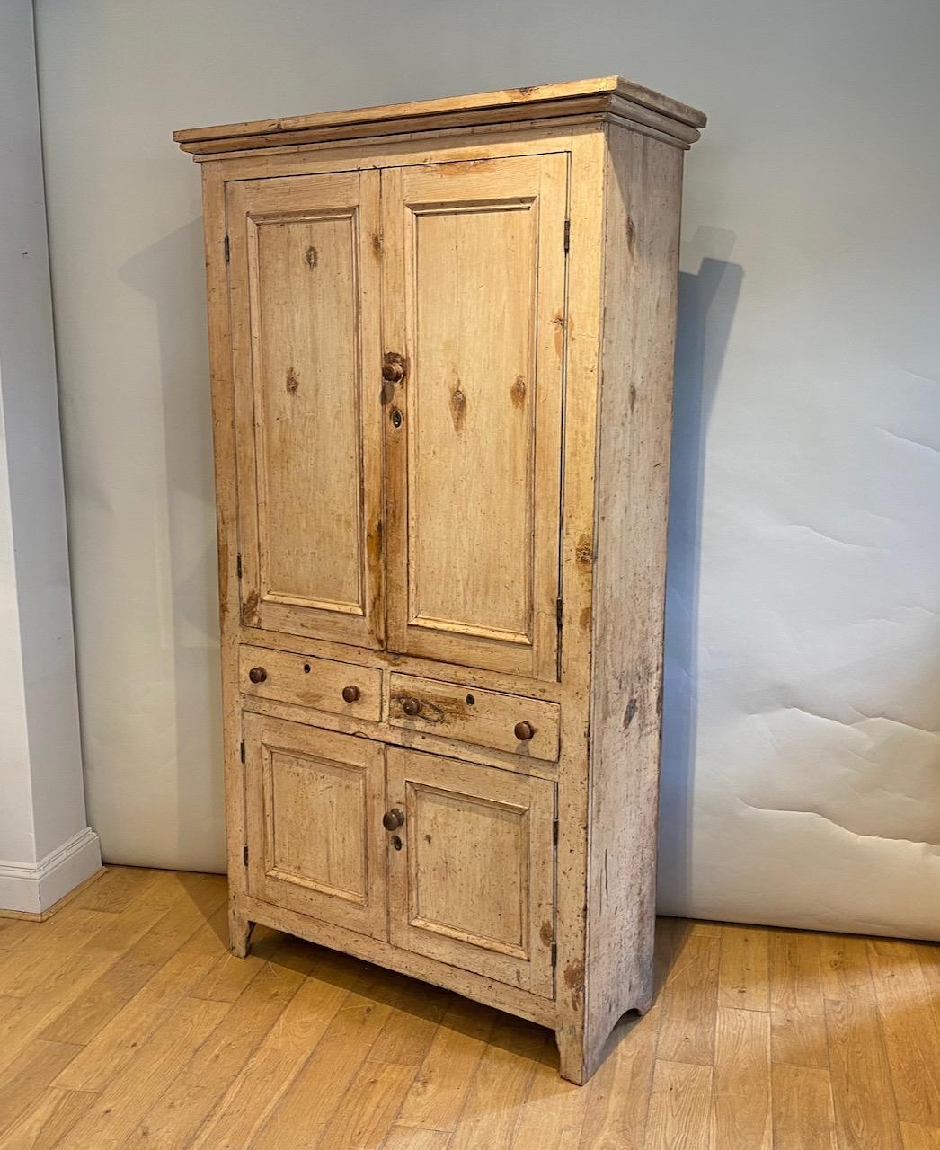 George IV House Keepers Cupboard, in pine, with original off pale cream yellow paint, and with well drawn cornice above a pair of panelled doors enclosing three shelves, above a pair of drawers with original turned sycamore handles and escutcheons, and in turn, above a pair of lower doors enclosing a single shelf, standing on cut out bracket feet, the boarded sides also with simple cut out feet. Back with original tongue and groove boards.