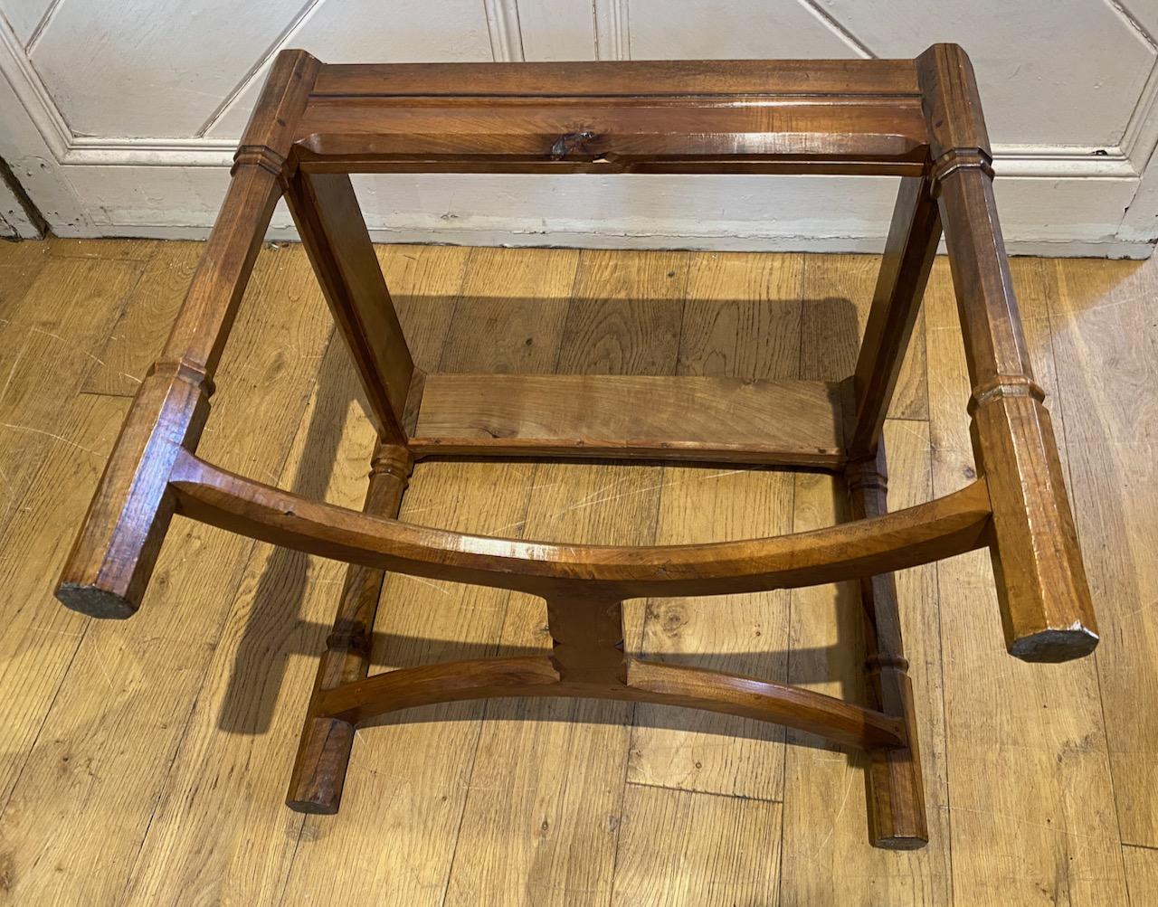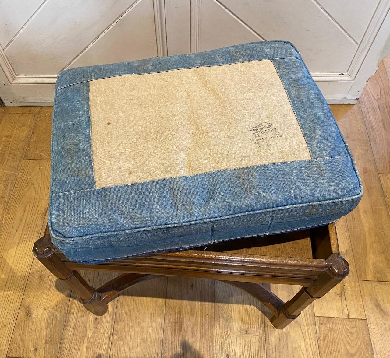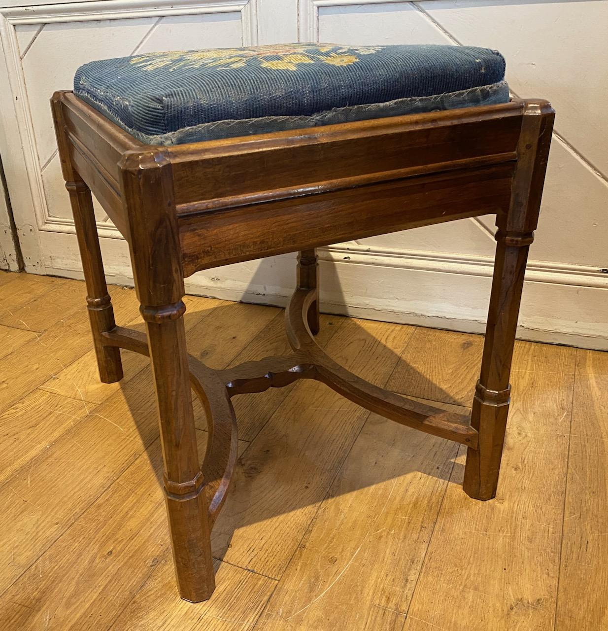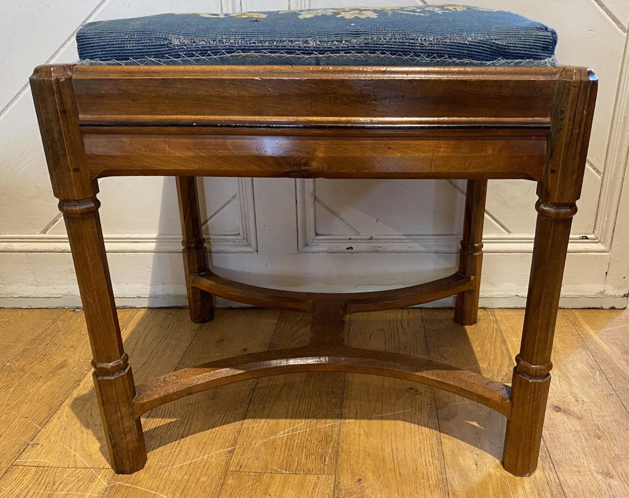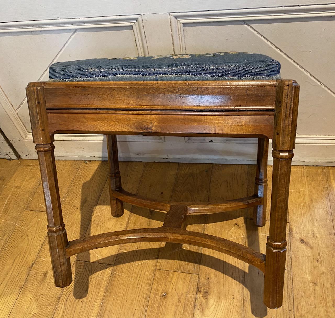 Gordon Russel Stool in Walnut, the "Sudeley" stool, design No191 with drop in Vispring sprung cushion, with needlepoint top, in moulded frame with Ebony stringing supported on four faceted and turned, pillastered legs, joined together by a "wish bone" H stretcher with central "bow' tie.