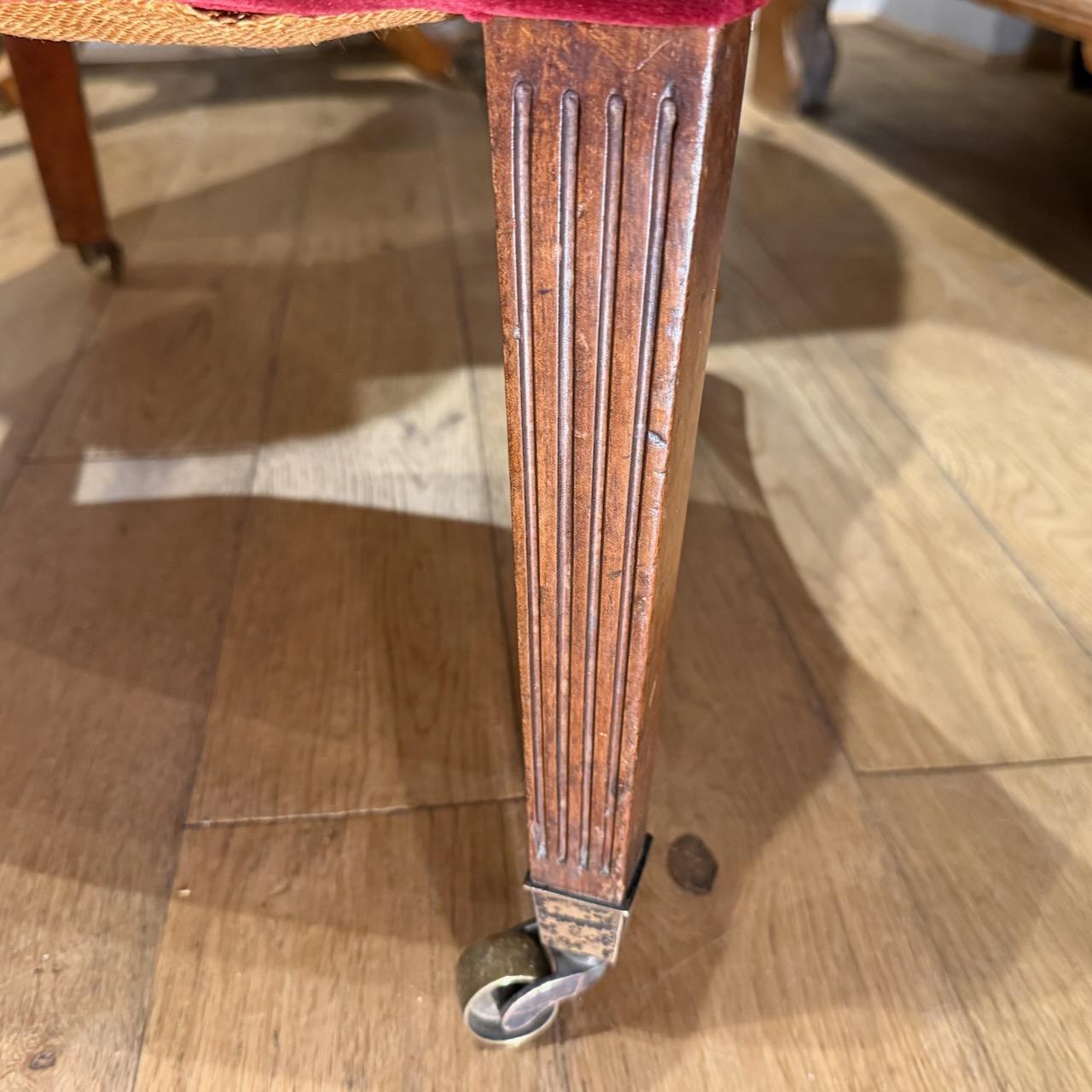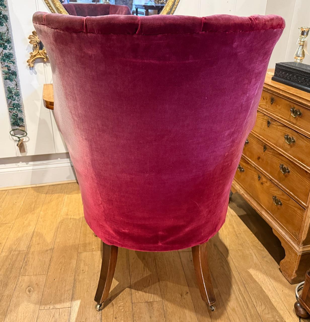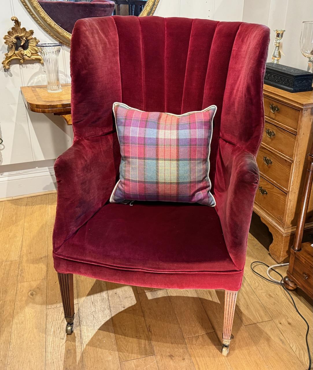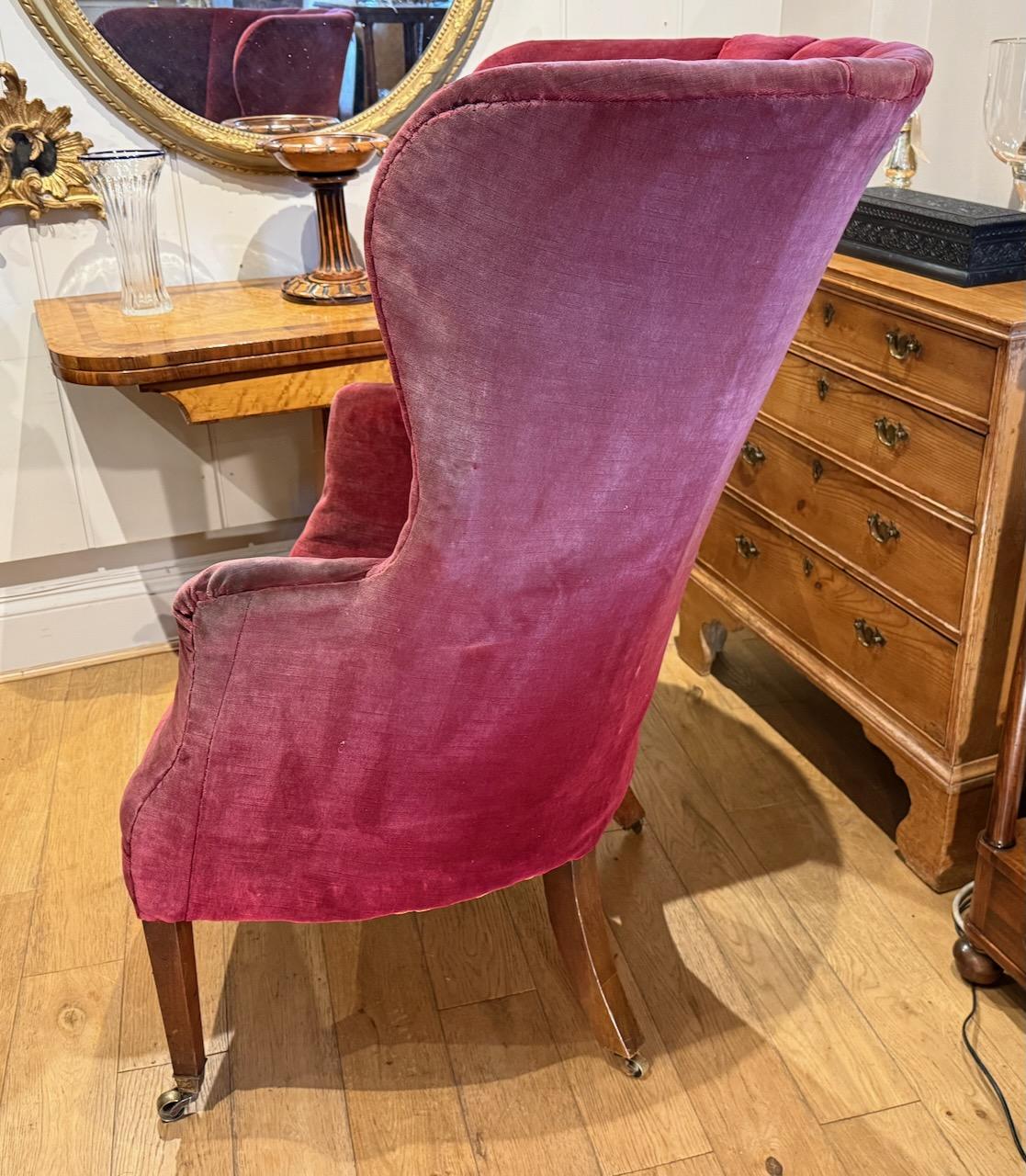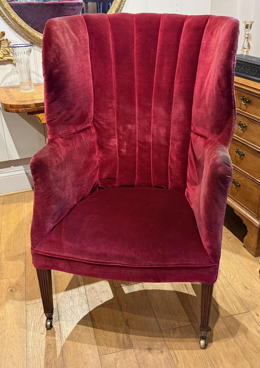 George III Barrel Back Wing Chair, in Mahogany, the barrel back with attached wings and shaped arms above a sprung seat supported by fluted tapering front legs on brass cup casters, with splayed square back legs on casters, upholstered in old red dralon.