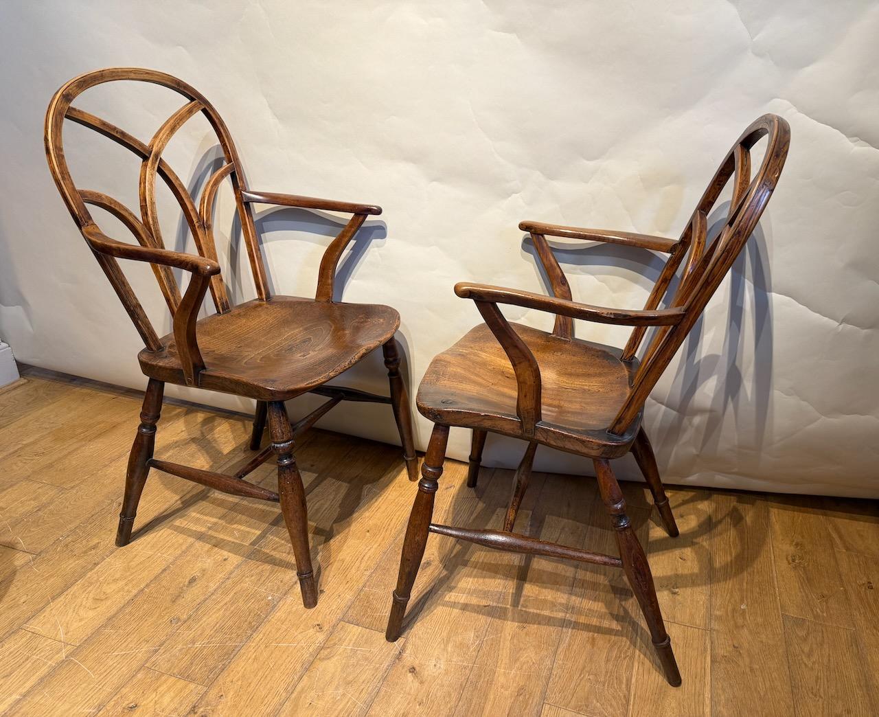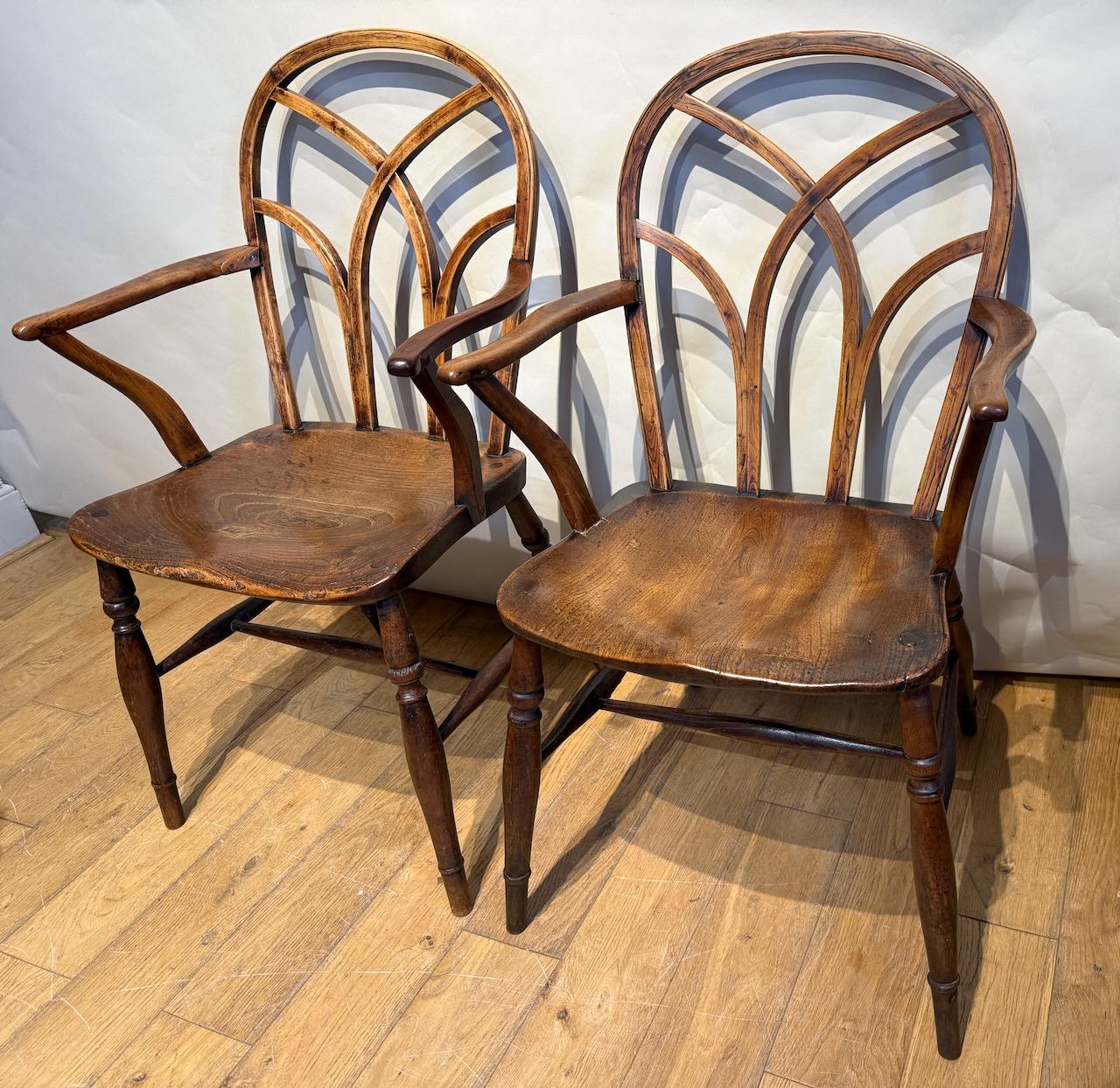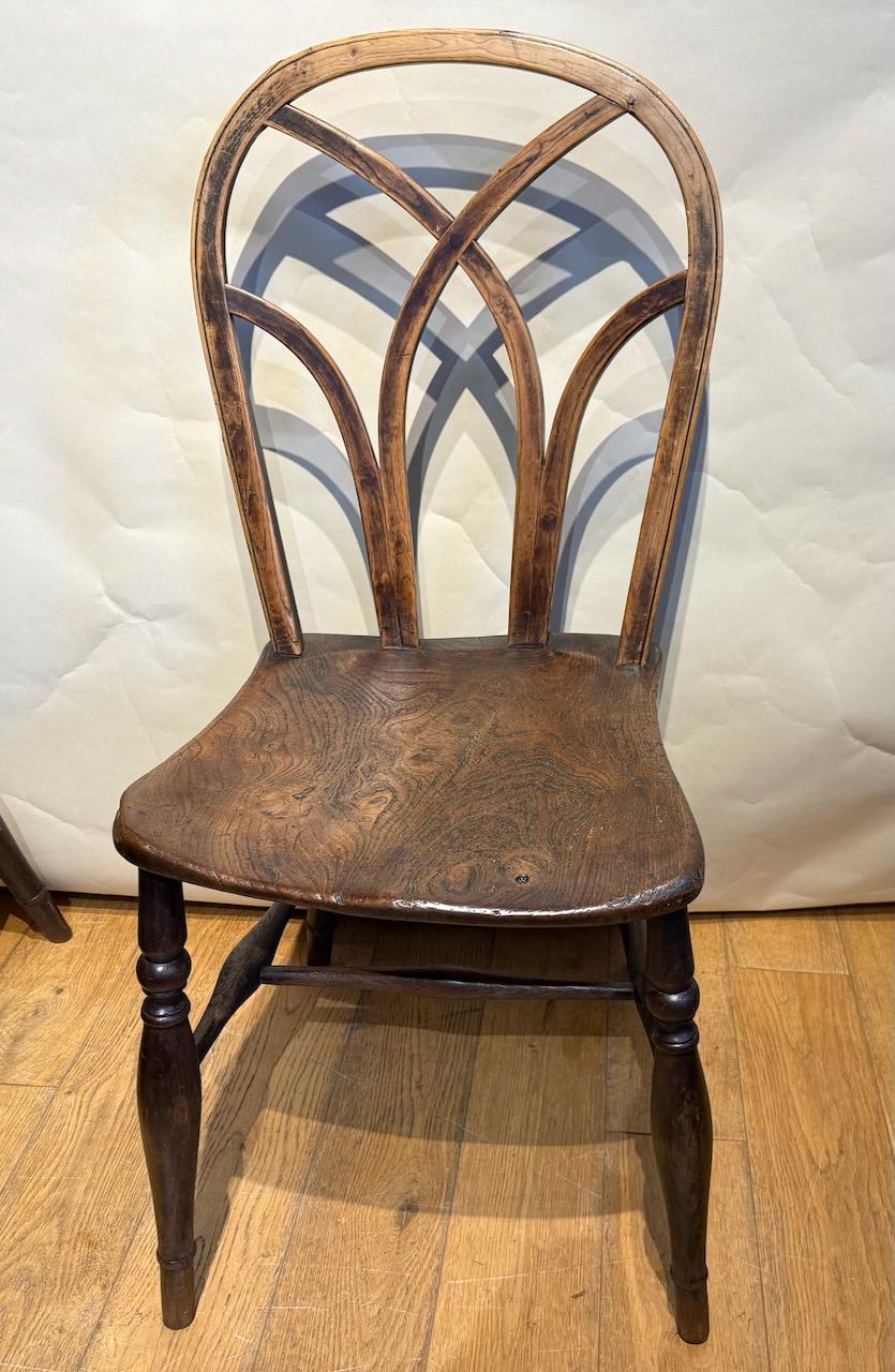 the bent hoop back with braced with hooped bars giving a gothic effect, with shaped arms on cut back supports fixed to the Elm seat, supported on on four turned splayed legs joined together by simple turned H stretcher.