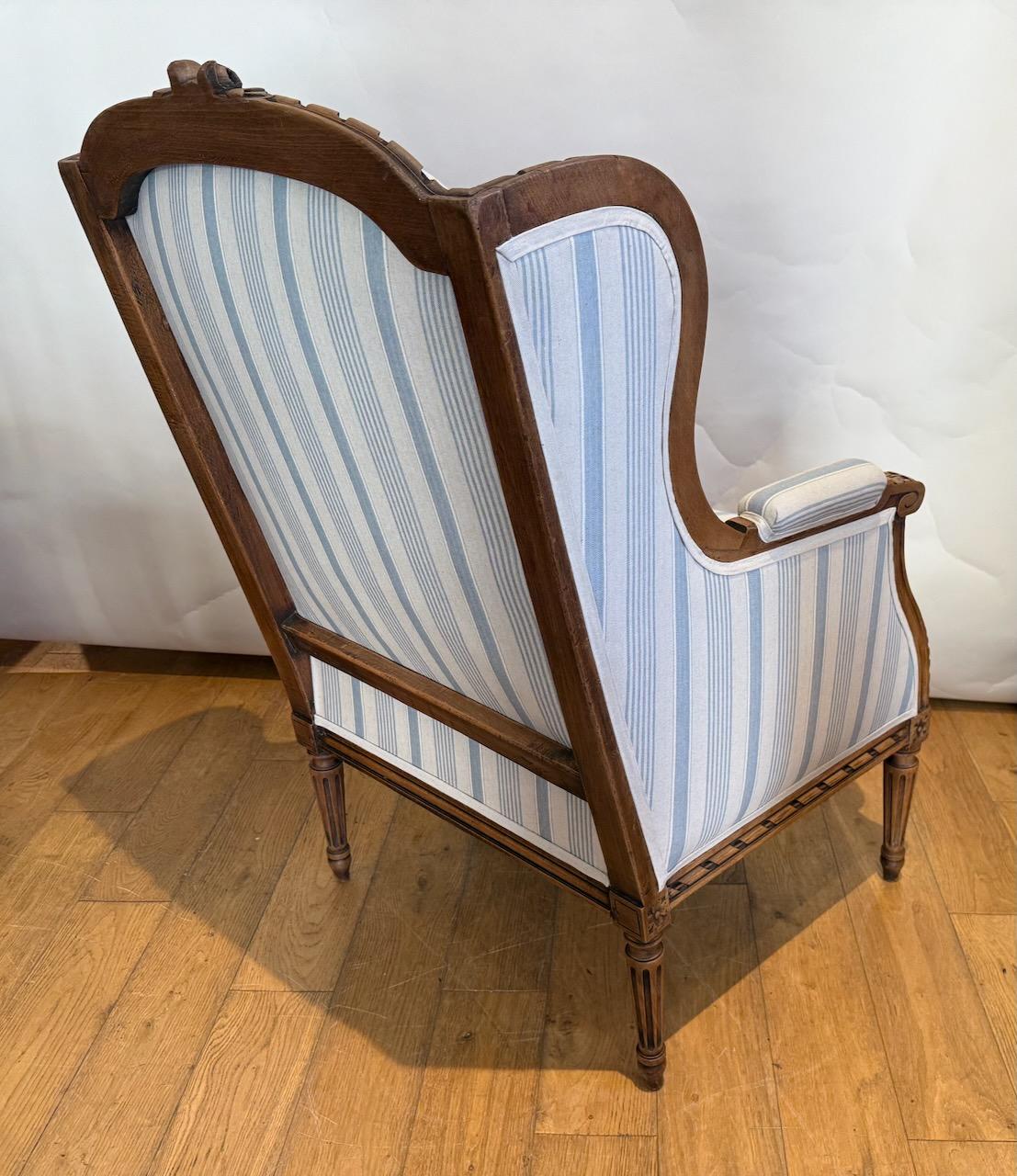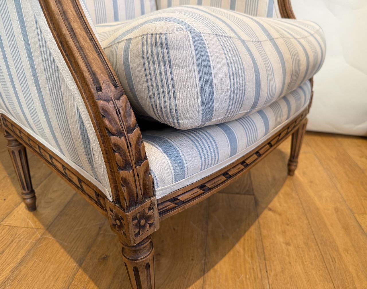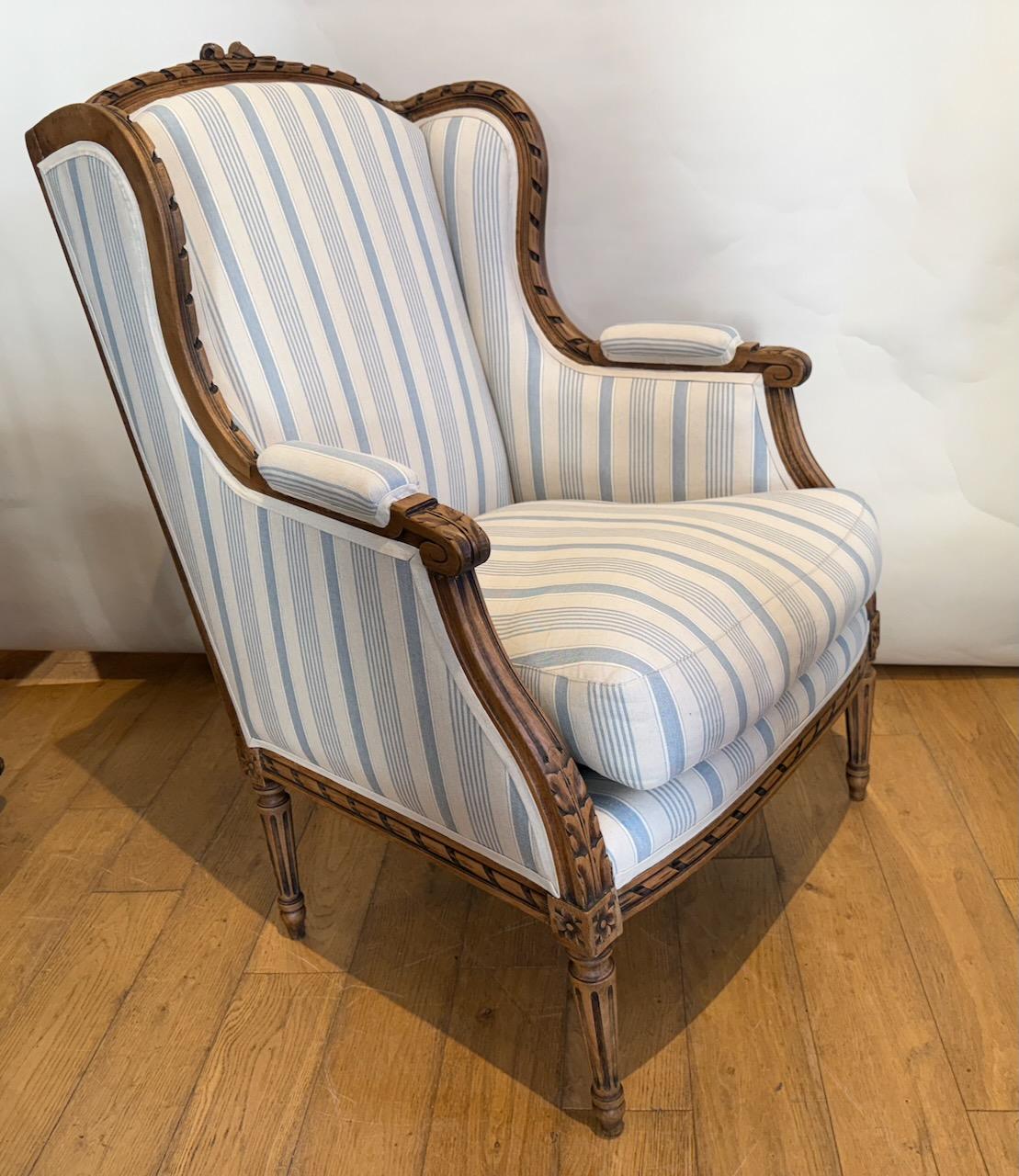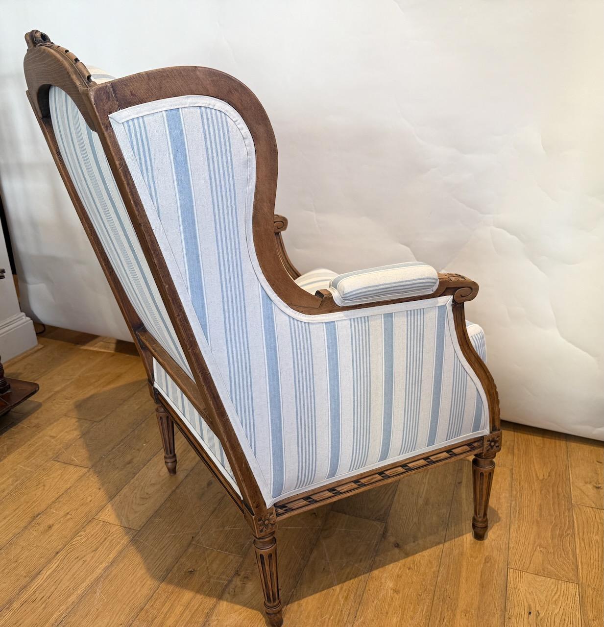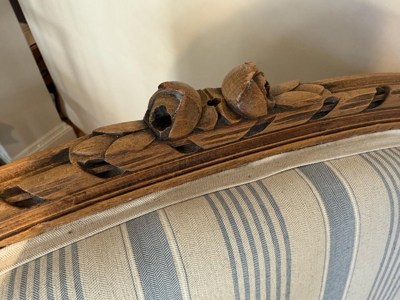Louis XV Style Upholstered Arm Chair,the frame in carved Beech, upholstered in blue and white striped ticking.