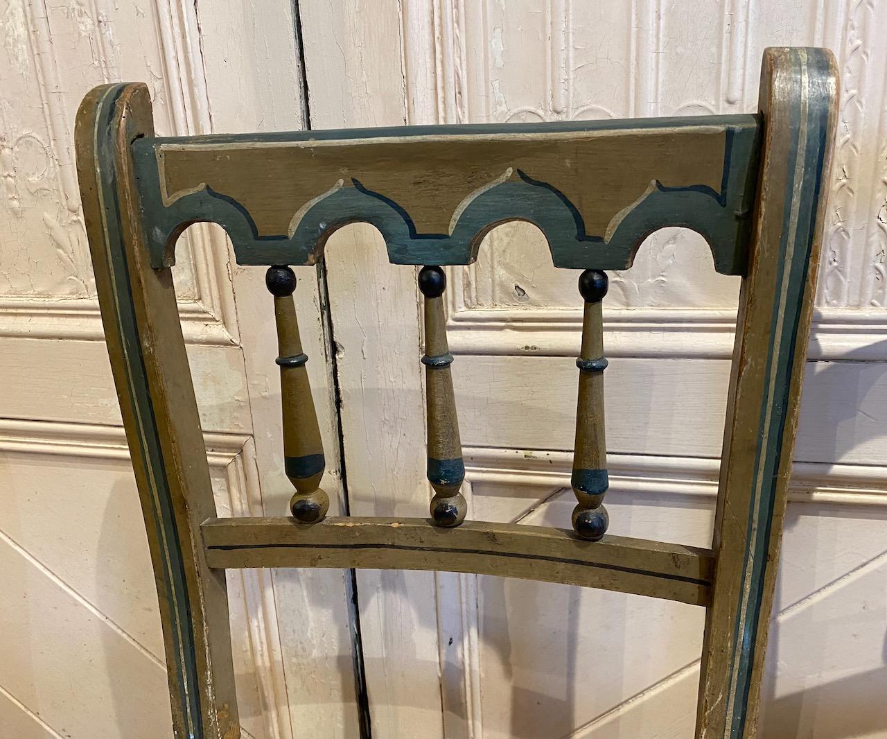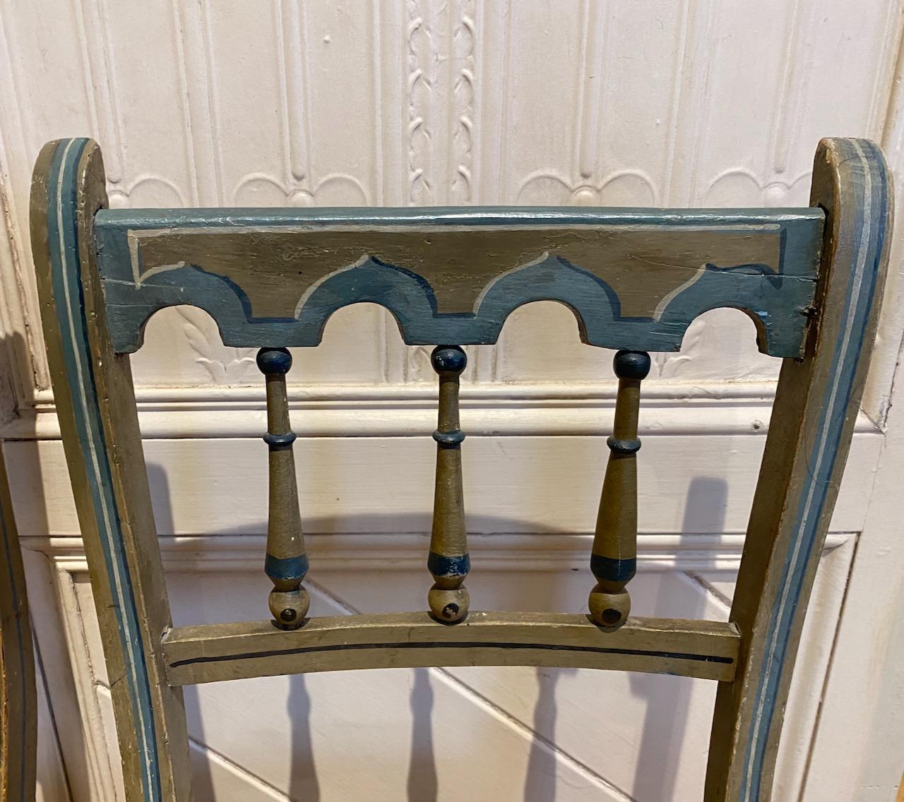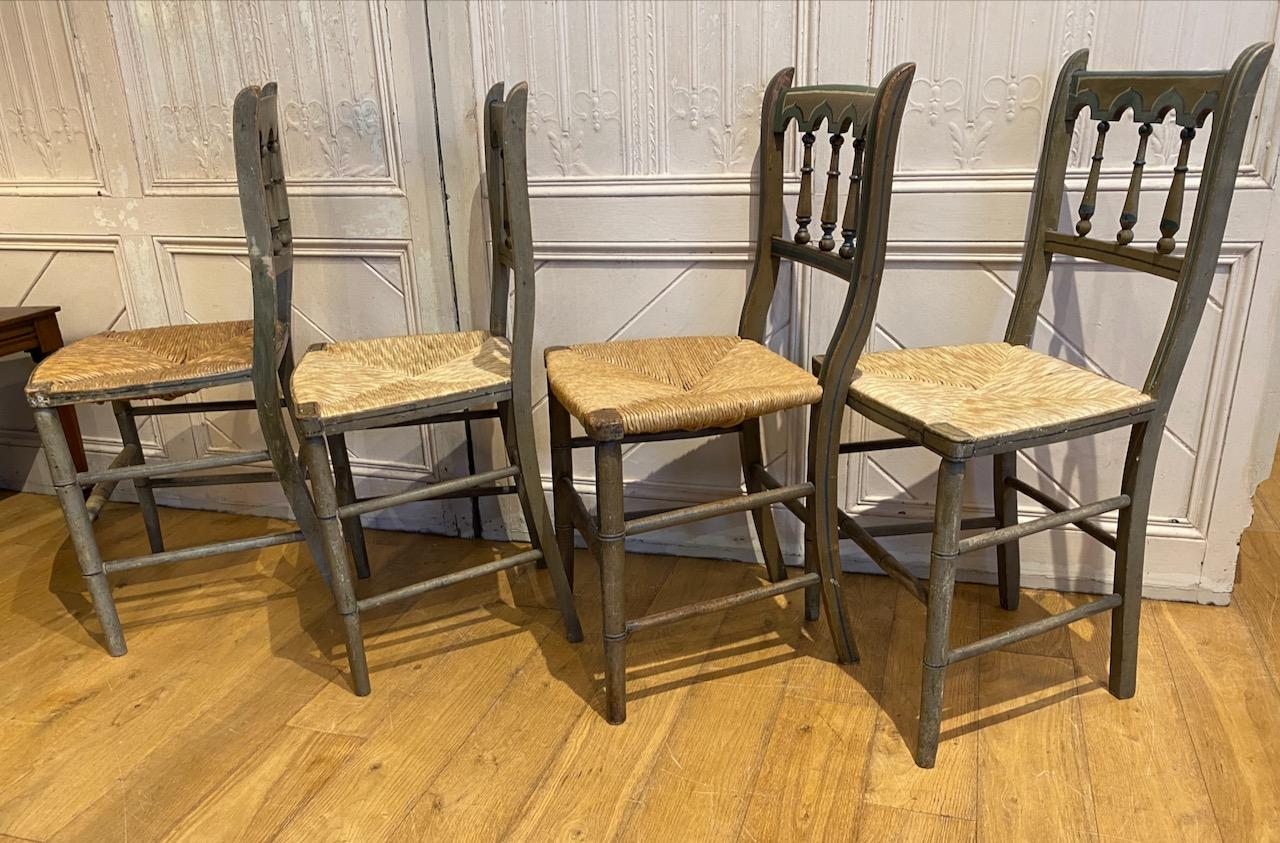 Four Matched Regency Painted Gothic Chairs, with rush seats and original paint with gothic top rails with turned spindle supports, and simulated bamboo legs and stretchers, all painted with blue, white and black line painting on a French grey ground.