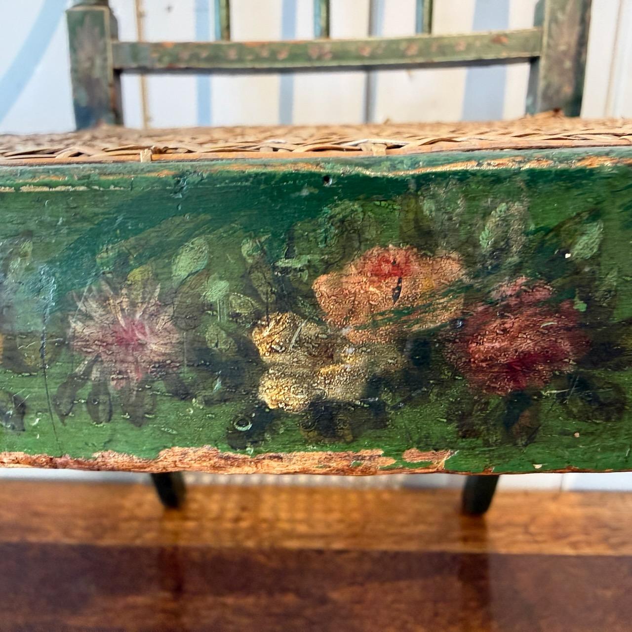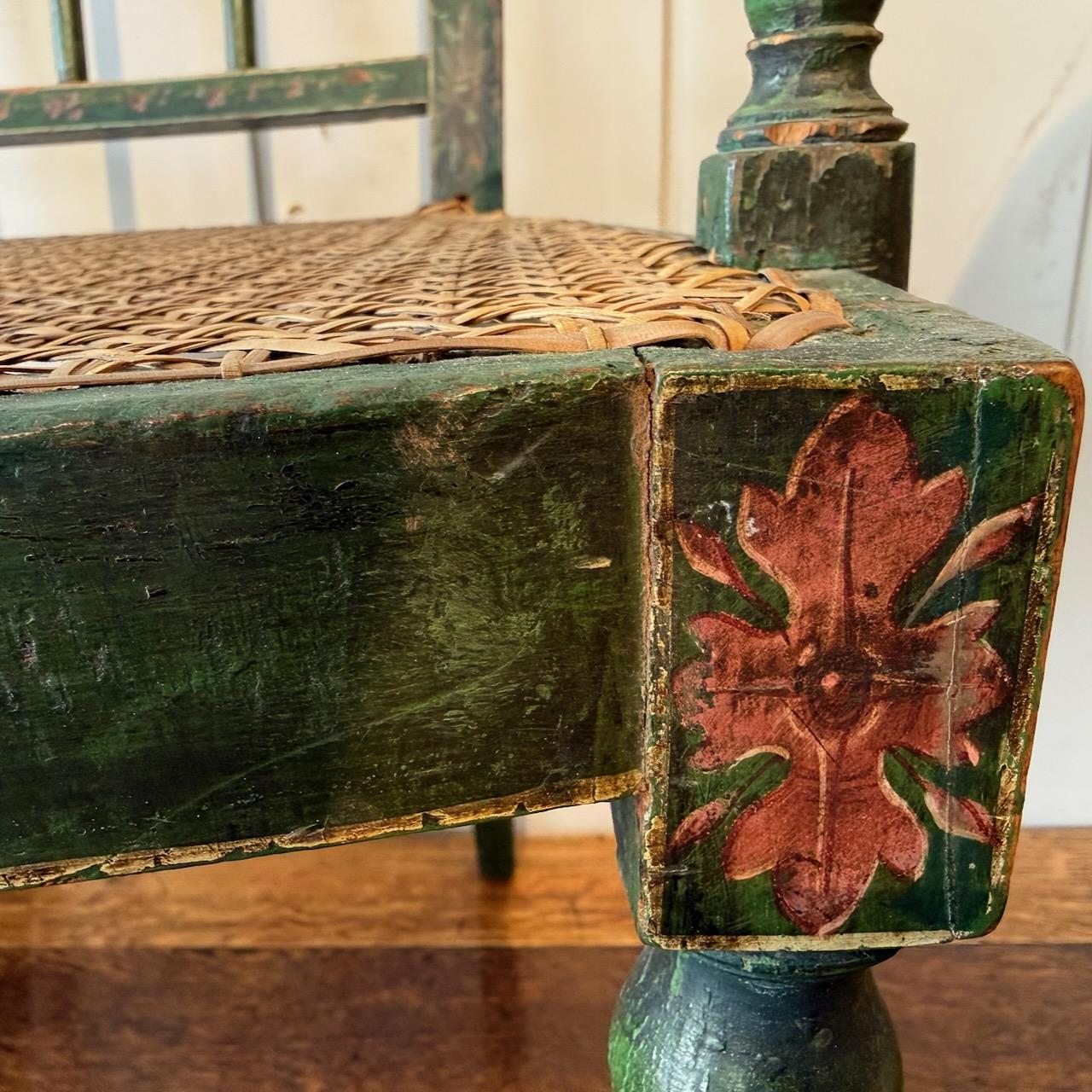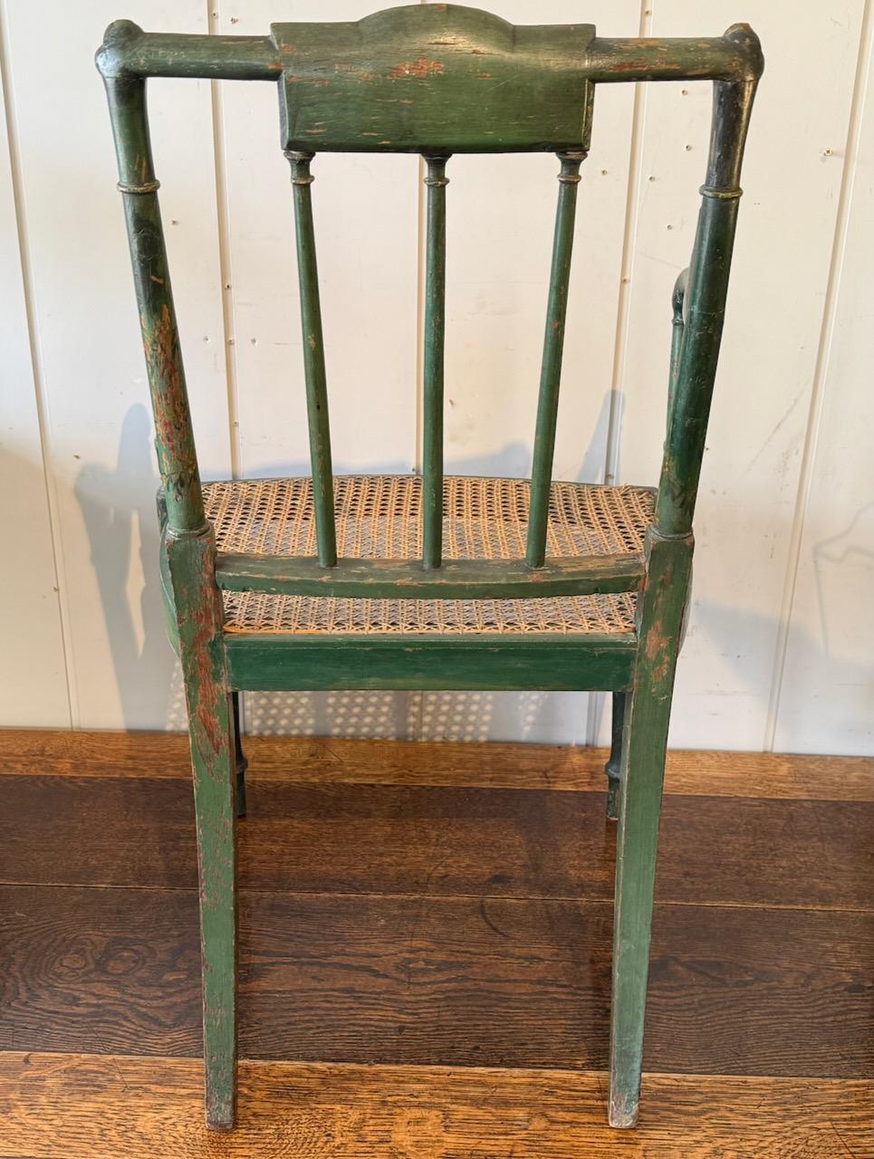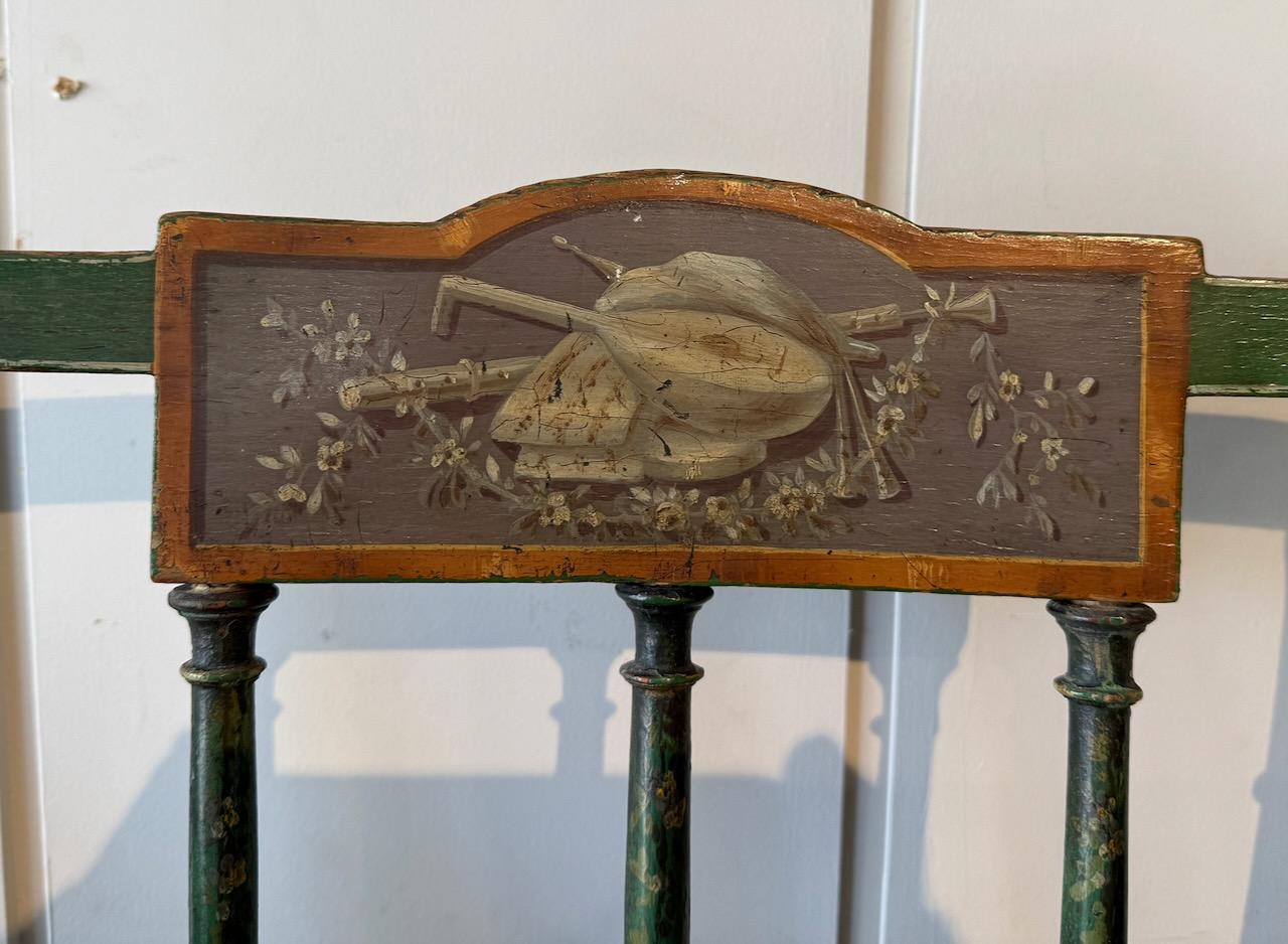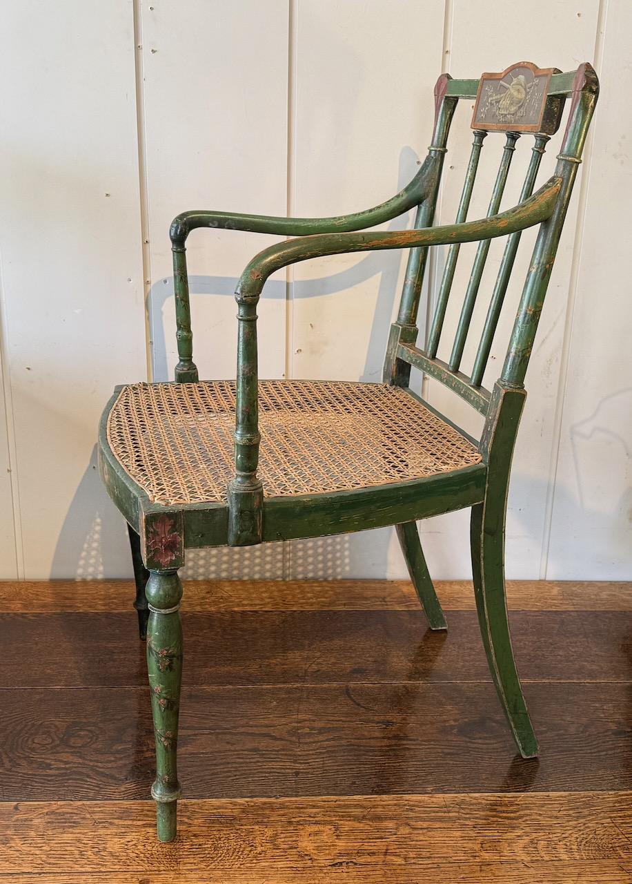 Regency Hepplewhite Chair, with turned frame and cane seat, painted green with floral paintwork and musical instruments to the panel of the top back rail. some restoration has taken place both to the frame and paint surface.
