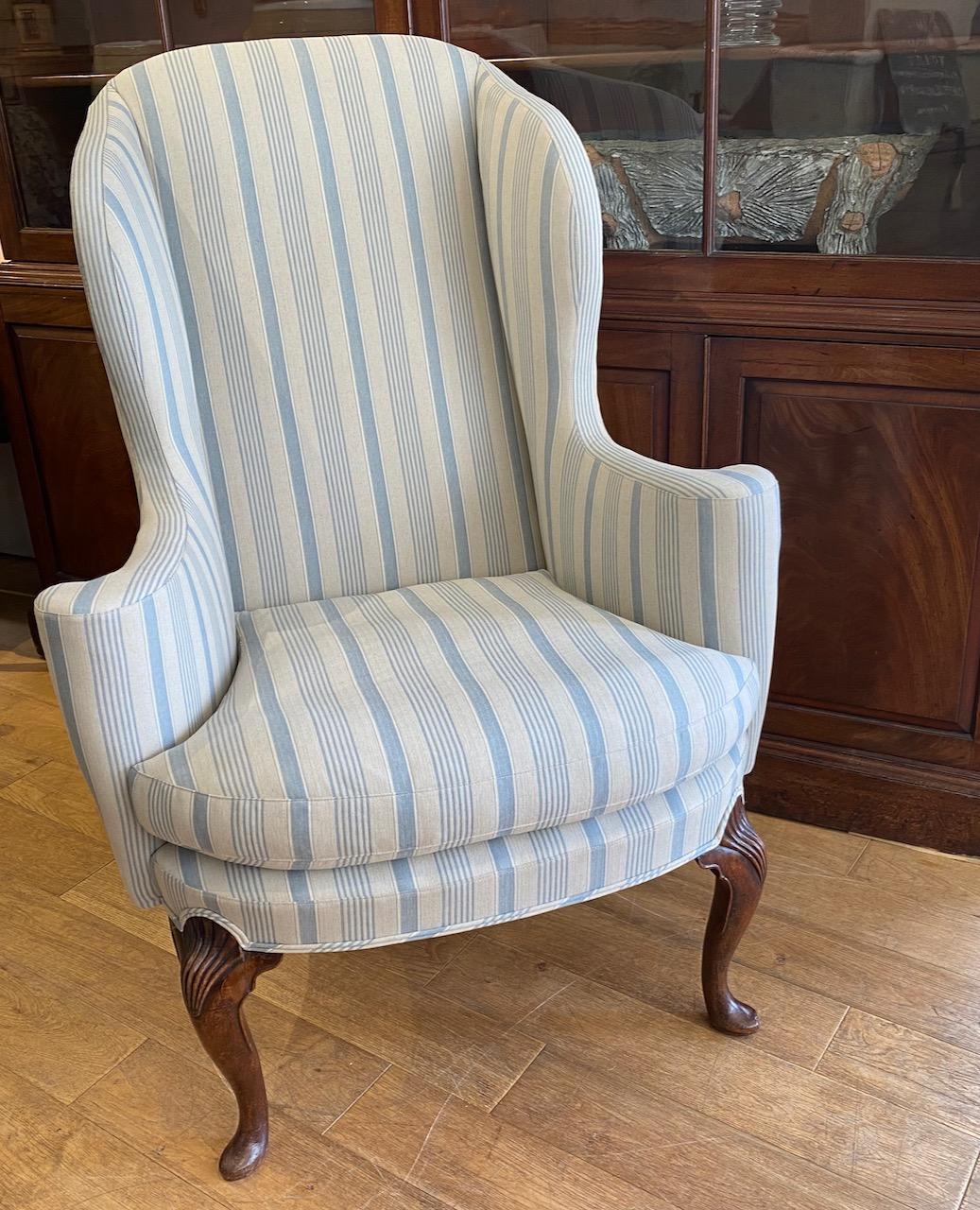 Queen Anne Wing Chair, of elegant form, in fruitwood, with curved back and wings, descending into well roled arm surrounding a comfortable cushioned seat supported by shell carved and eared cabriole front legs with pad feet and back splayed legs with pad feet (both restored well). Newely upolstered in fine striped cotton ticking.