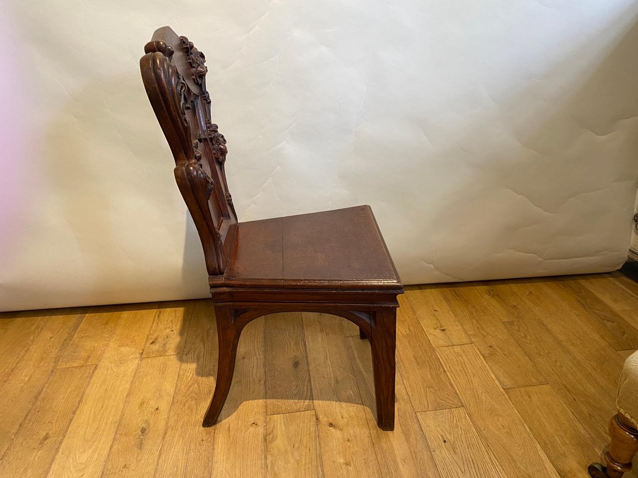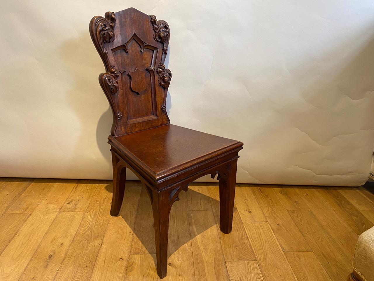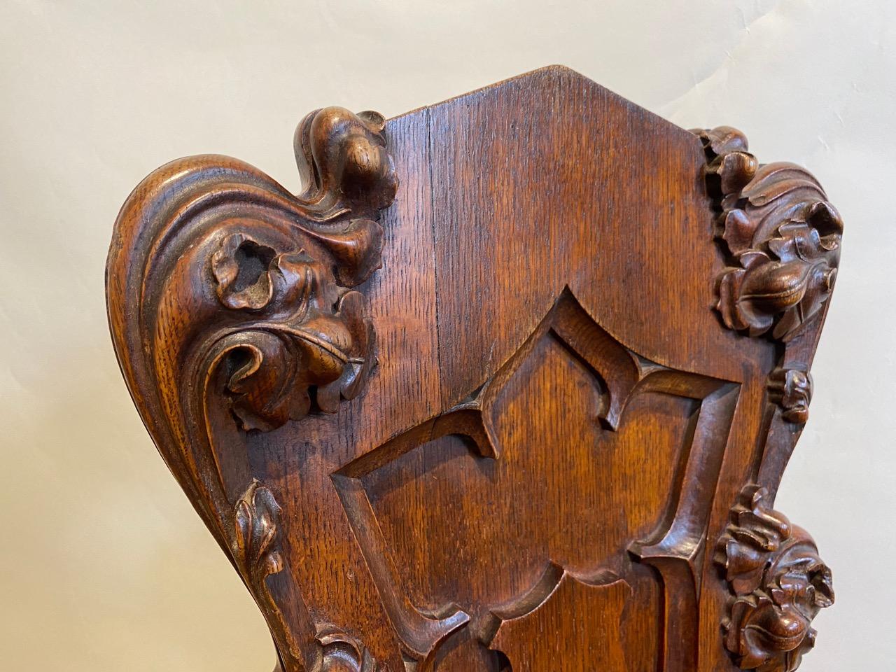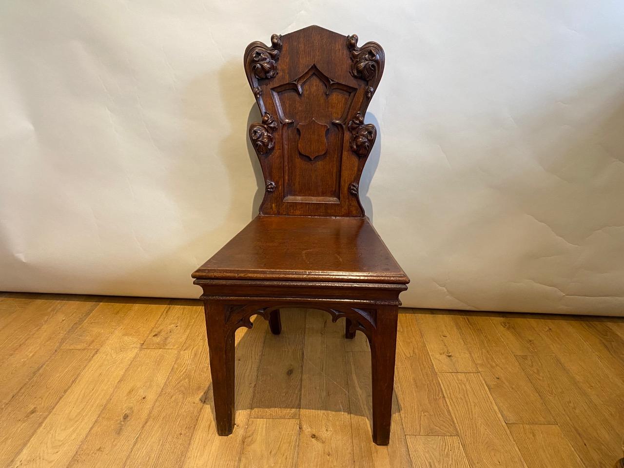 Regency Gothic Revival Hall Seat, in Oak, the back with armorial shield mounted within a recessed gothic panel, and edged with well carved gothic foliate scroles, the seat board with heavy moulded edge above tapering and moulded front legs and splayed moulded back legs, with carved spandrels all round.