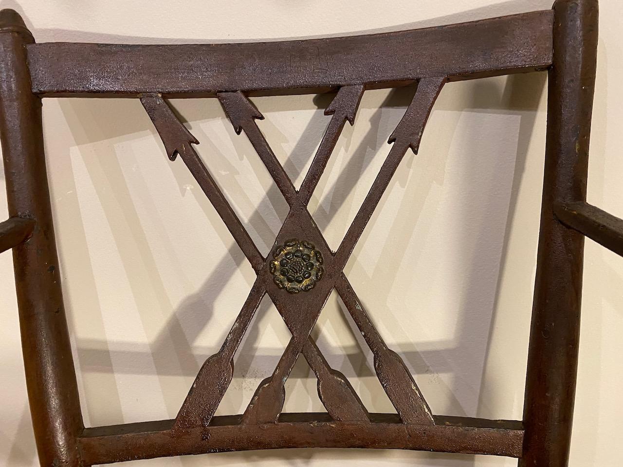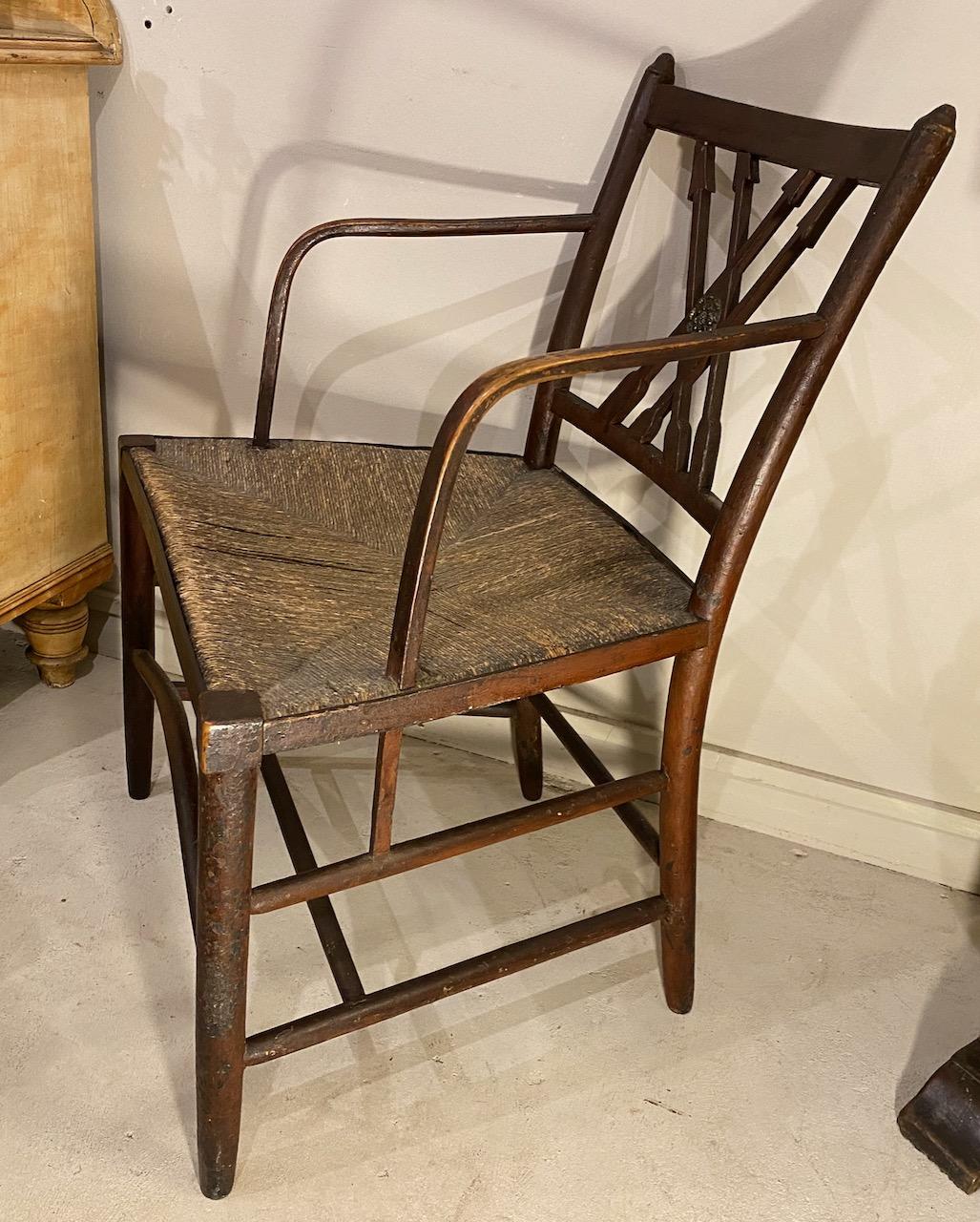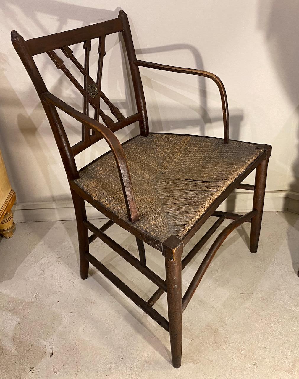 Rare Regency Country Chair in painted Ash,the form an interpretation of the French Empire style, with rush seat, the back with crossed arrows and pressed brass central patera, the arms in steam bent Ash with the post carrying through to the strecher, in the Yealmpton , South Devon manner, the turned legs joined by double stretchers and with a front bow shaped central stretcher.
