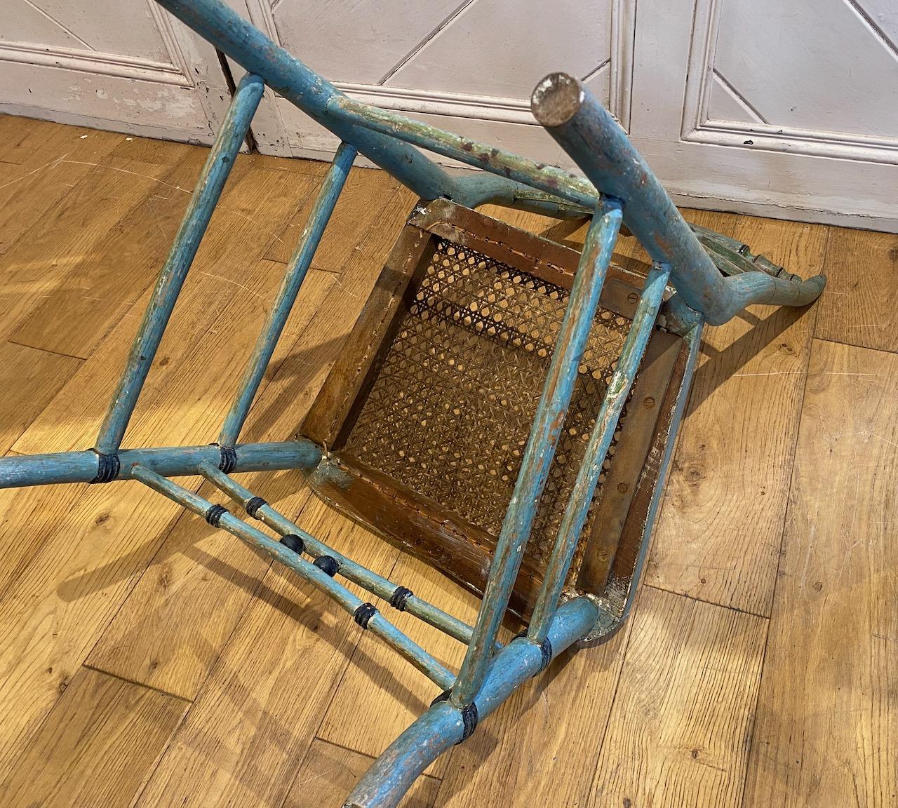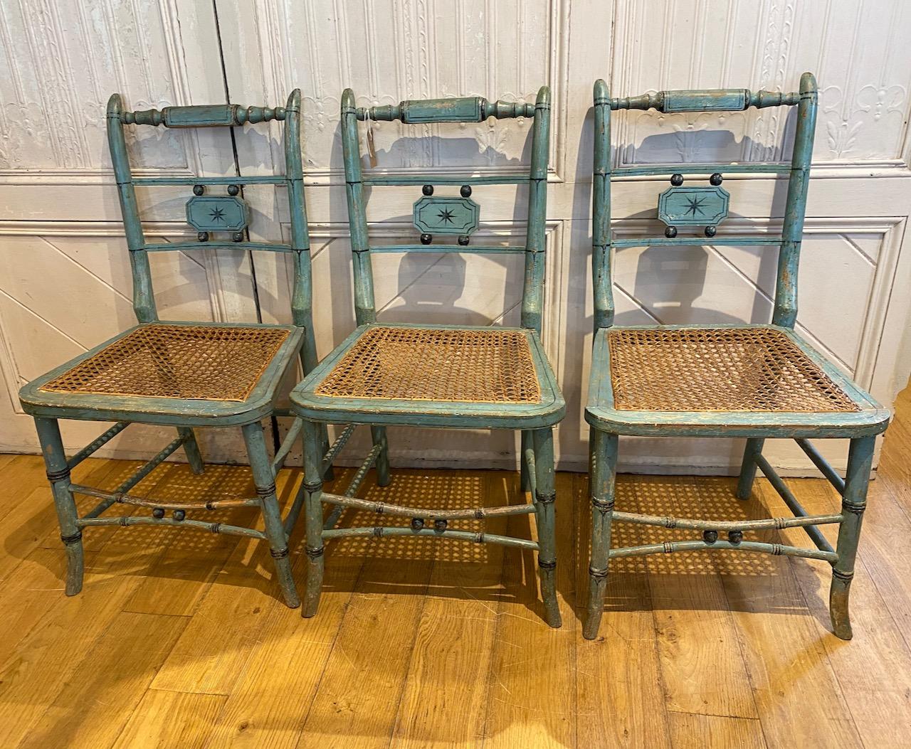 Regency Set of Six Painted Bar Back Dining Chairs. in Beech, with cane seats, the frames turned with rings painted to simulate bamboo al be it in blue paint and black line painting. The backs with a turned bar back top rail above an octagonal star painted panel held between ebonised balls and line painted rails, the cane seats with line painted frames with rounded corners, the front with opposing bowed stretchers held apart by a pair of ebonised balls, the sides with a pair of plain turned stretchers. One chair has been metalled to strengthen the seat rail, the chairs are structurally sound but fragile and would need squab cushions for the seats. The wonderful pale blue colour is a rare colourway.