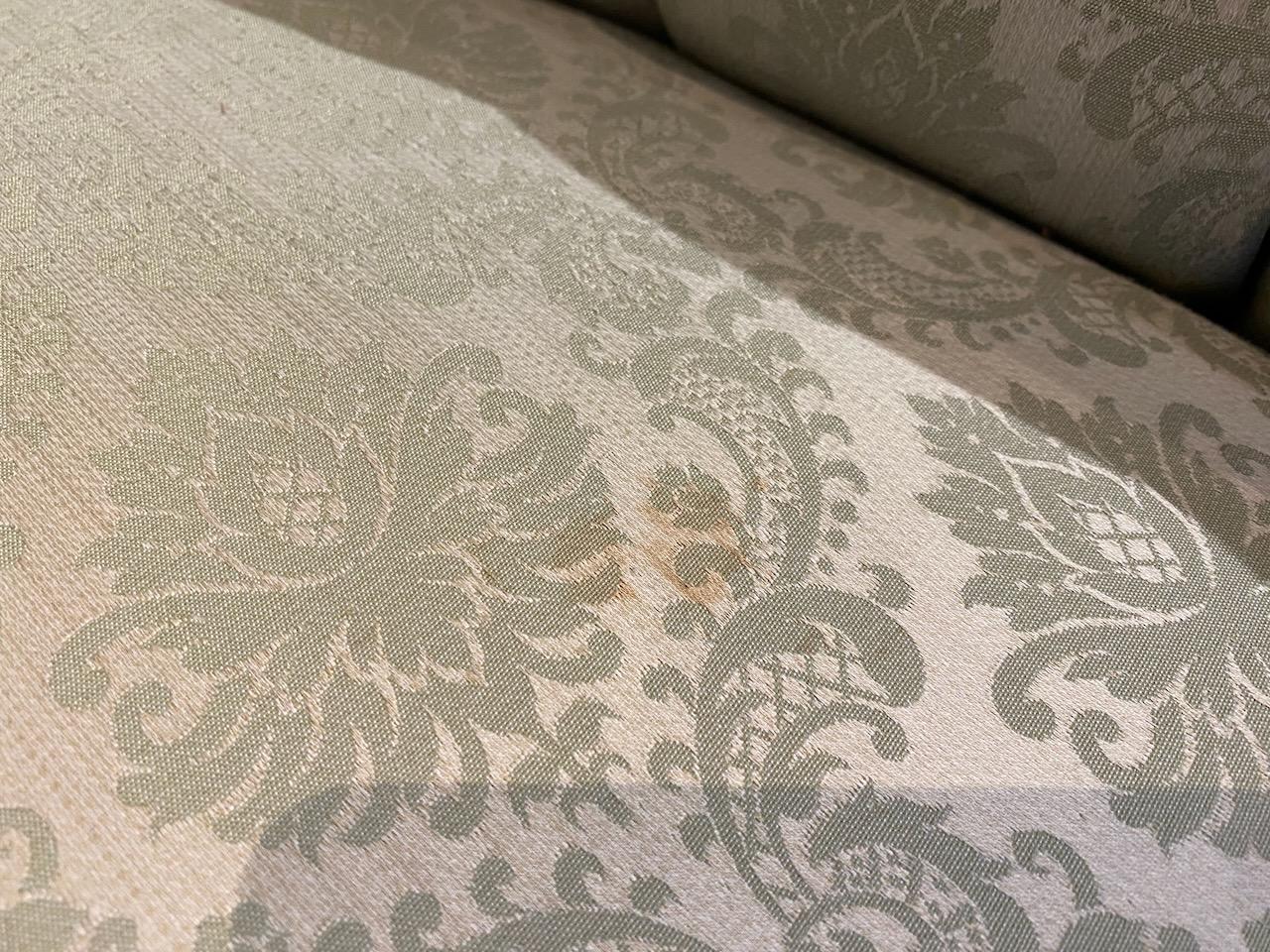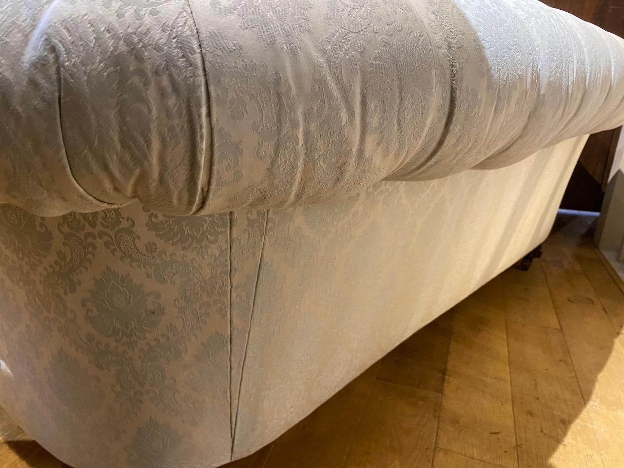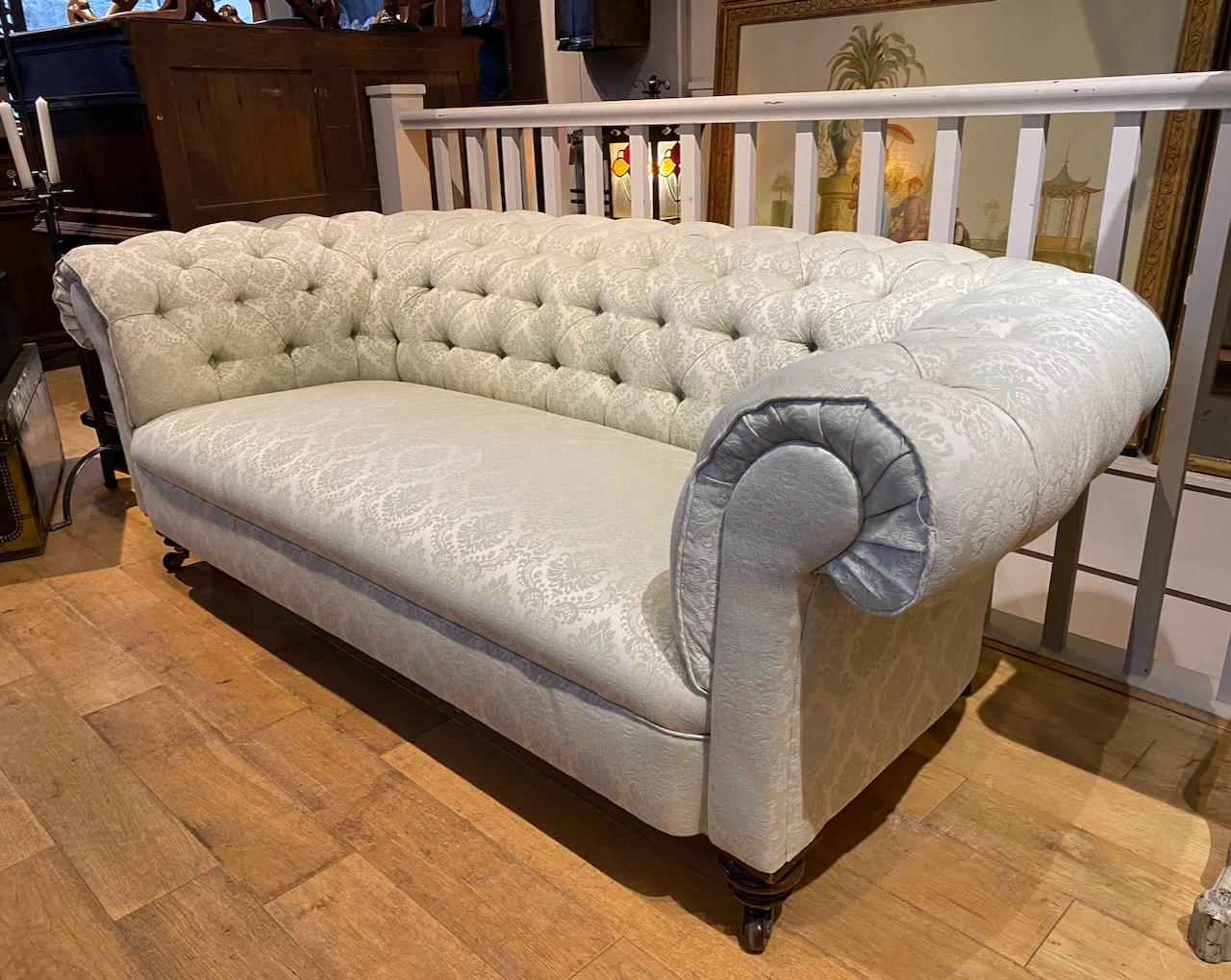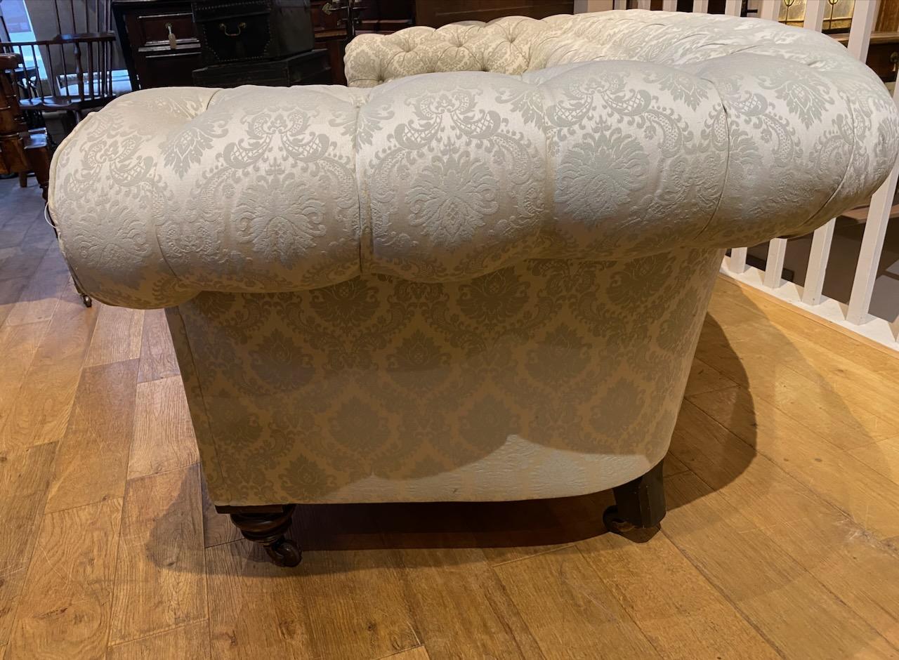 Victorian Chesterfield Sofa, with Mahogany turned feet and original brass and china casters, upholstered in cotton damask which has been deep buttoned. the sofa was bought already upholstered and there is a very small mark on the seat and slight inperfections to the piping but otherwise it is in good condition.