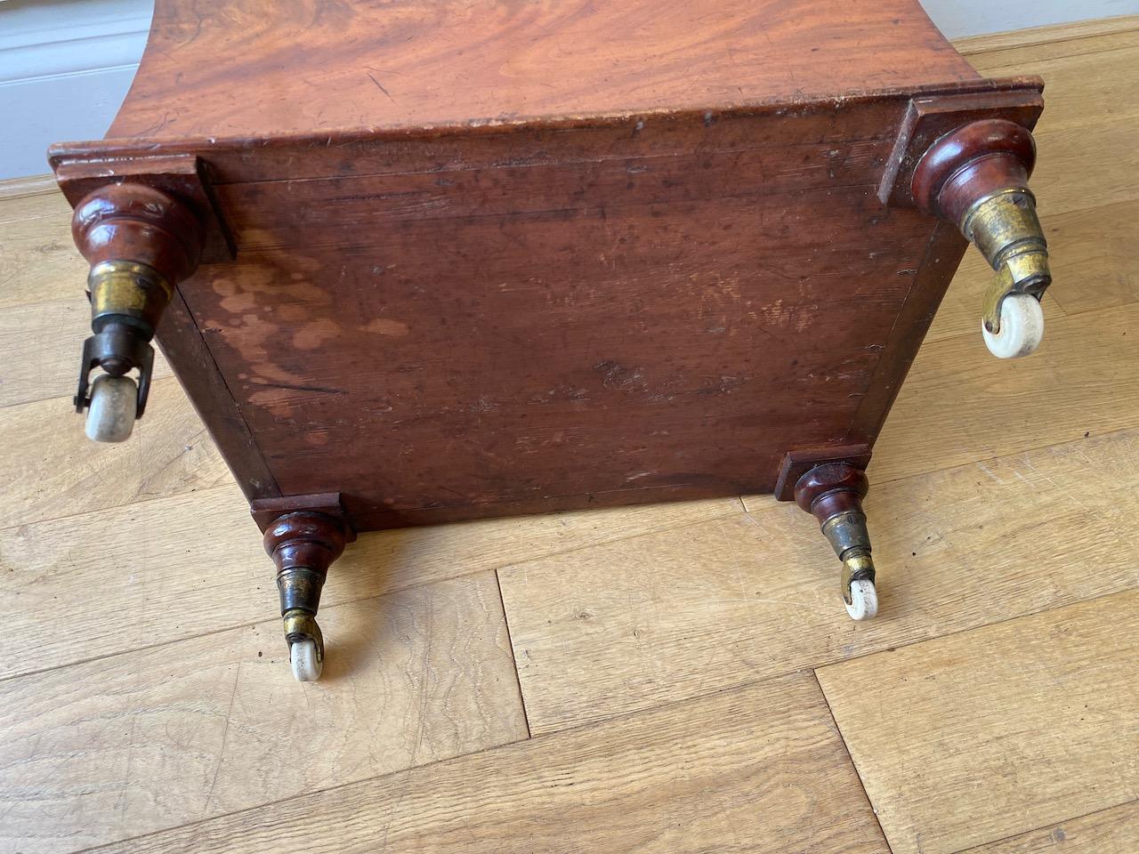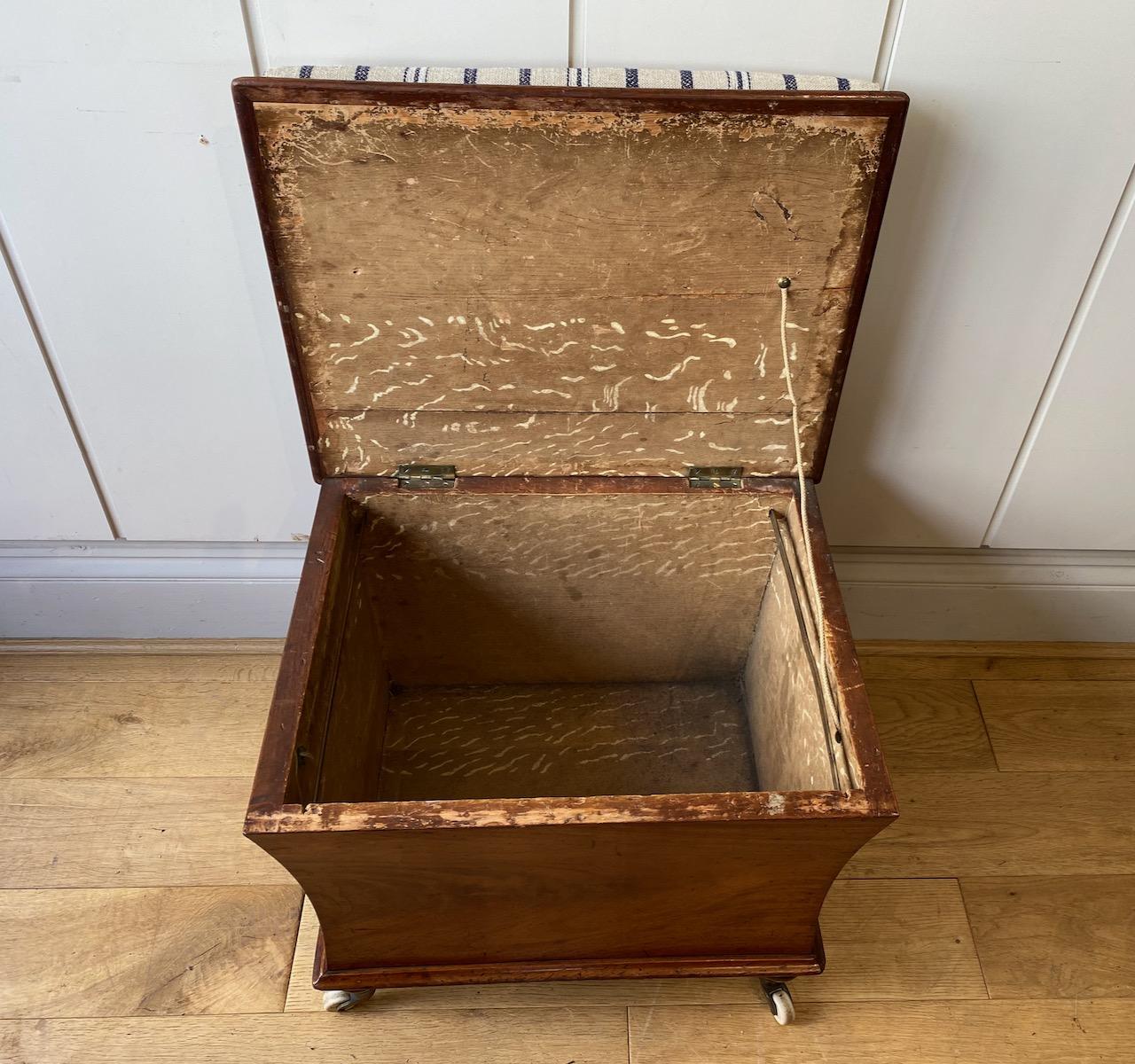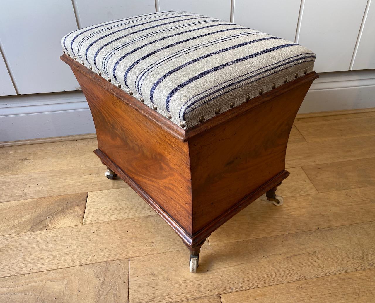 William IV Mahogany Ottoman of petit size, the concave shaped sides veneered with faded flame Mahogany, and trimmed with baase mould, the box sitting on turned feet with brass and china cup casters, the hinged top upholstered with blue striped linen surrounded by a mahogany mould and hinged to lift and open to reviel a interior lined with wood grain paper and later fitted with metal rails for suspending files.