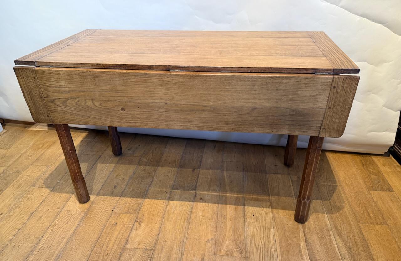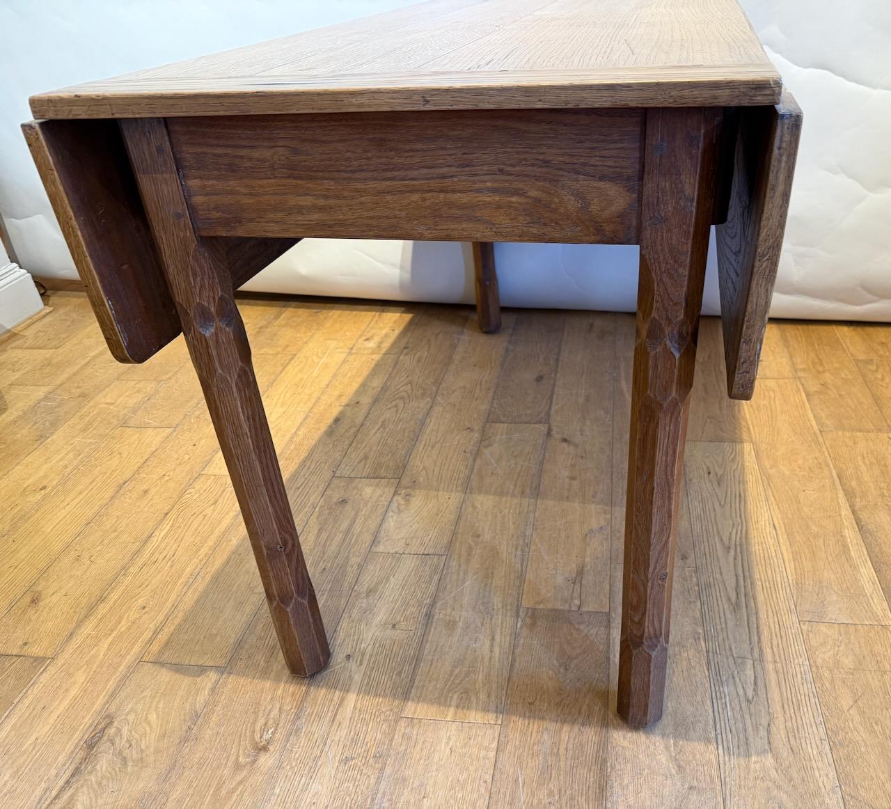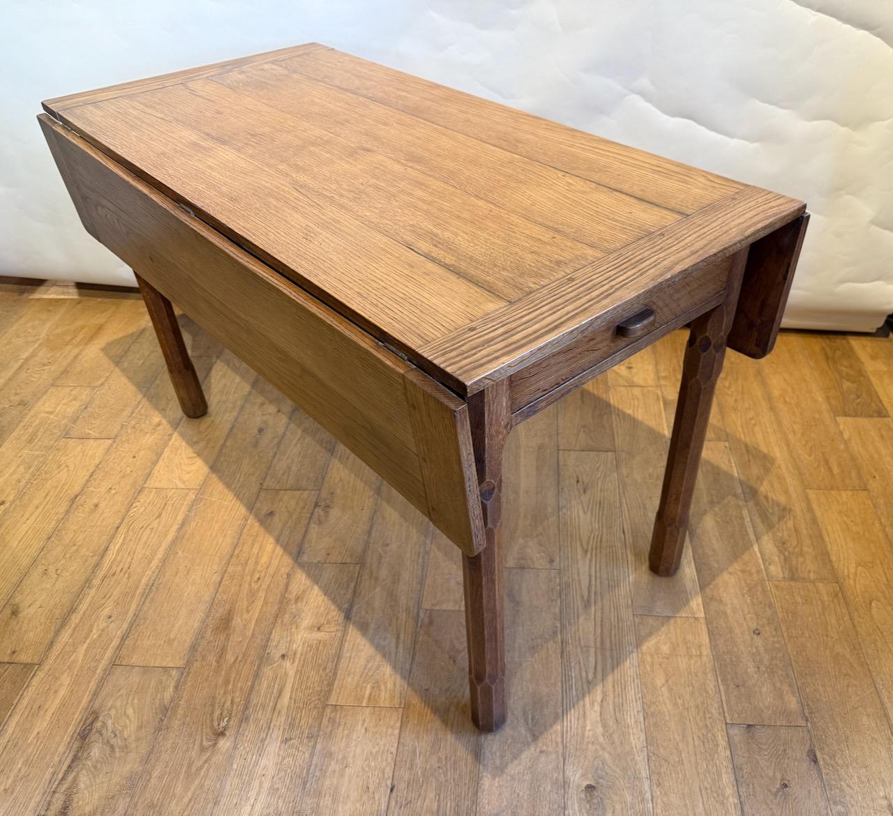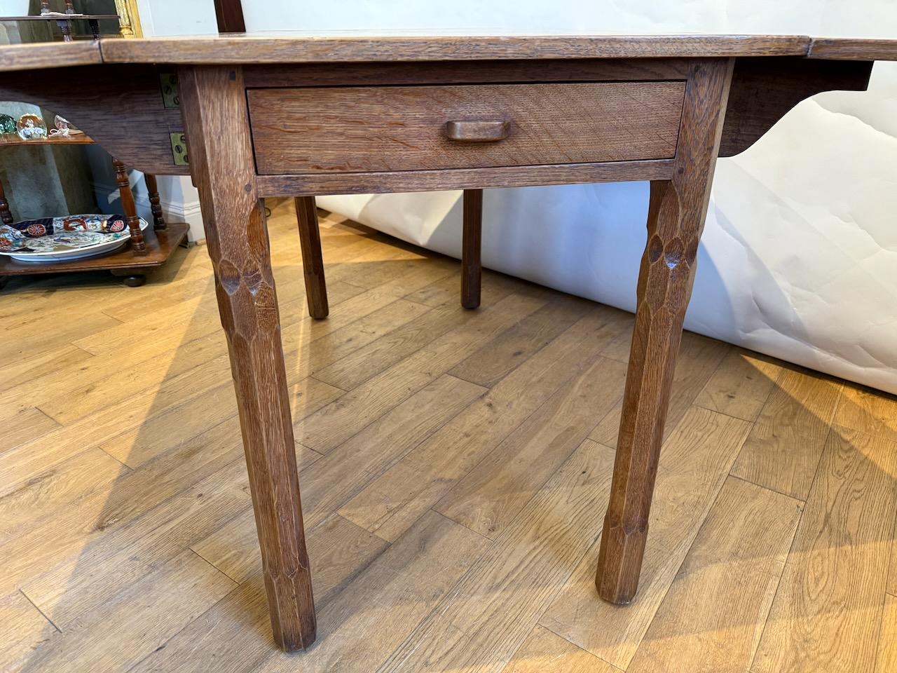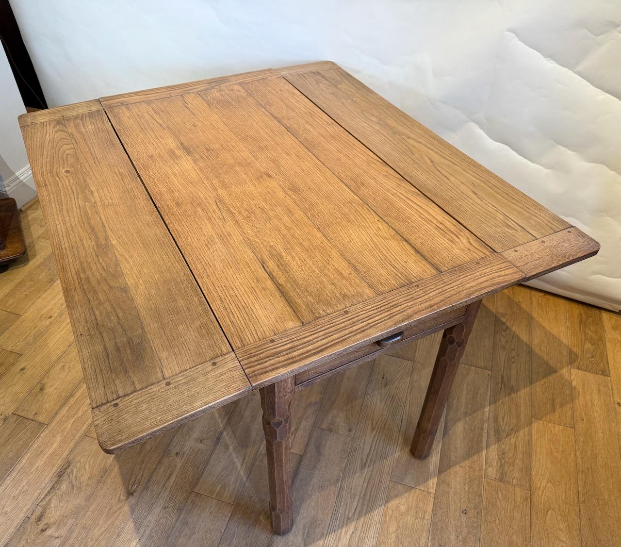 Arts and Crafts Drop Leaf Table, in the manner of Arthur Romney Green, the pegged and cleated top with two matching drop flaps which can be raised on hinged lopers, all supported on four stout legs which are heavily shamfered in very decorative way. At one end there is a frieze drawer with simple pull handle.