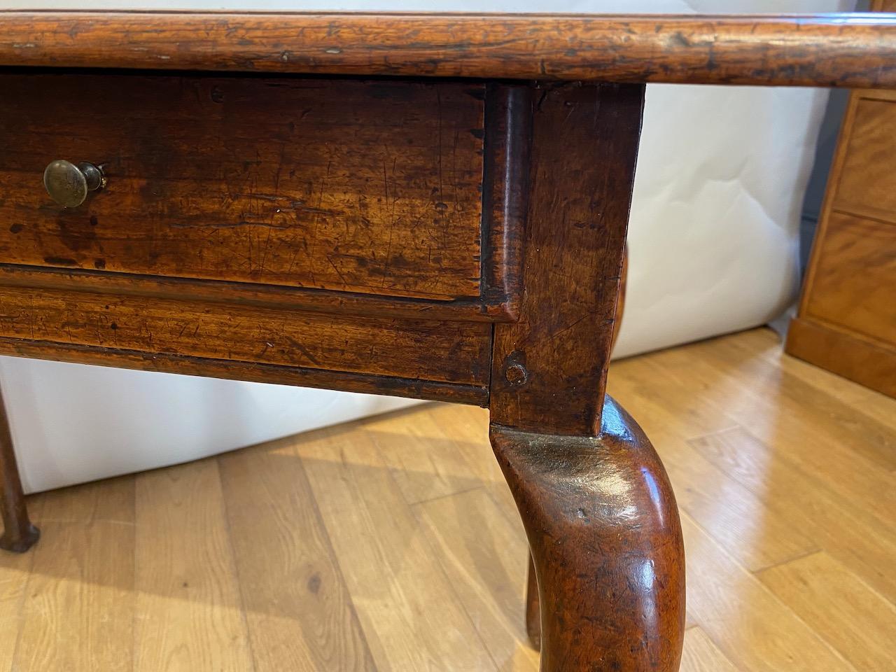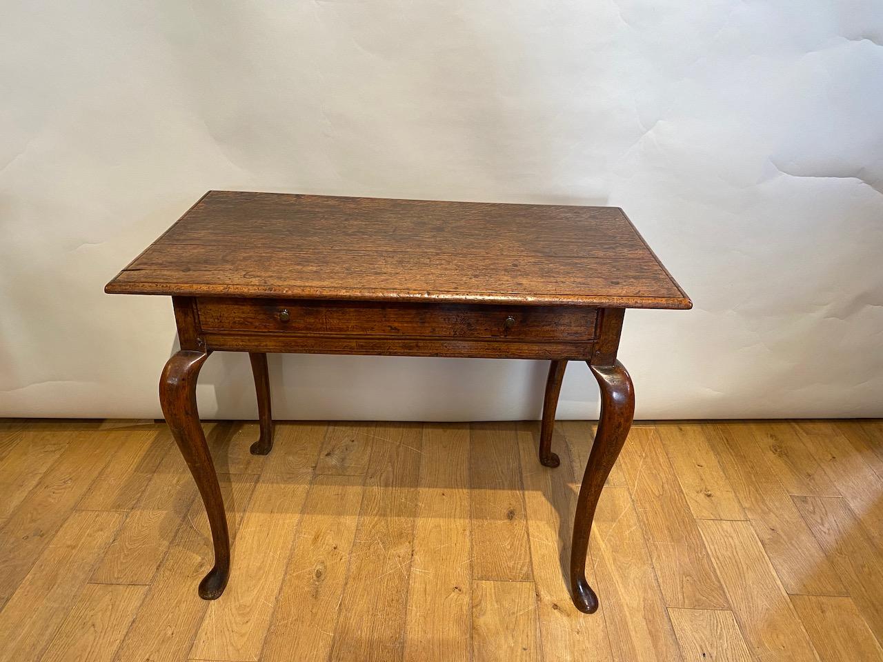 George I Side Table, in Fruitwood and Oak, the Oak top with moulded edge on a Cherry wood frame with a frieze drawer also in Fruitwood with pine linings and with original brass pull handles, supported on cabriole legs back and front, of exceptional fluid form, on pad feet.