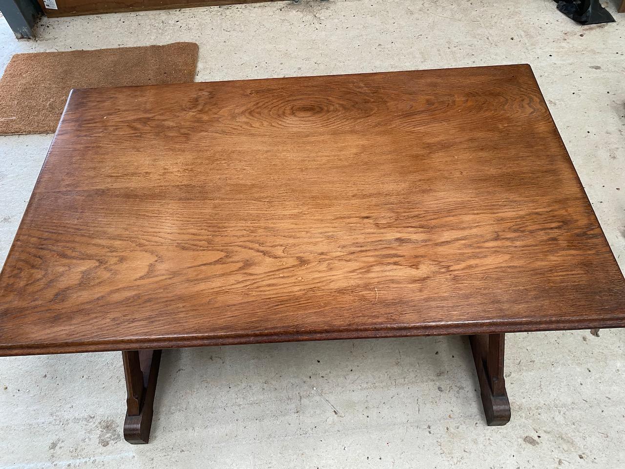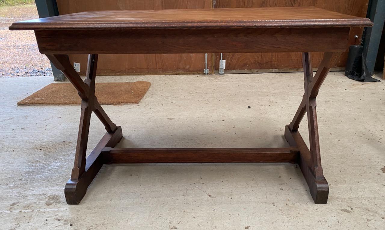 William IV Gothic Revival Table, in Oak, the moulded rectangular plank top above a narrow all round frieze apron, supported on X framed end supports with chamfering , on sledge feet which are joined to each other with a centre chamfered stretcher.