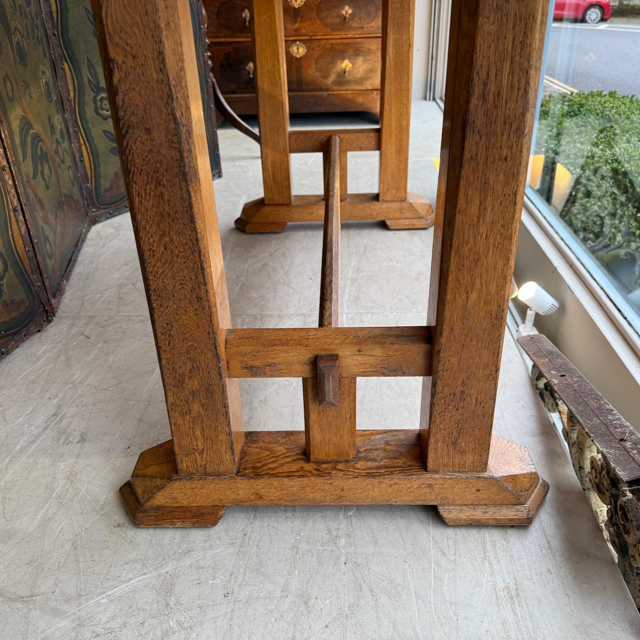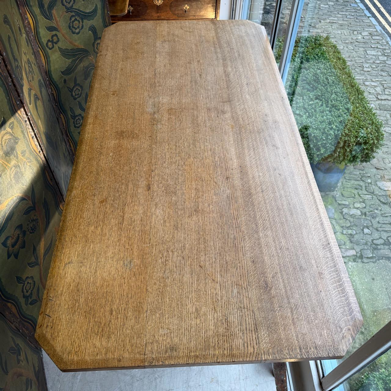 Refectory Table in the Heals style, in light Oak, the top with chamfered edge and canted corners, supported on four chamfered legs each pair joined by a chamfered stretcher and central tie on sledge feet with faceted feet and further joined by a central stretcher