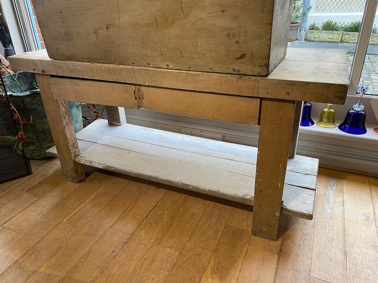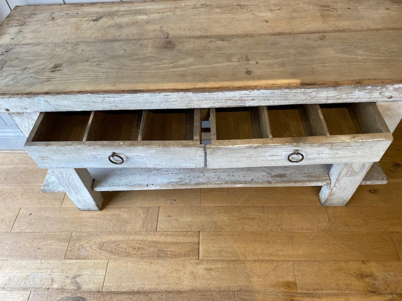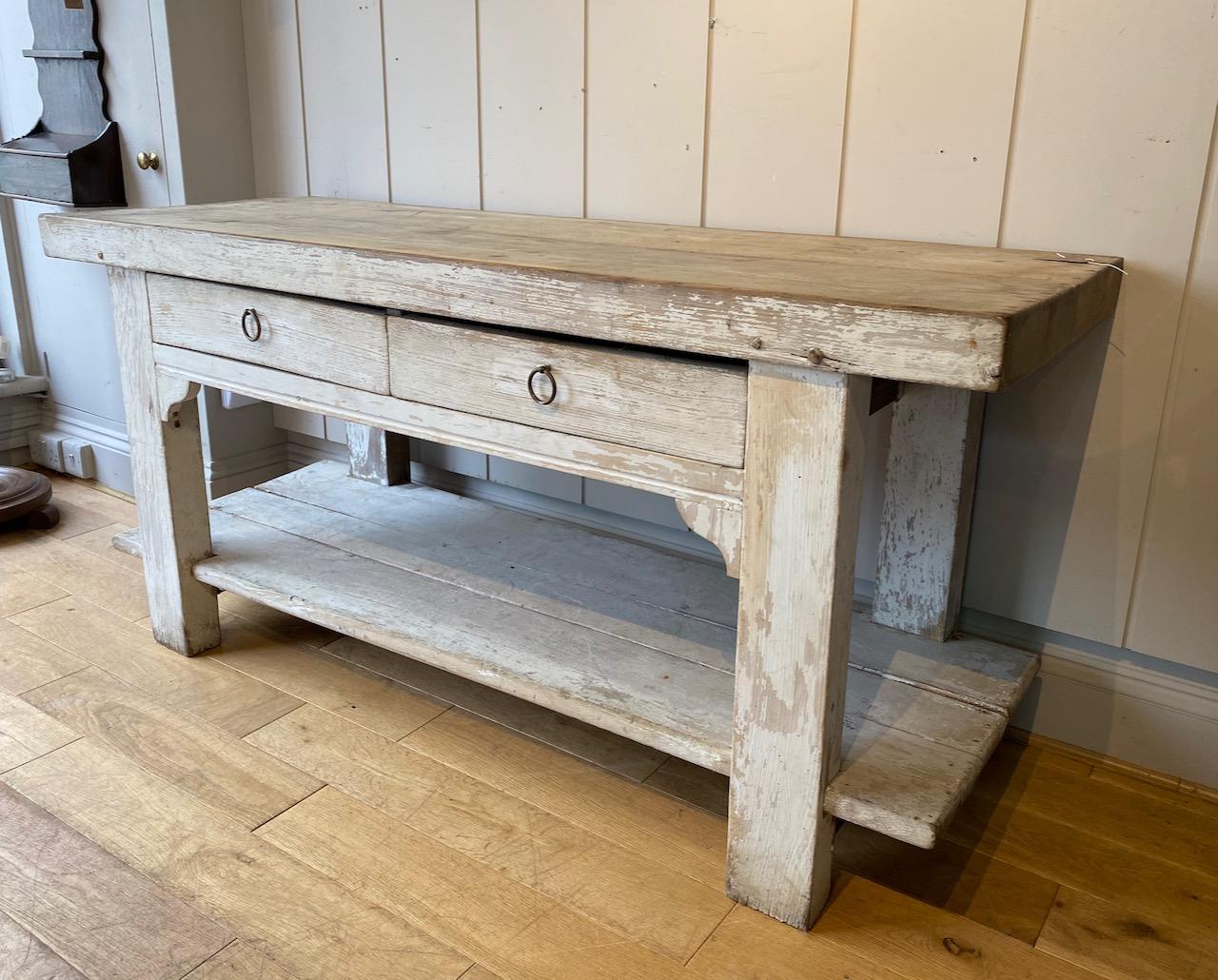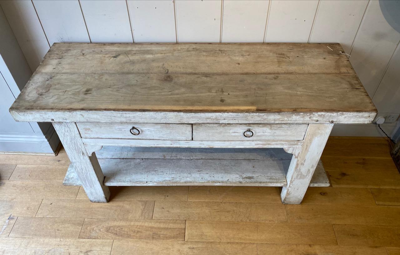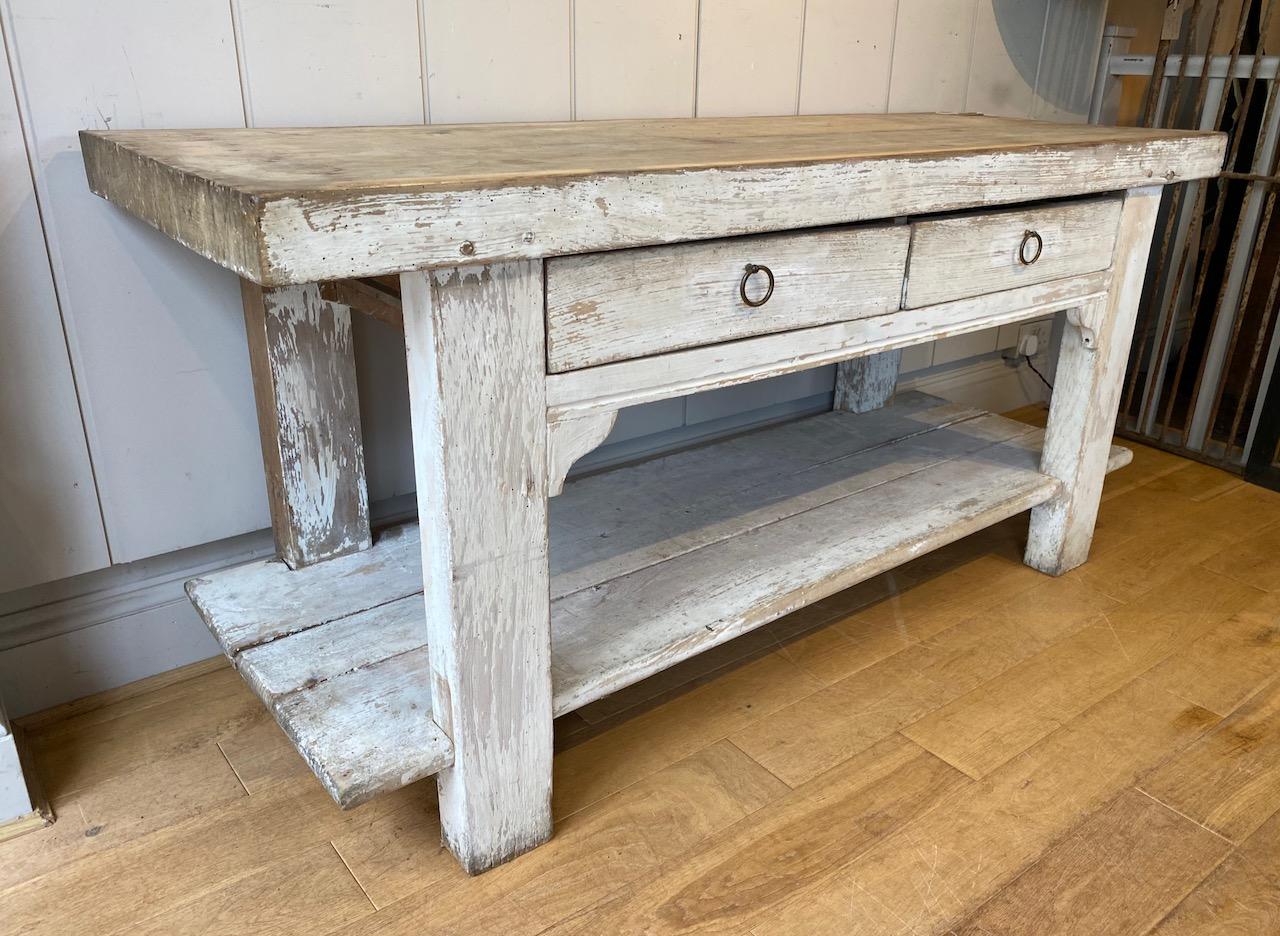 Limed Washed Butcher's Table, in Beech, the thick two plank top supported on 4 chunky square legs, tennoned and pegged to the top, with two drawers, fitted with divisions, in between, with ring handles, with two plank overhanging shelf below.