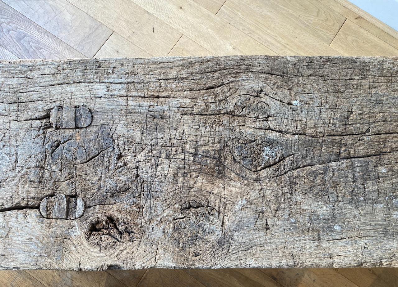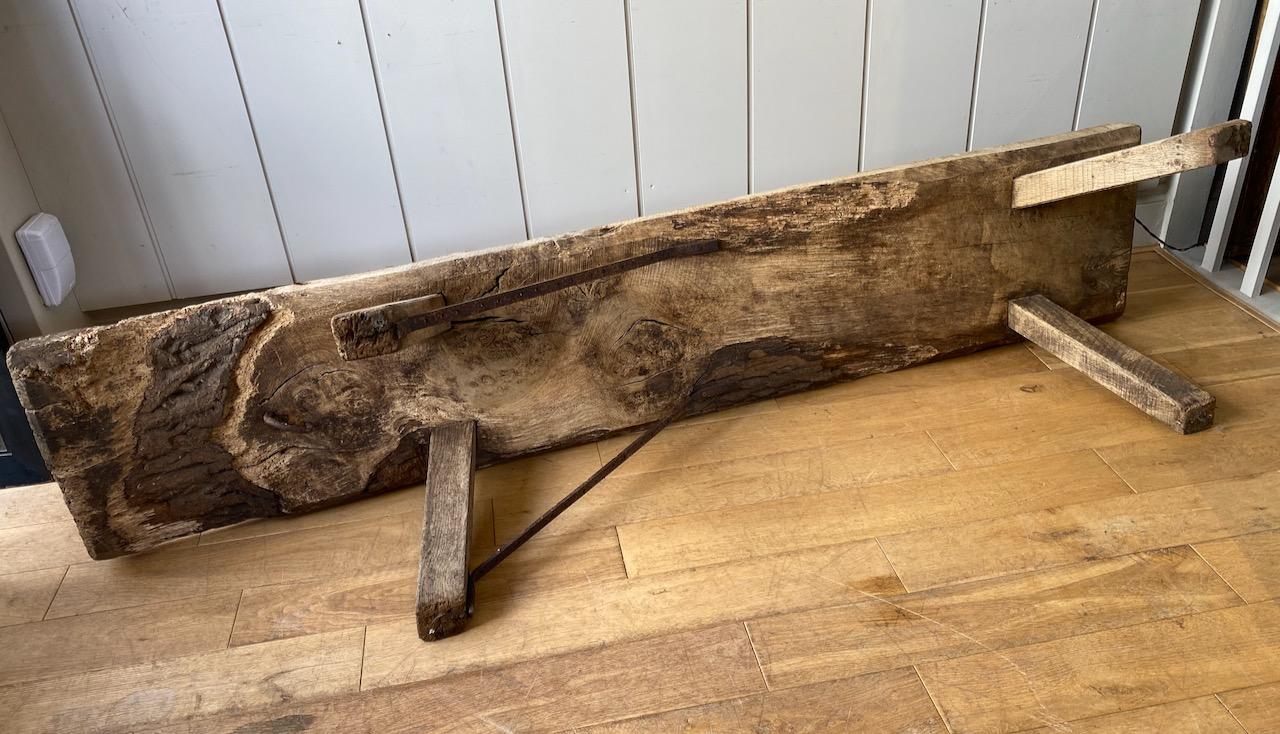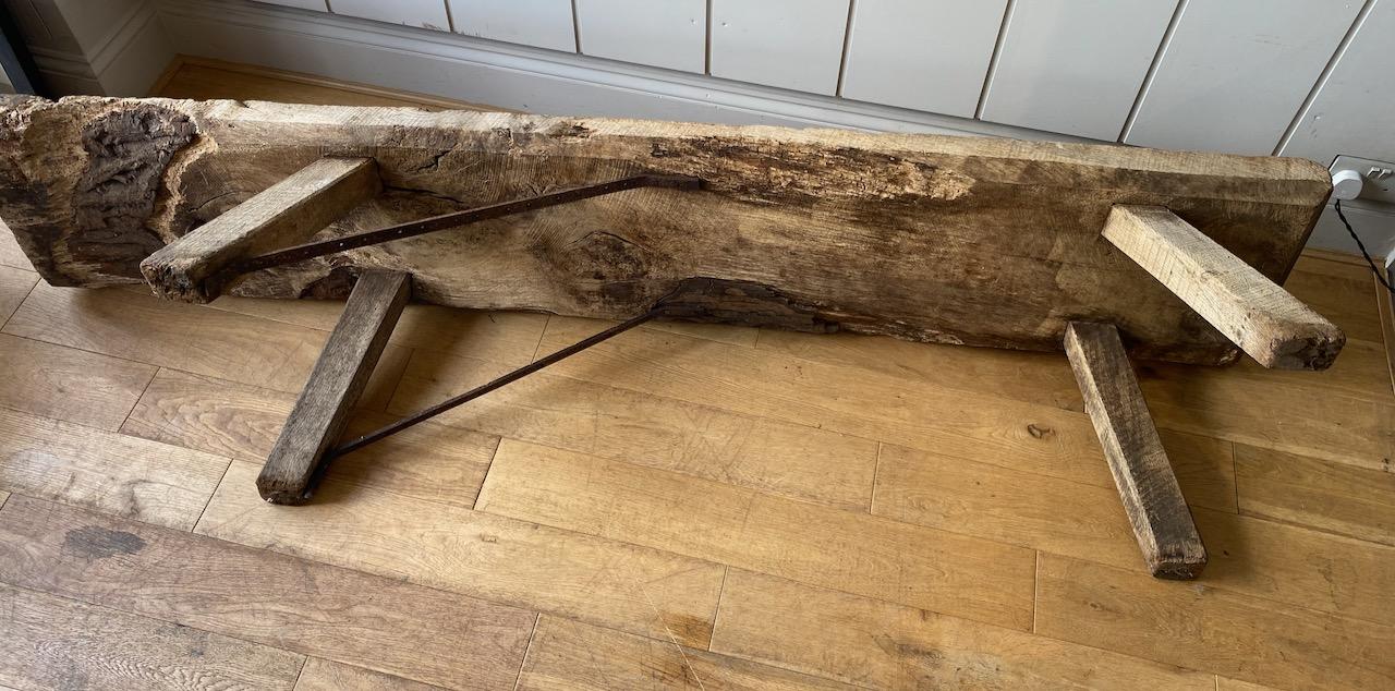 Victorian Pig Bench, in weathered Oak, the thick plank top with all round under chamfered edge supported on angled tenoned post legs, the top overhanging more at one end, the bench with two iron braces and tiron tethering ring underneath.