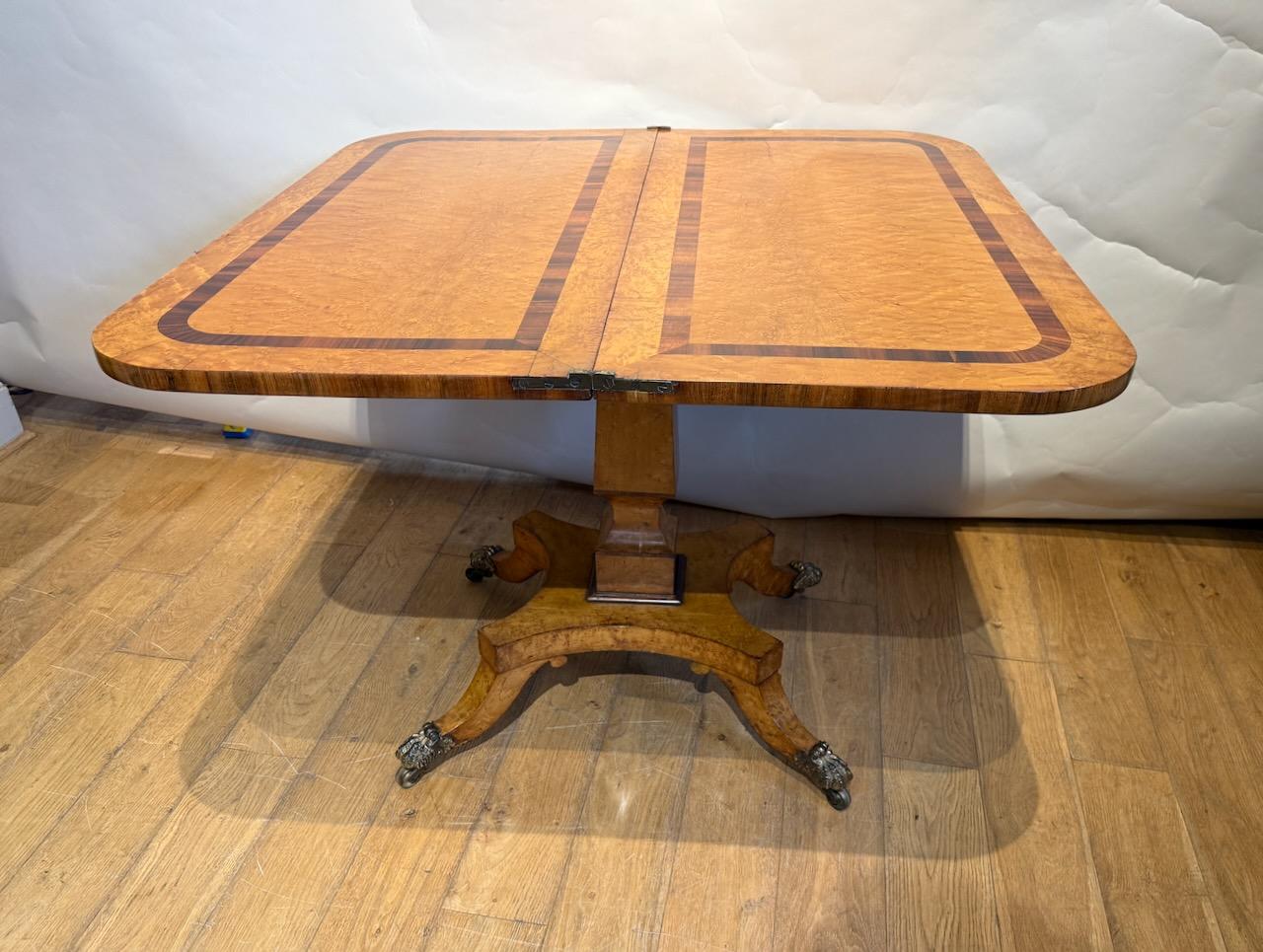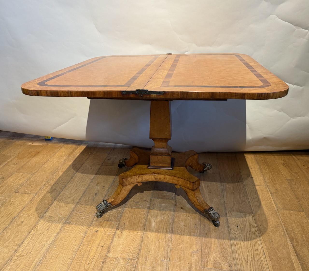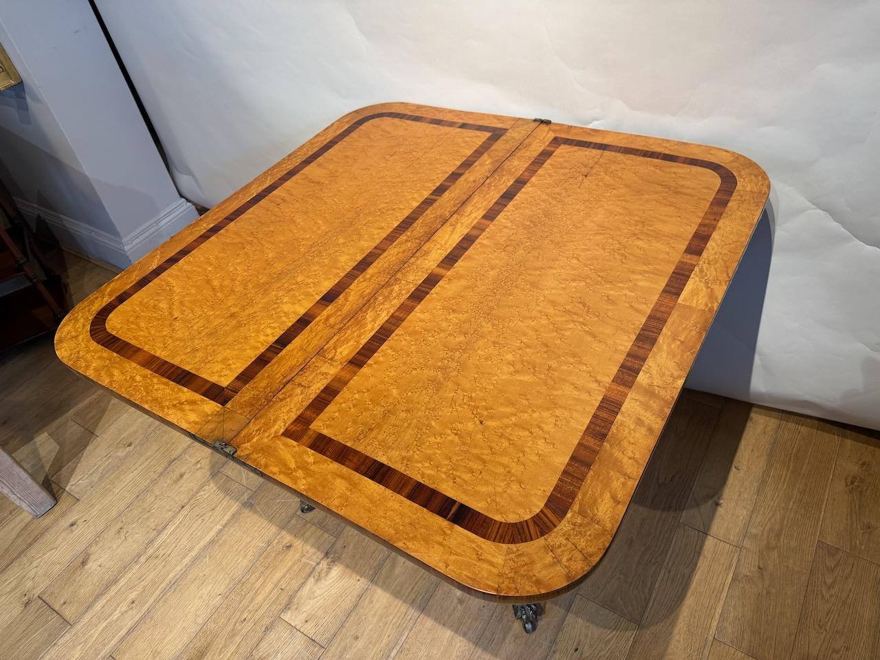 George IV Tea Table, in Birds eye Maple, cross banded with Concalo Alves (Tiger Wood), the top with rounded front corners and in two parts hinged together, which when opened up, reveils a magnificant veneered Birds Eye Maple surface cross banded with Tiger Wood. The top sits on a baeze lined and veneered freize box with shaped ends, in turn supported on a squared urn shaped column attached to a platform base on scrole feet, with gilt brass claw foot casters.