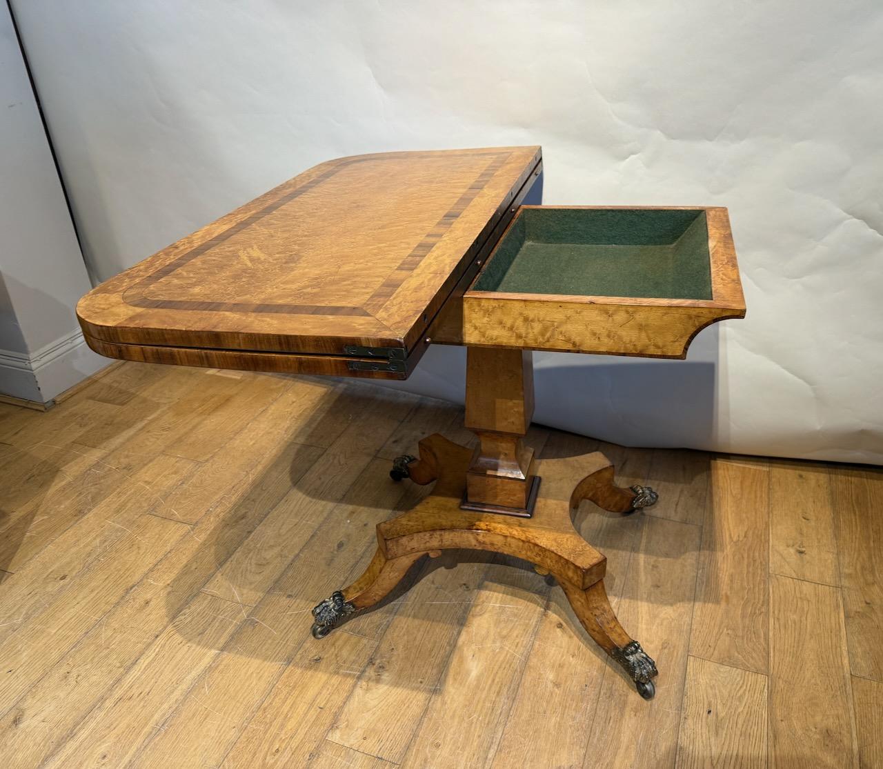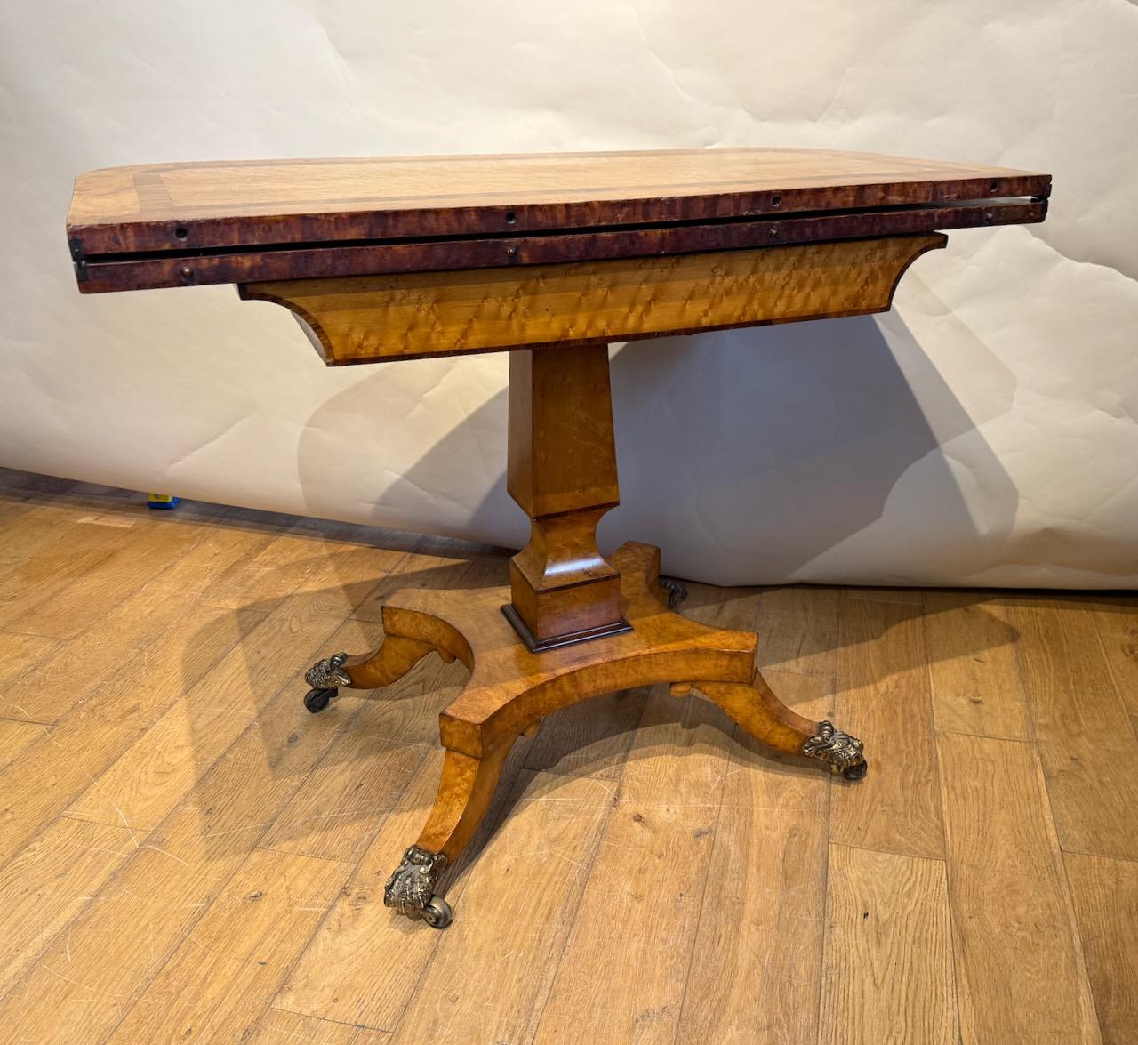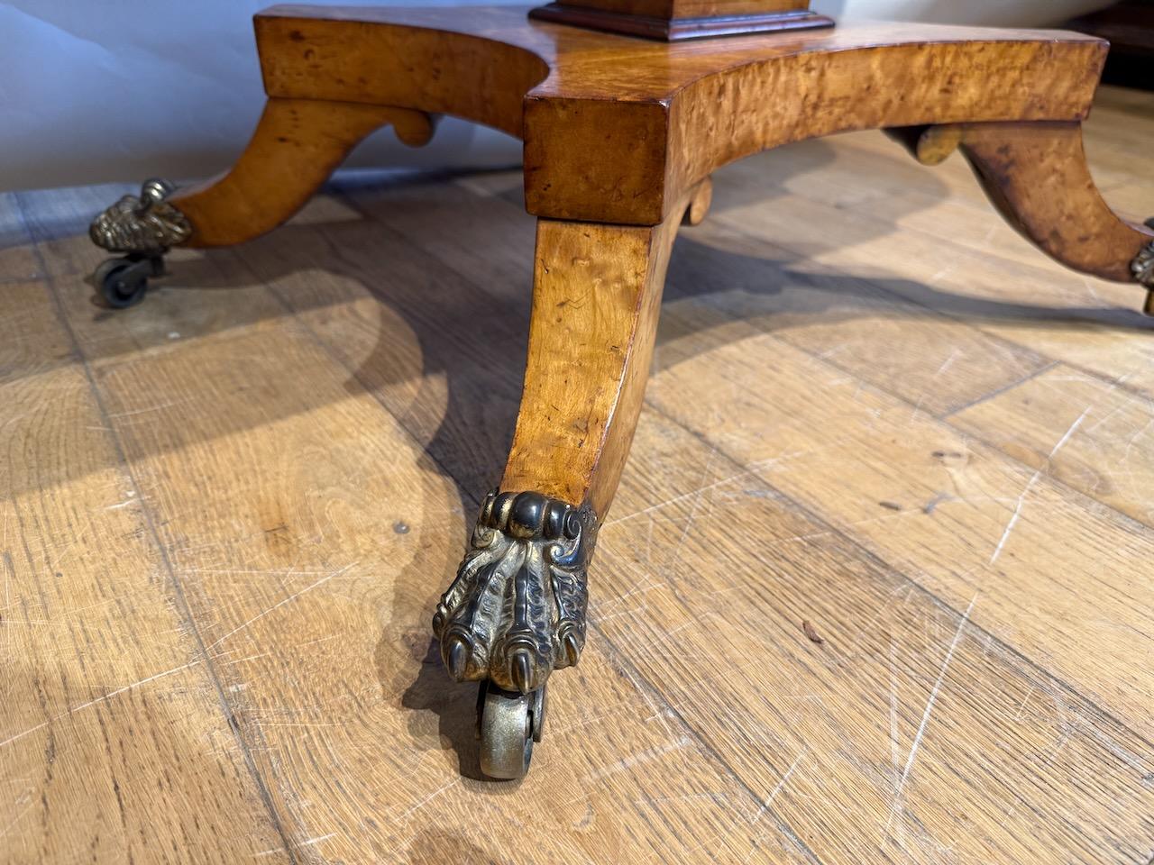 George IV Tea Table, in Birds eye Maple, cross banded with Concalo Alves (Tiger Wood), the top with rounded front corners and in two parts hinged together, which when opened up, reveils a magnificant veneered Birds Eye Maple surface cross banded with Tiger Wood. The top sits on a baeze lined and veneered freize box with shaped ends, in turn supported on a squared urn shaped column attached to a platform base on scrole feet, with gilt brass claw foot casters.