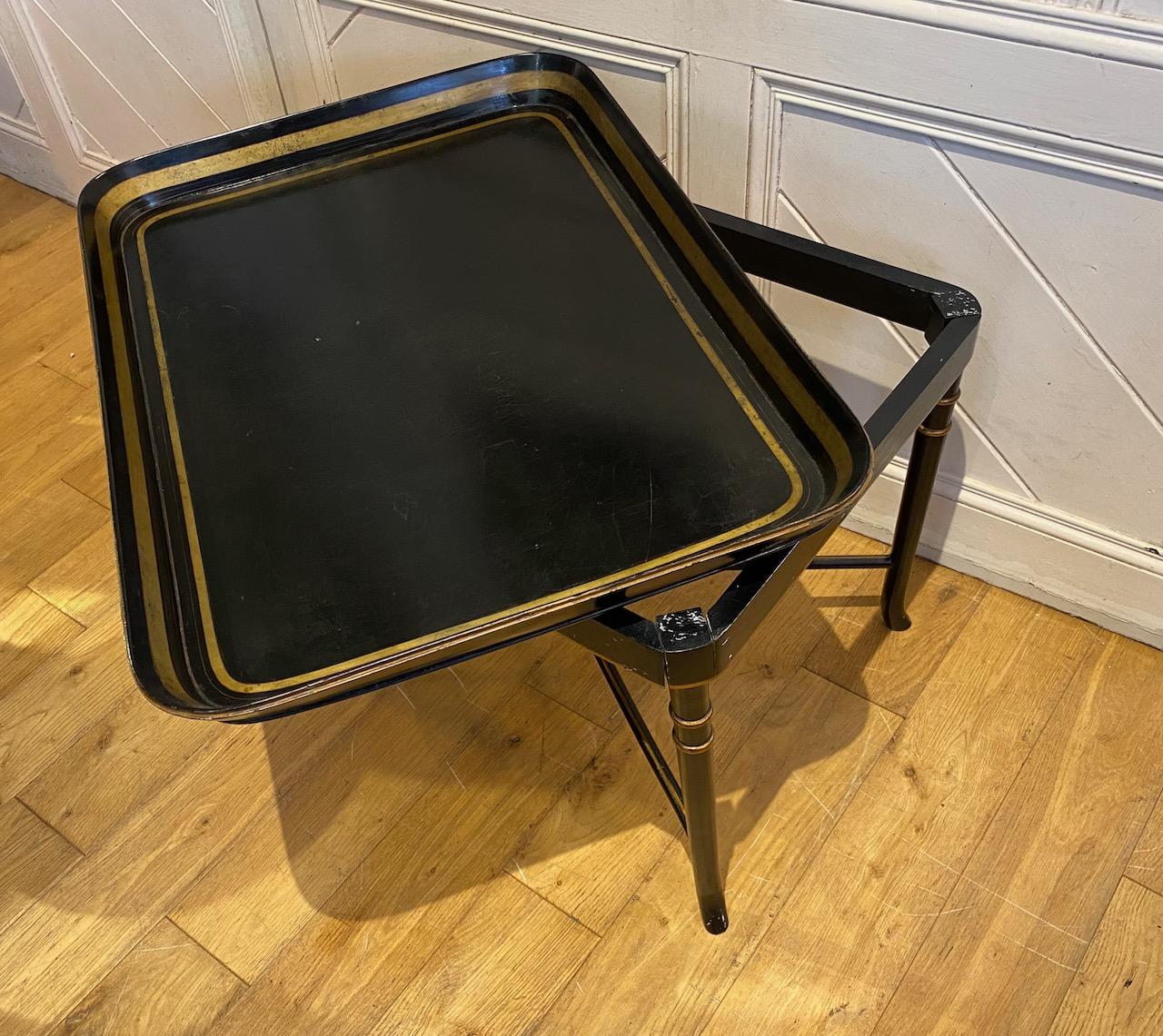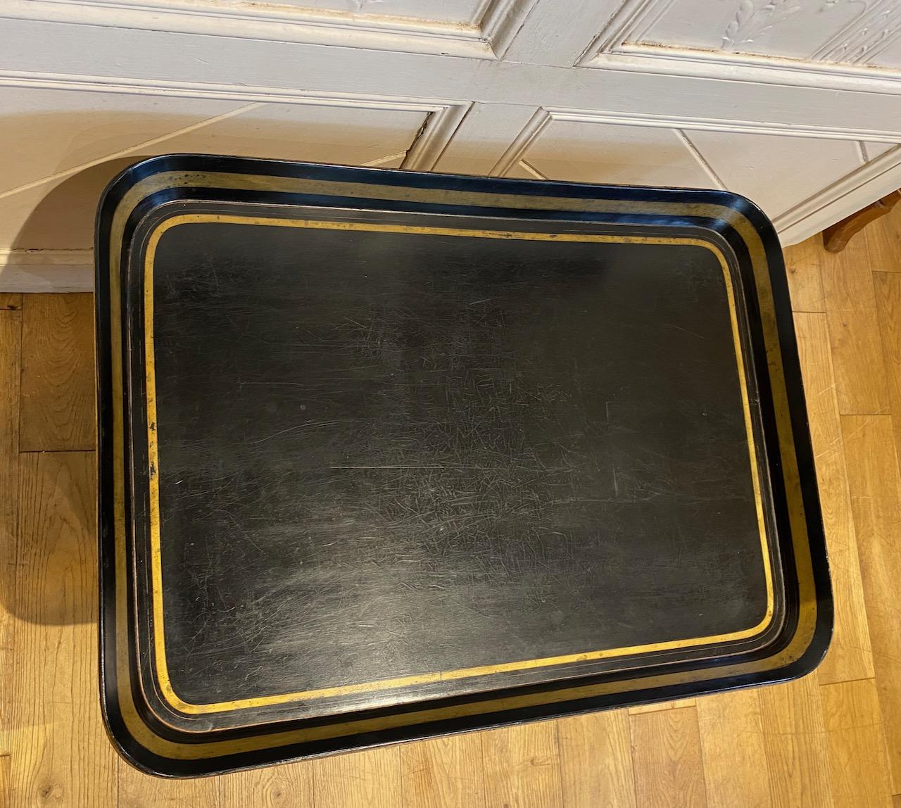 Regency Papiér Tray, of large size and simple decoration, the straight sides with a gold band and double red lines, the bottom with gold band edged in red lines, on a pure black ground. The tray is supported on a modern ebonised stand with turned legs joined by an X framed stretcher.